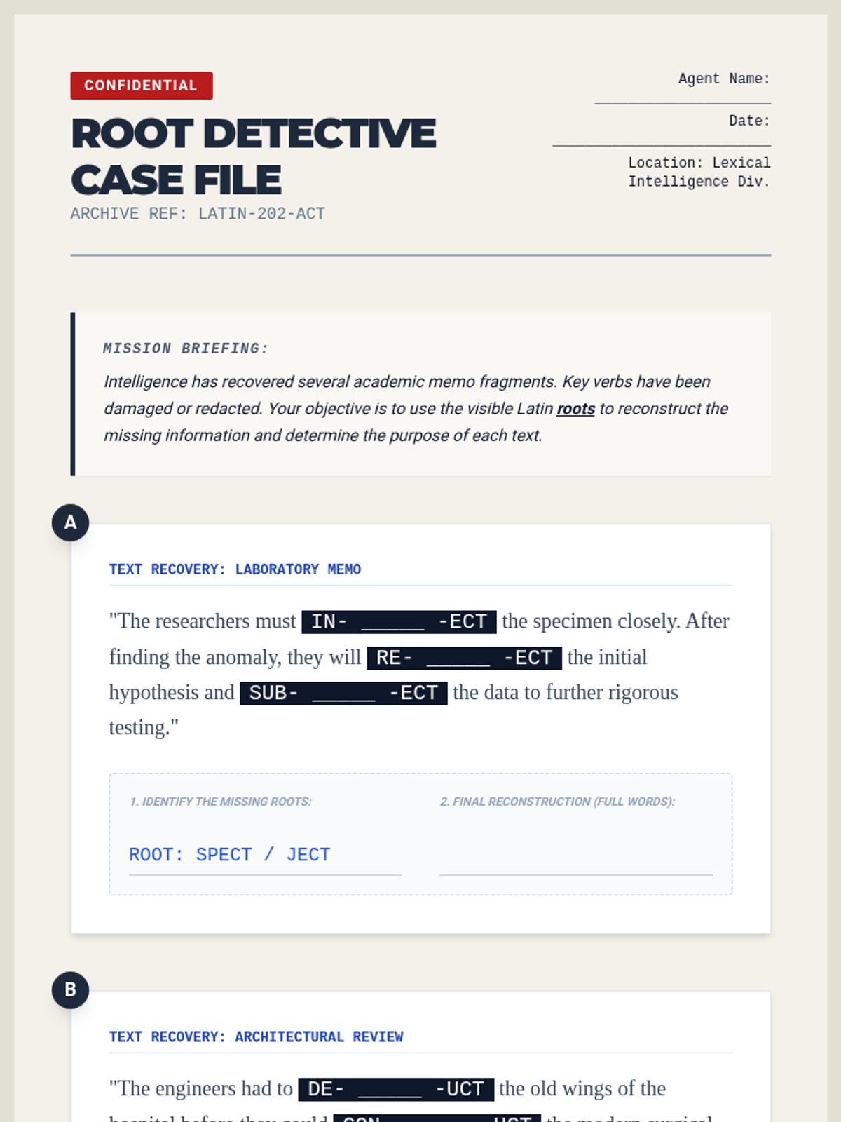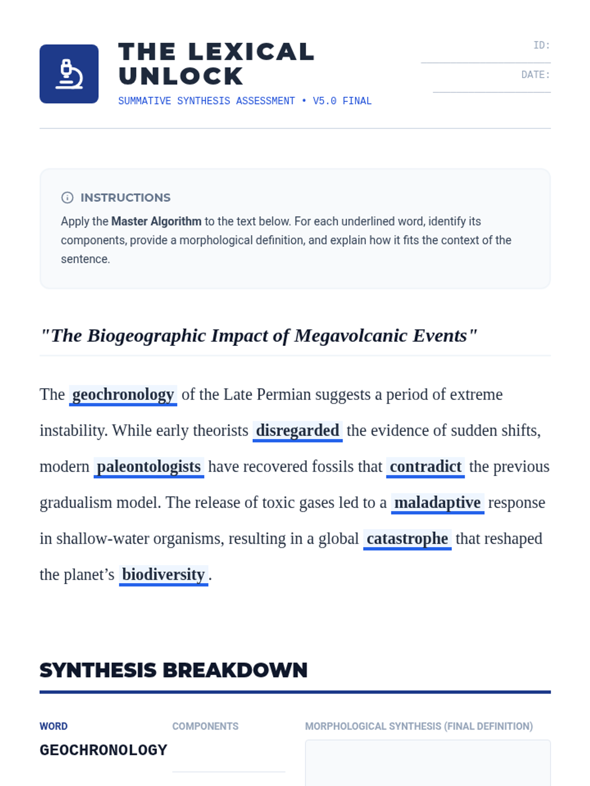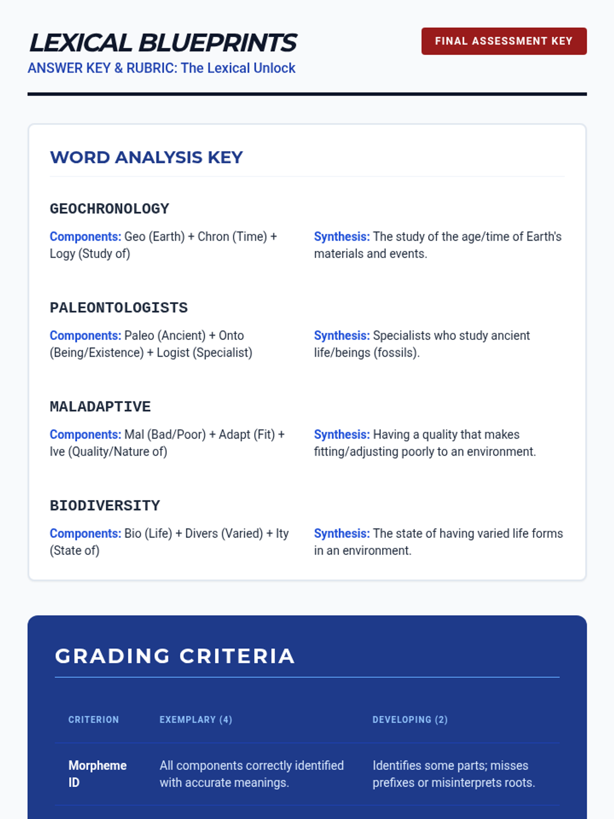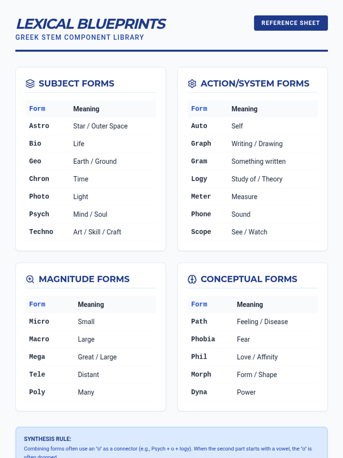 A comprehensive 9th-grade sequence focused on decoding advanced academic vocabulary through the study of Greek and Latin morphology. Students move from basic morpheme identification to complex semantic synthesis, equipping them with tools for independent reading of technical and professional texts.