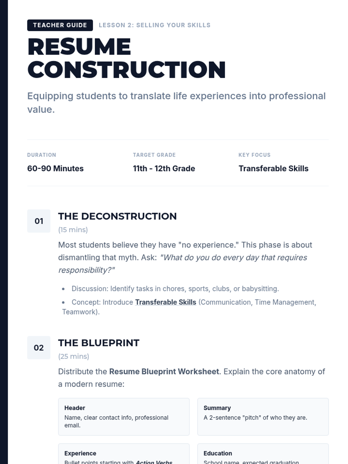 A comprehensive unit designed to prepare students for the transition from high school to adulthood, focusing on post-secondary pathways, resume building, and professional interview skills.