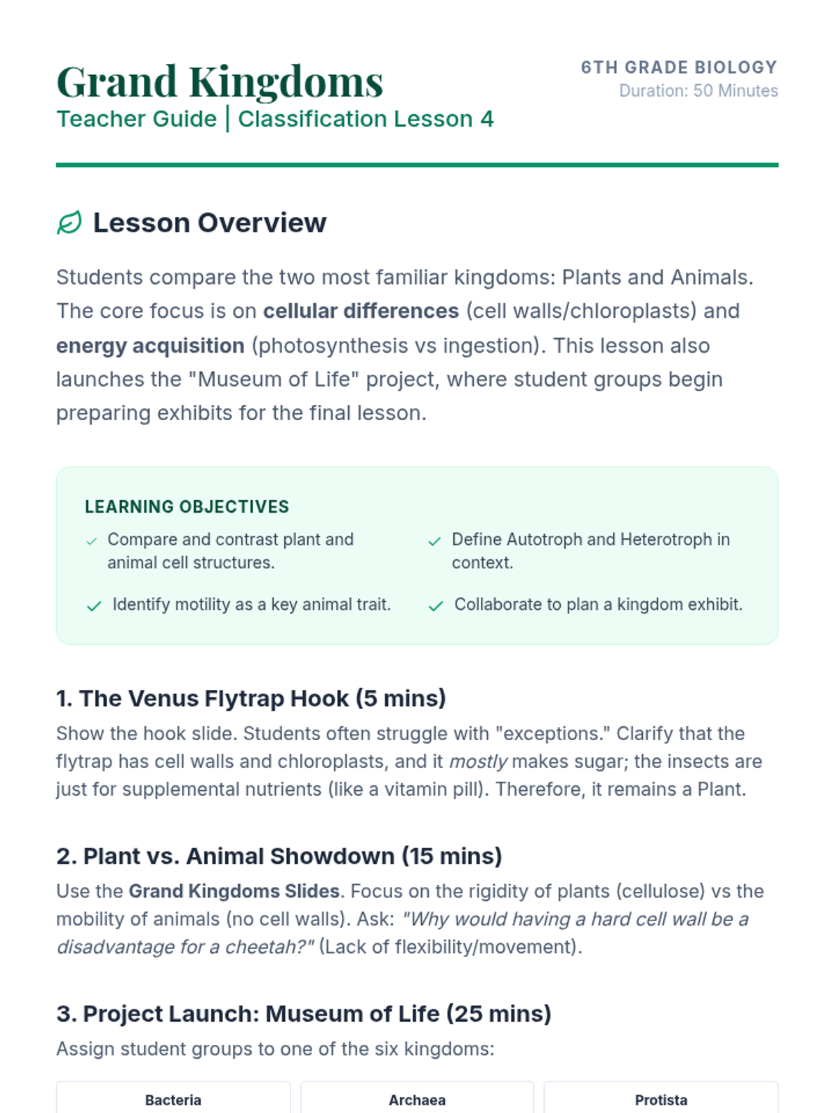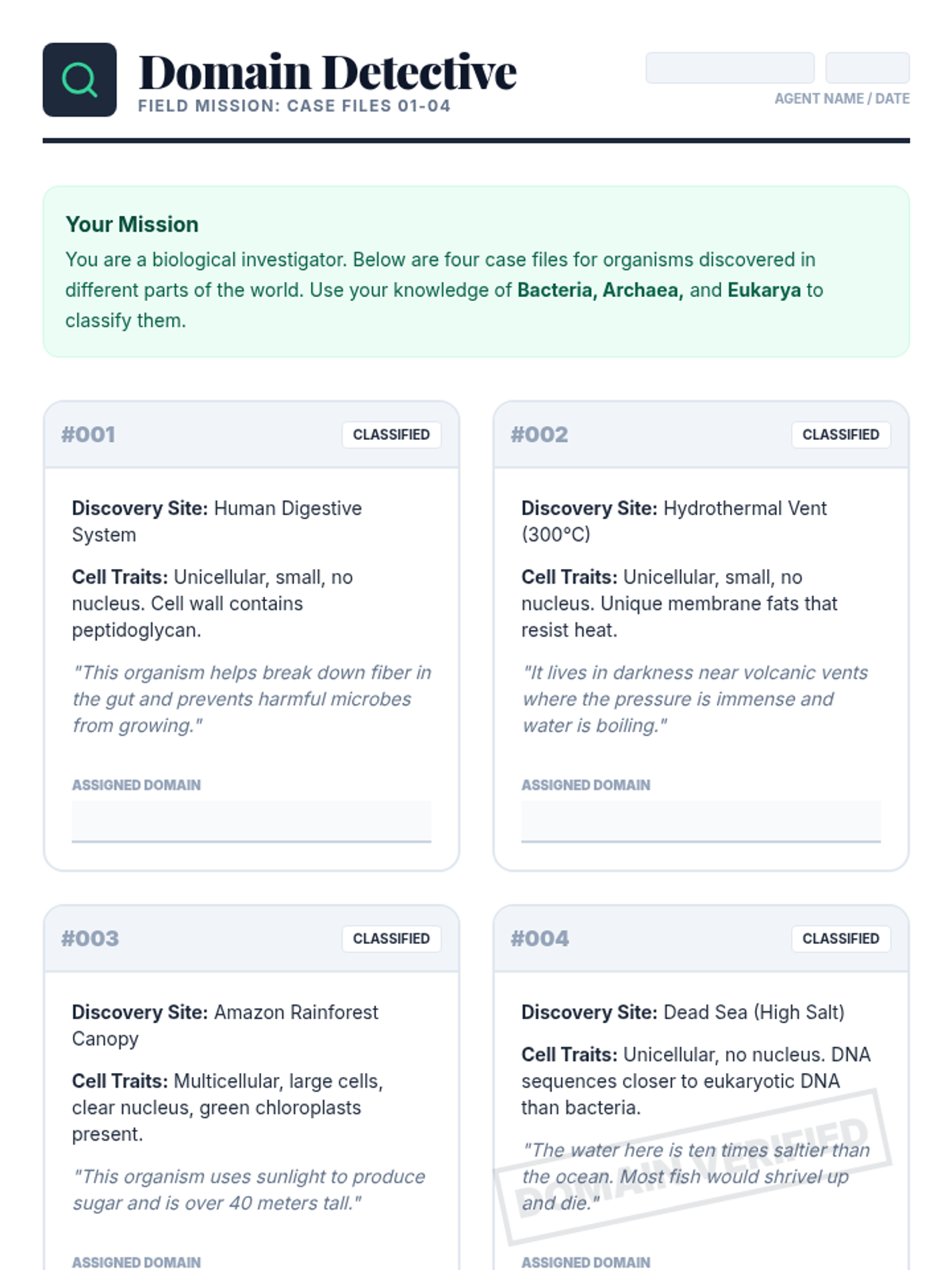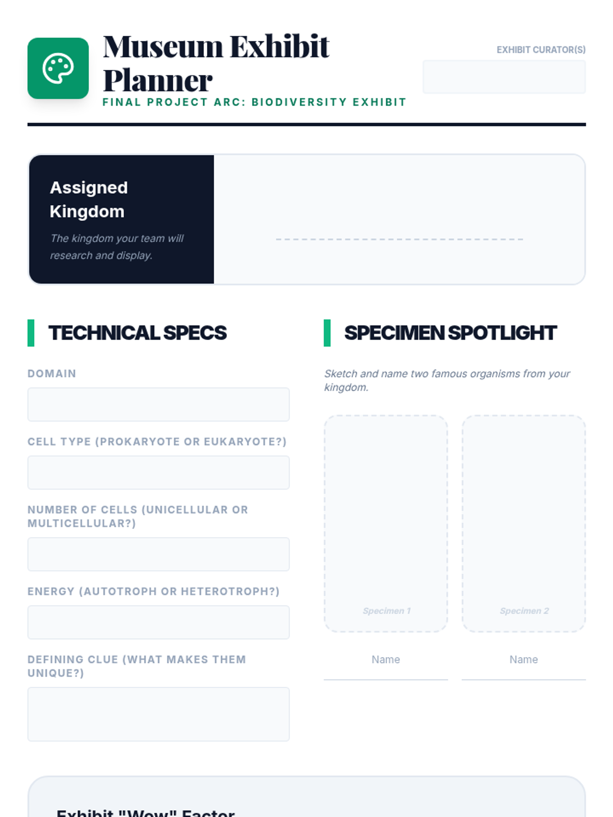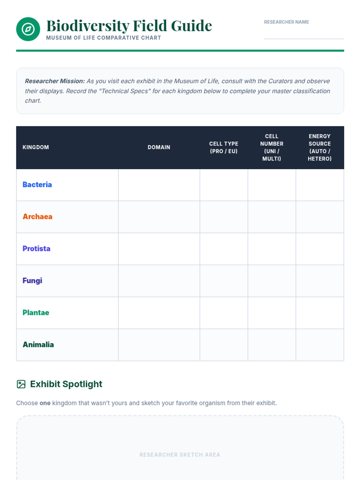 Students dive into the distinct characteristics that define the three Domains and six Kingdoms of life through a research-based project arc. The sequence emphasizes cellular structure and energy acquisition methods, culminating in a 'Museum of Life' exhibit.