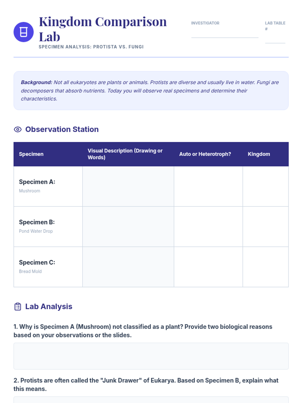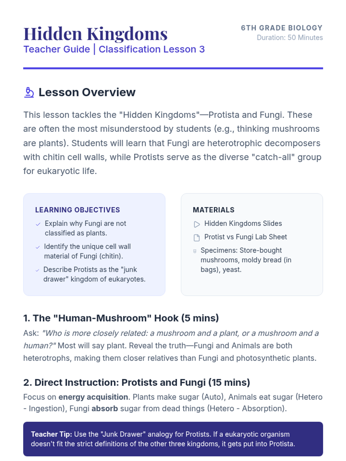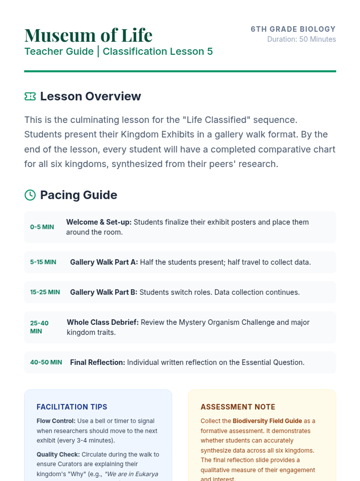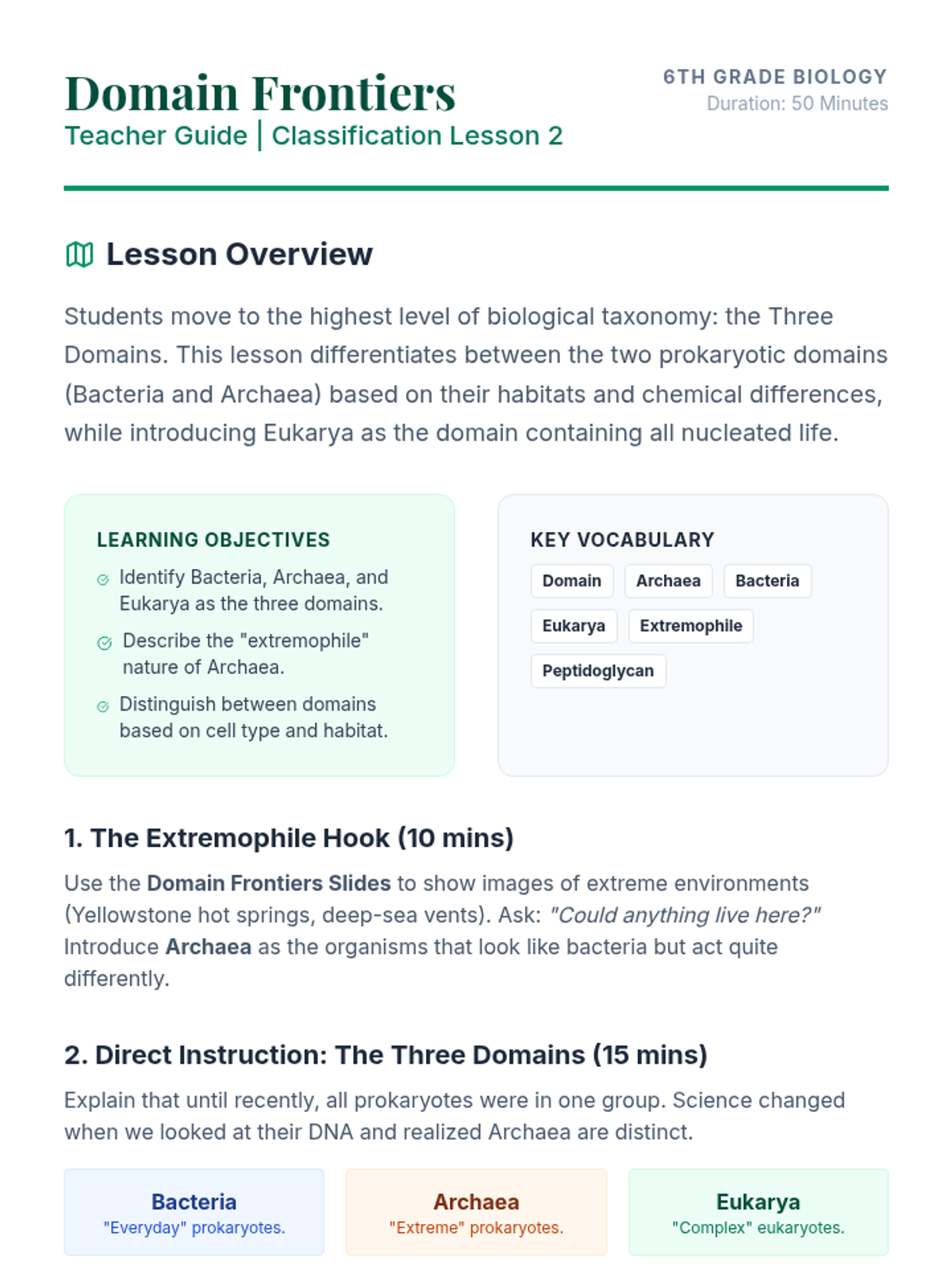 Students dive into the distinct characteristics that define the three Domains and six Kingdoms of life through a research-based project arc. The sequence emphasizes cellular structure and energy acquisition methods, culminating in a 'Museum of Life' exhibit.