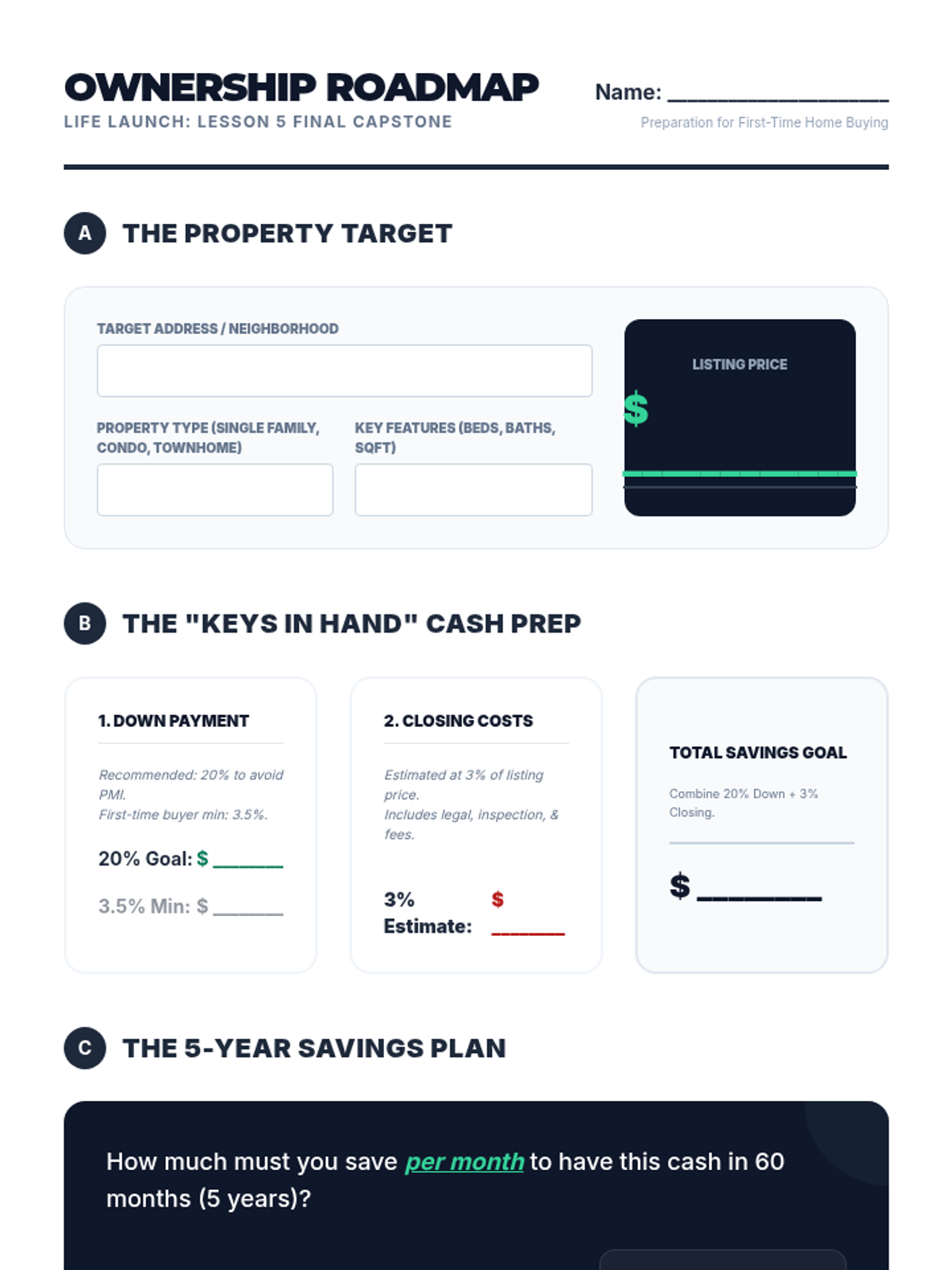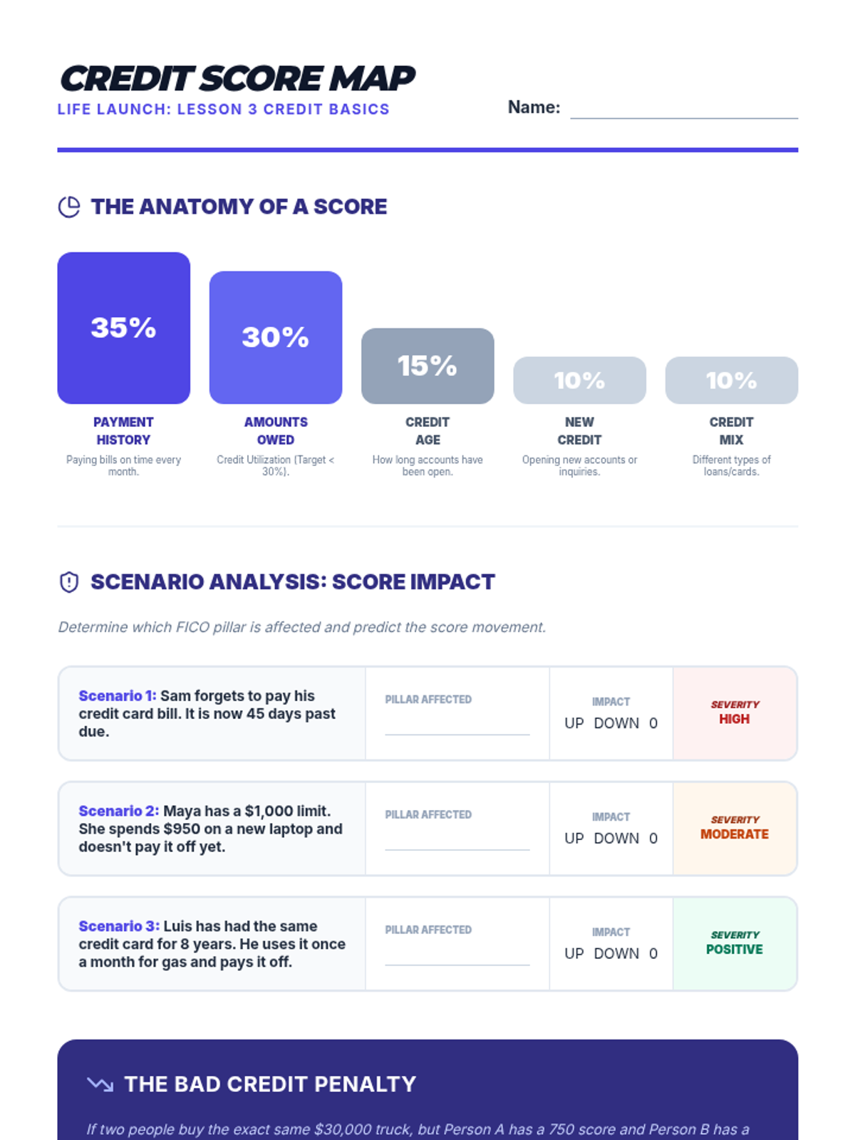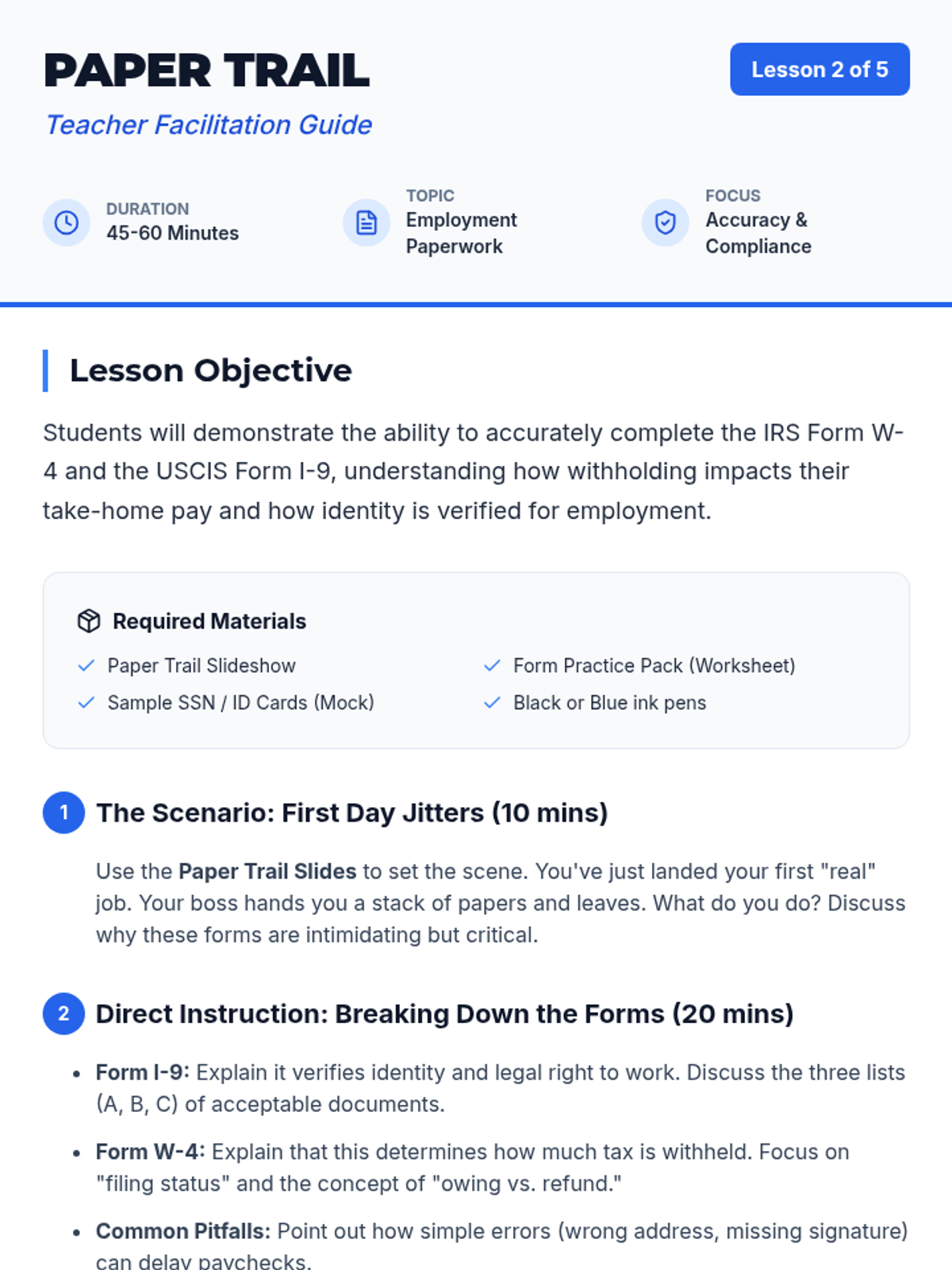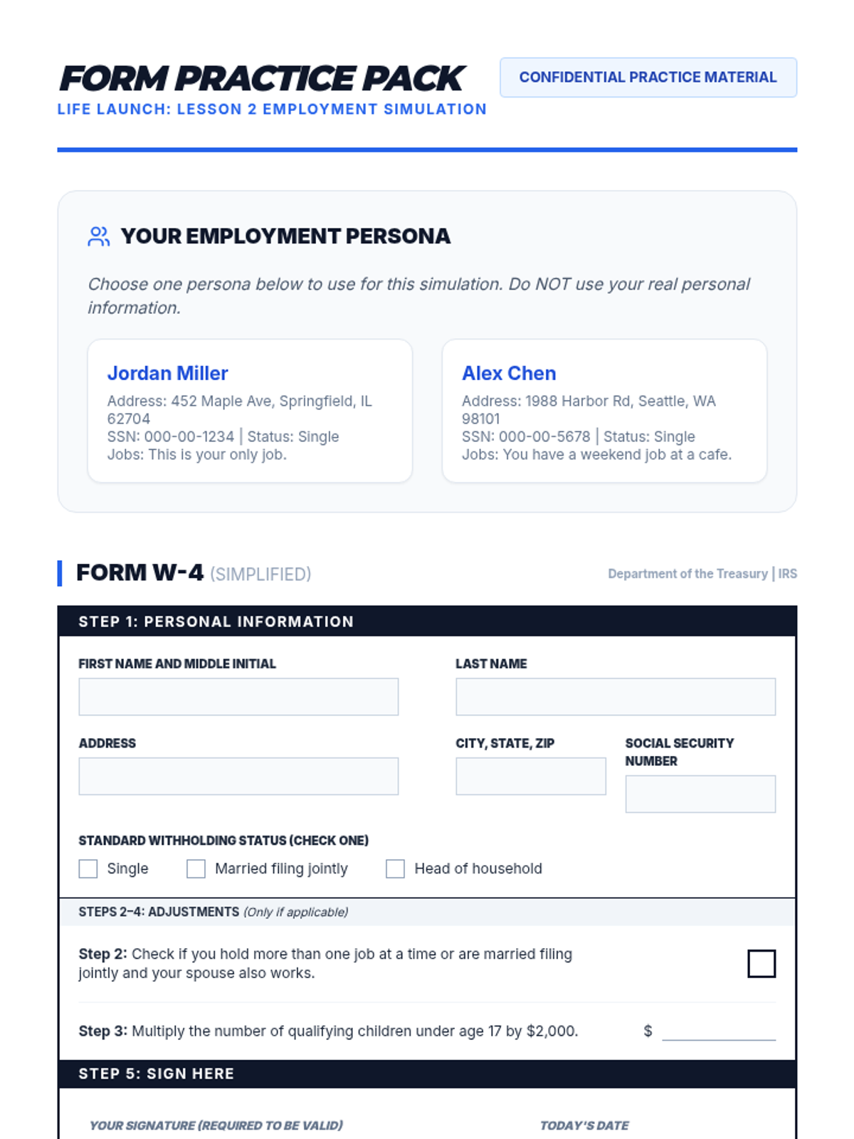A comprehensive financial literacy unit designed to prepare students for the realities of living independently. This sequence covers everything from initial employment paperwork and credit management to the major life milestones of buying a car and a home.