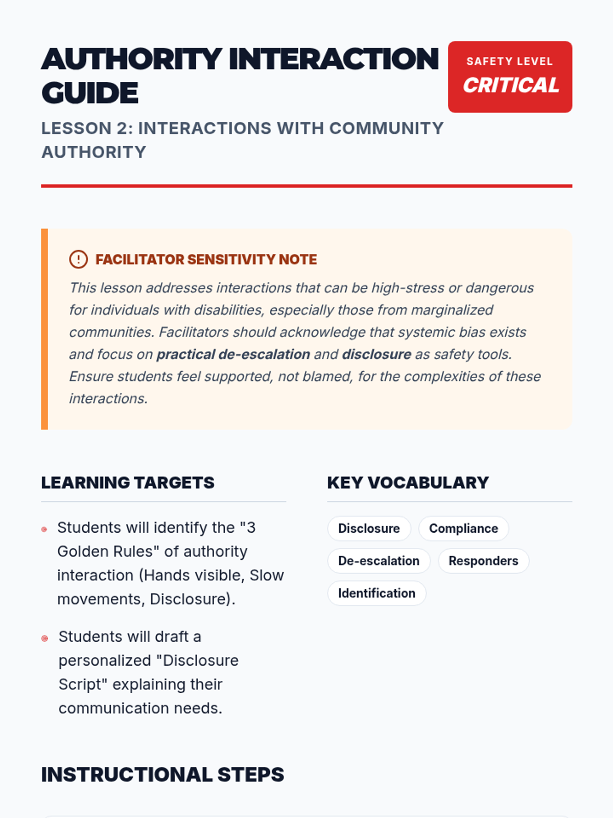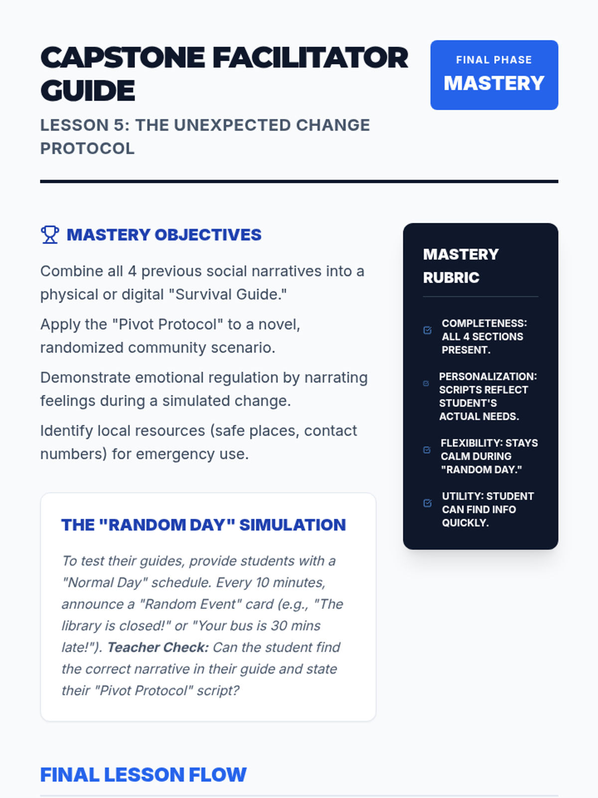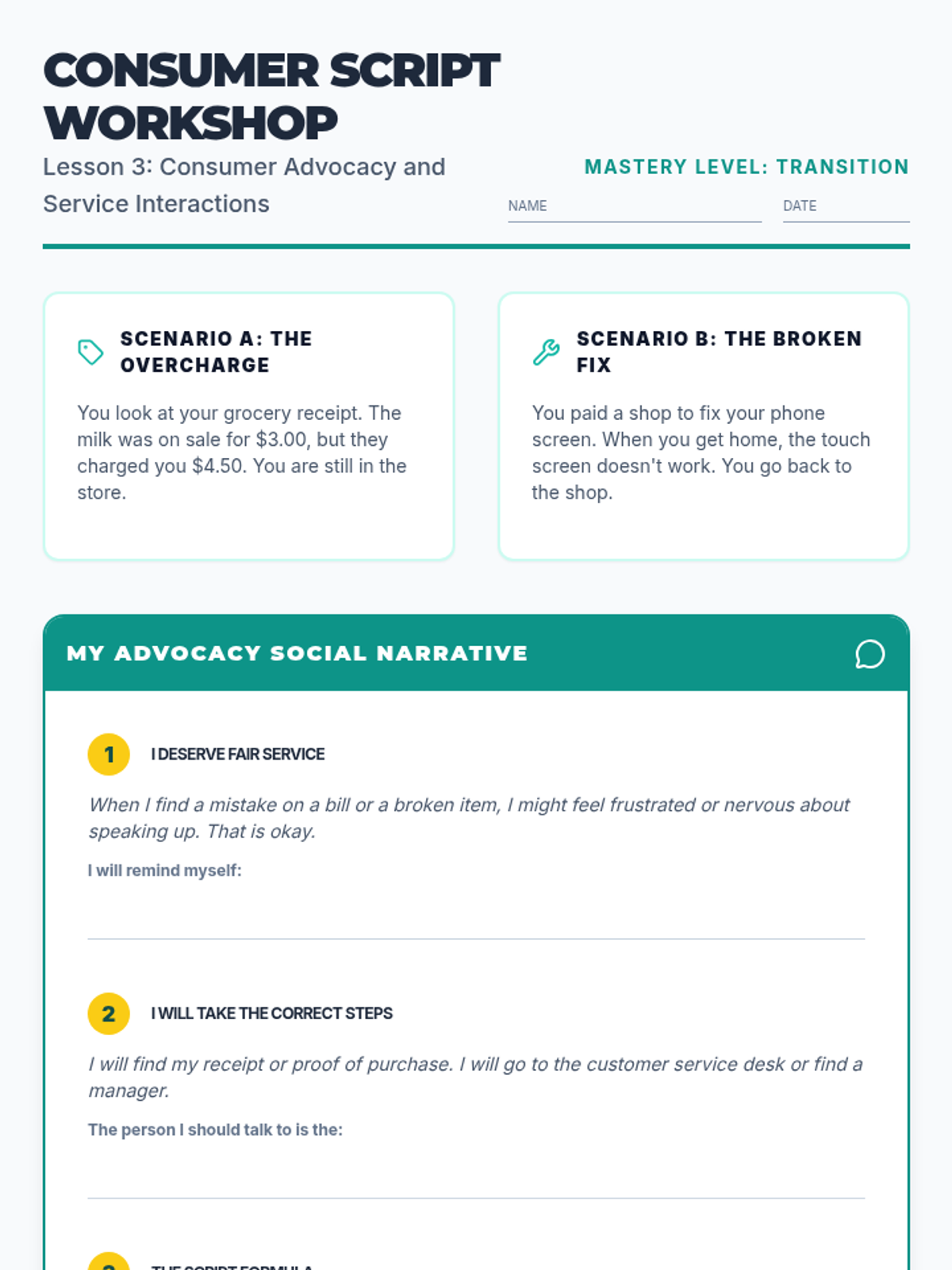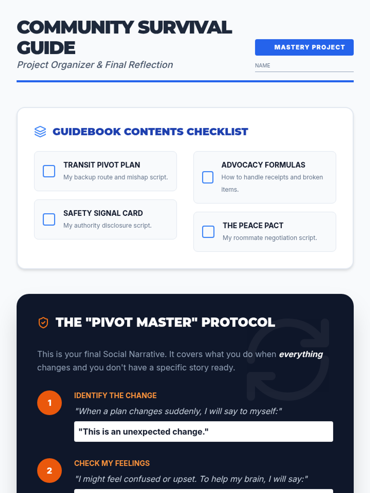 A 12th-grade Special Education sequence focused on transition-to-adulthood social stories. Students learn to create personal narratives for navigating transportation failures, authority interactions, consumer rights, roommate conflicts, and general community unpredictability to foster independence and safety.