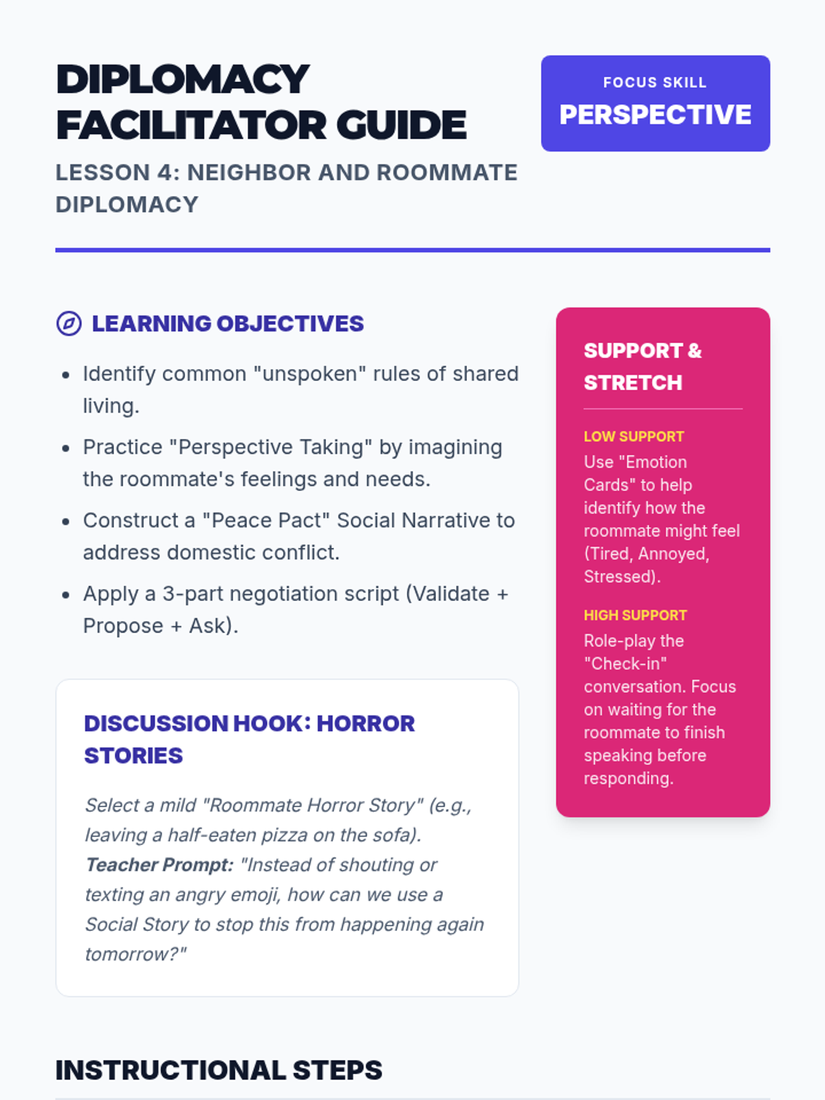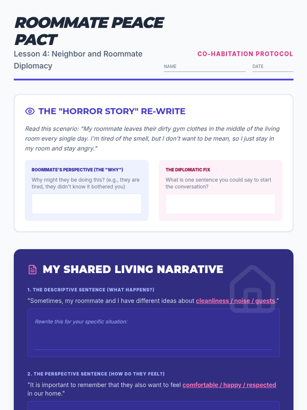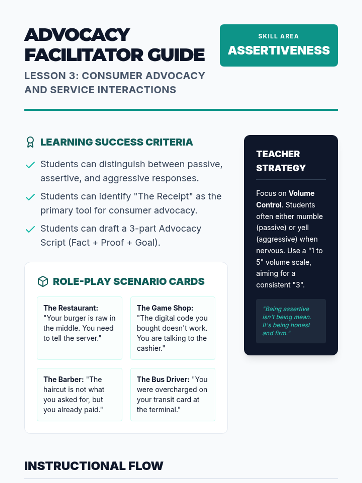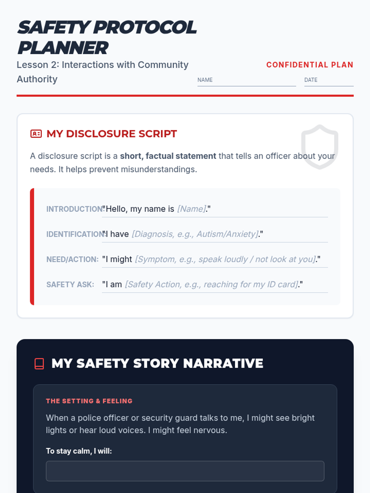 A 12th-grade Special Education sequence focused on transition-to-adulthood social stories. Students learn to create personal narratives for navigating transportation failures, authority interactions, consumer rights, roommate conflicts, and general community unpredictability to foster independence and safety.