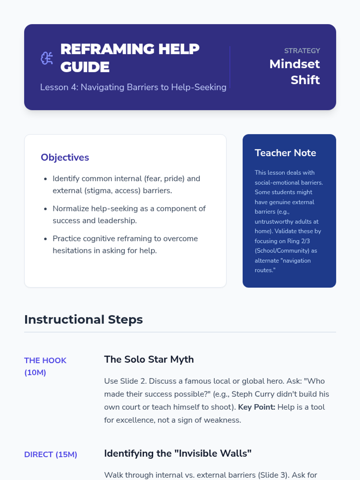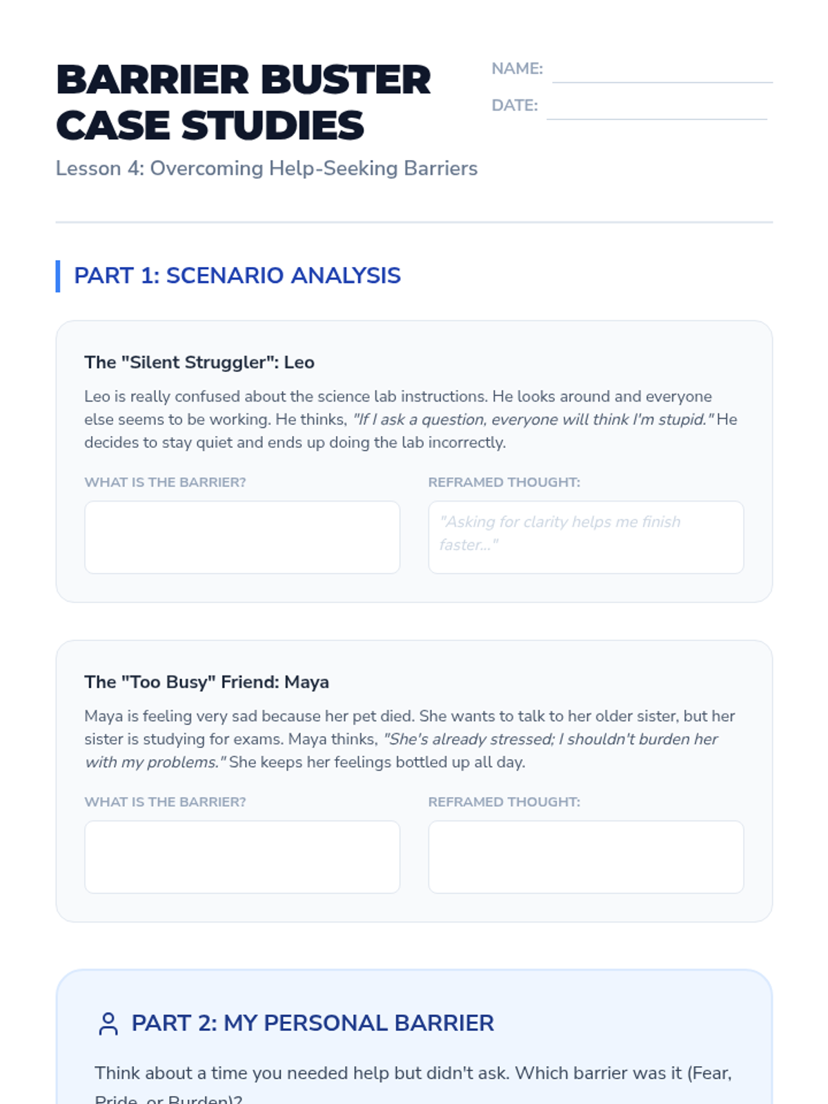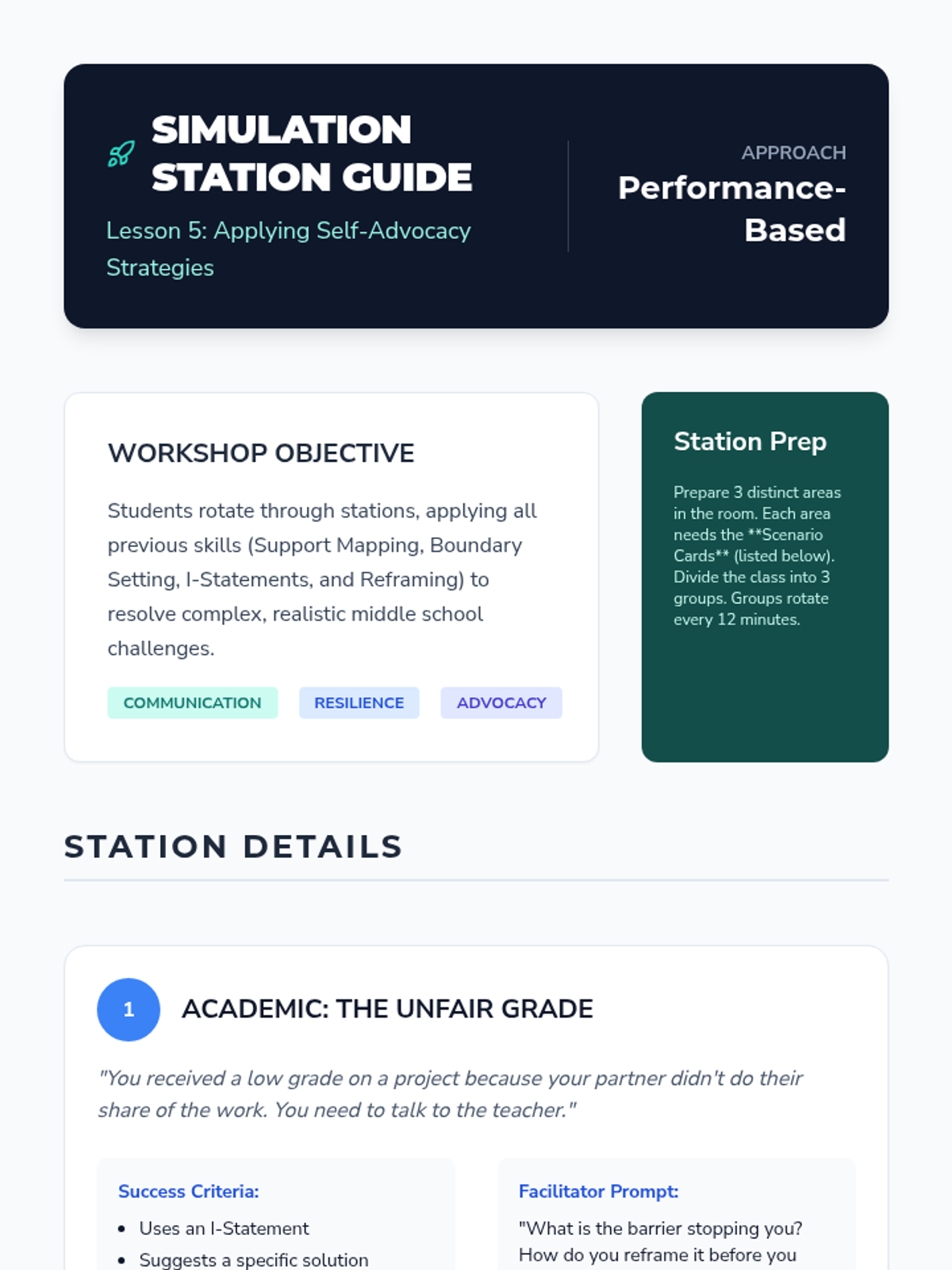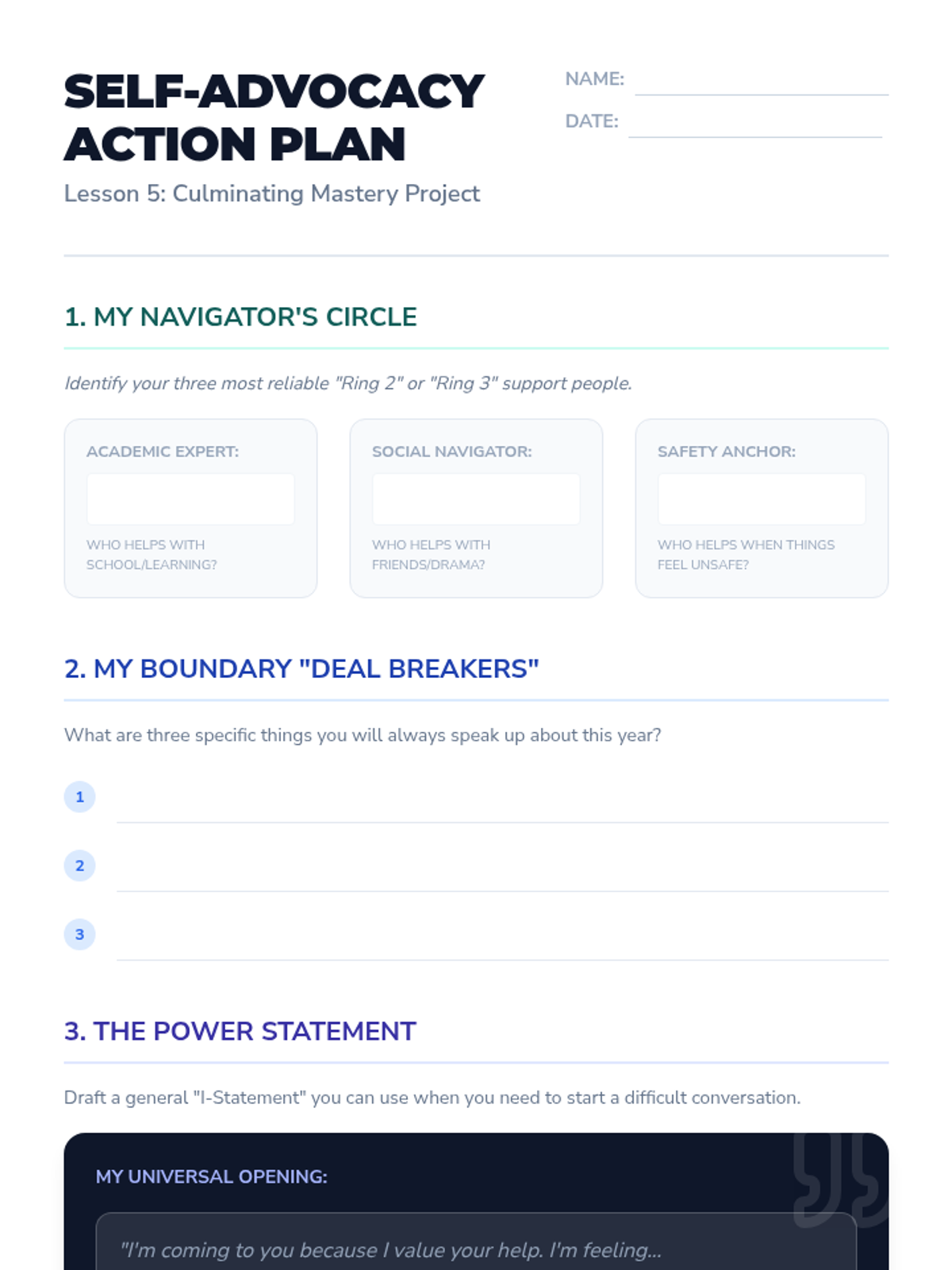 A 5-lesson unit for 7th graders focused on identifying support systems, setting boundaries, and mastering assertive communication. Students develop a 'Life Navigator' toolkit to advocate for their academic, emotional, and social needs.