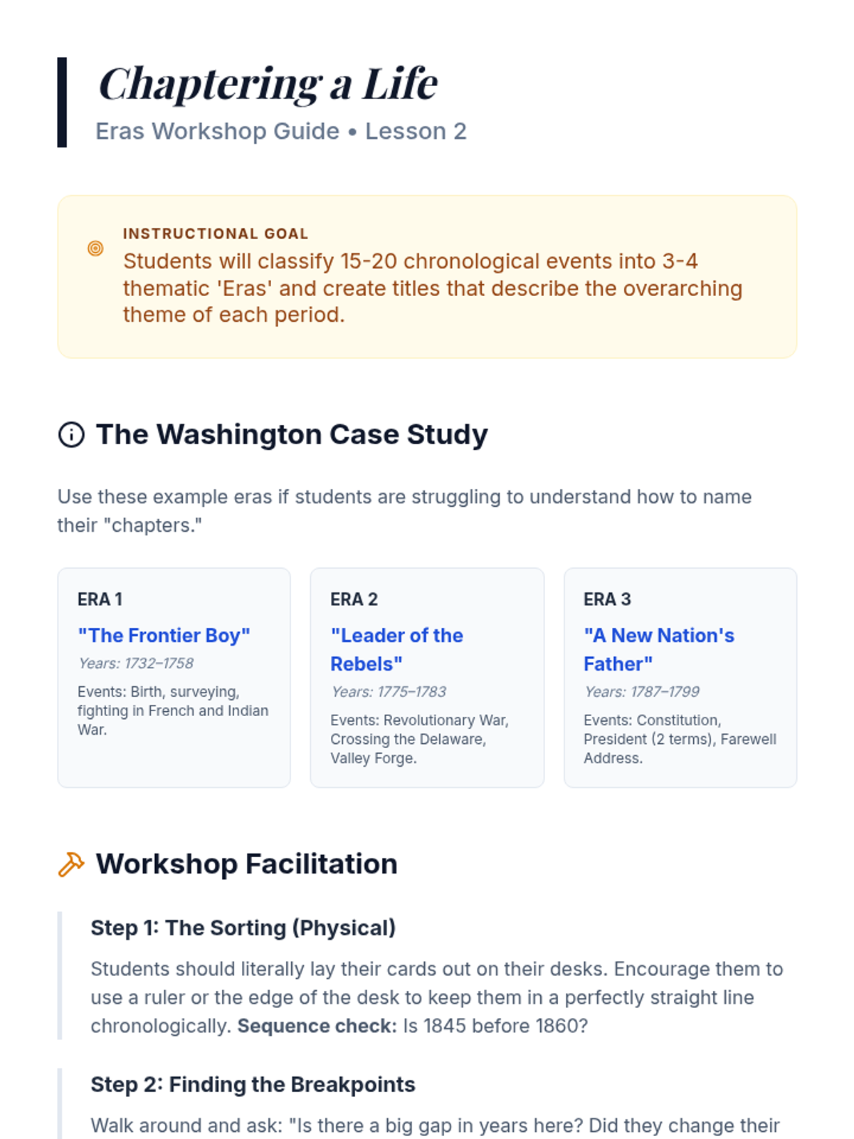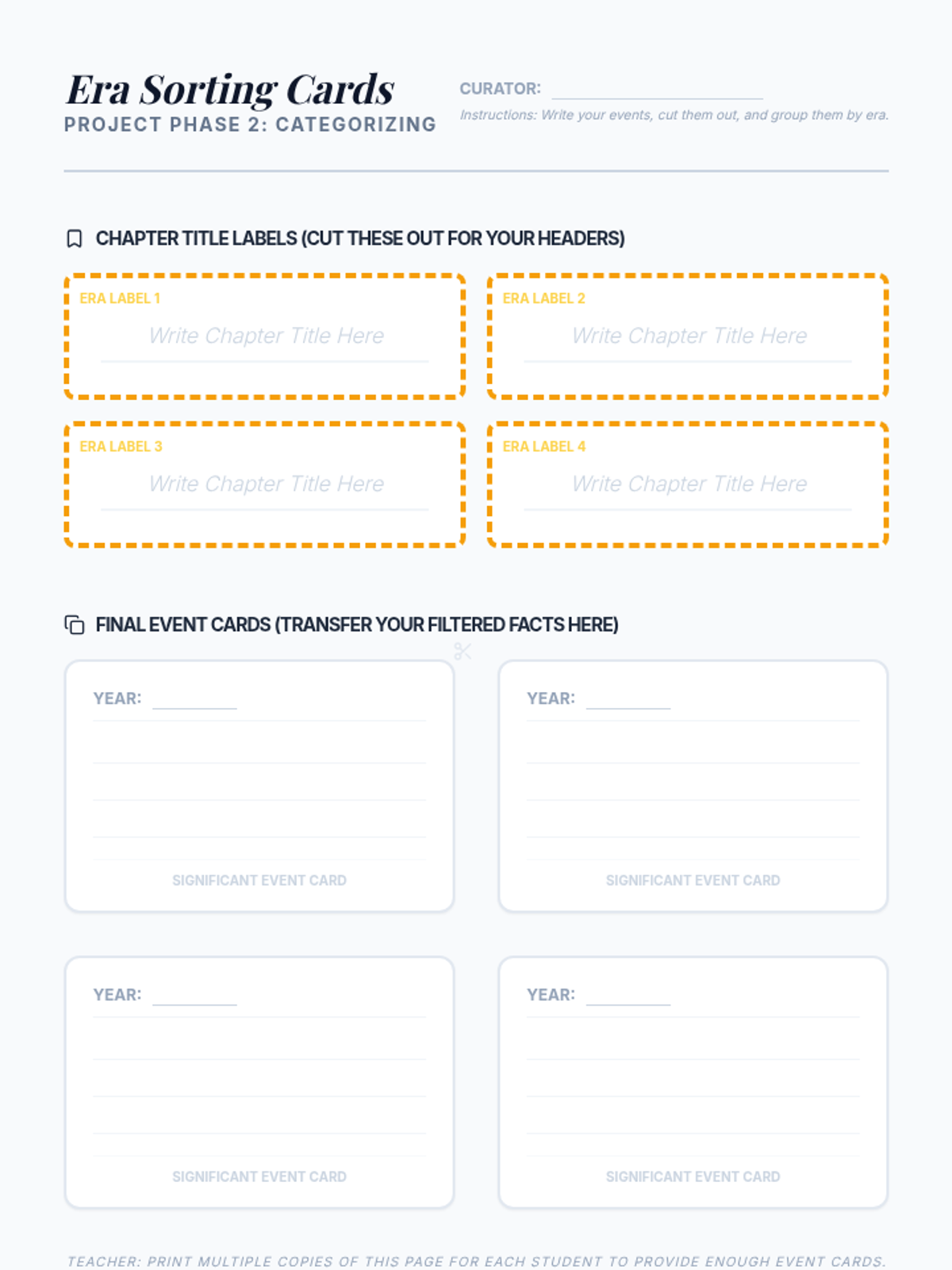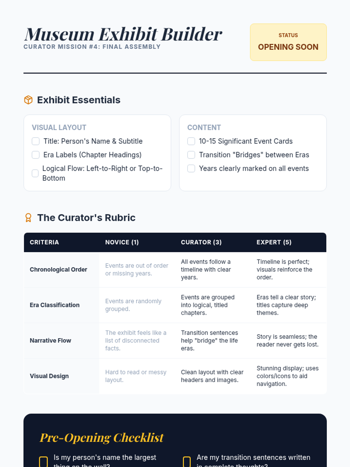 A project-based unit where 5th-grade students learn to research, filter, and organize the events of a historical figure's life into meaningful 'eras' for a final museum-style exhibit. Students develop skills in chronological ordering, thematic grouping, and narrative flow.