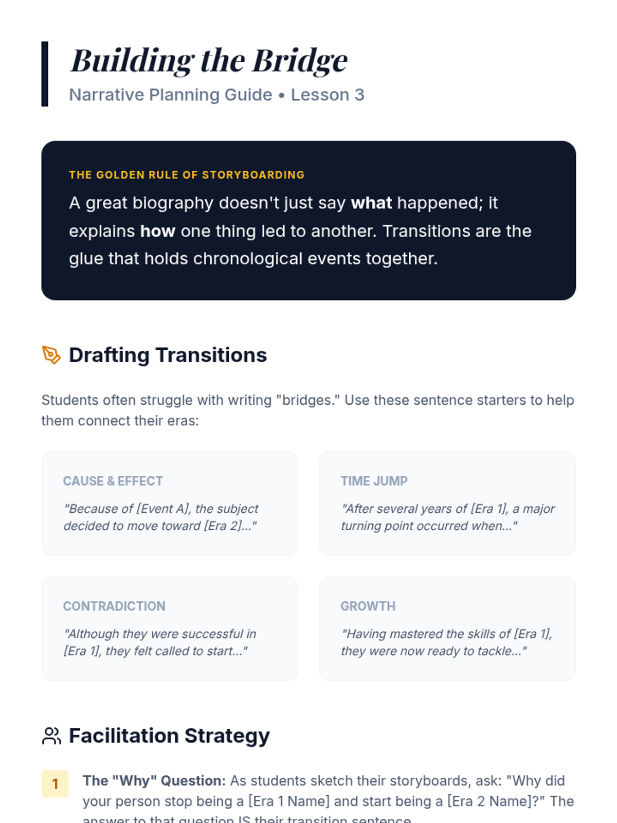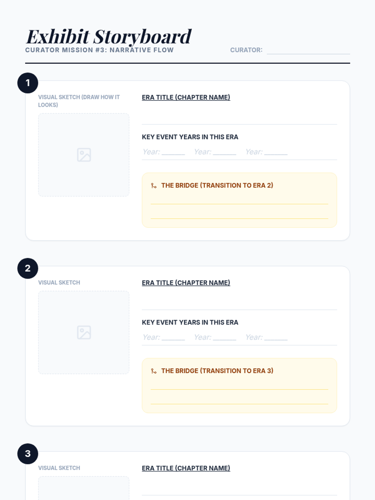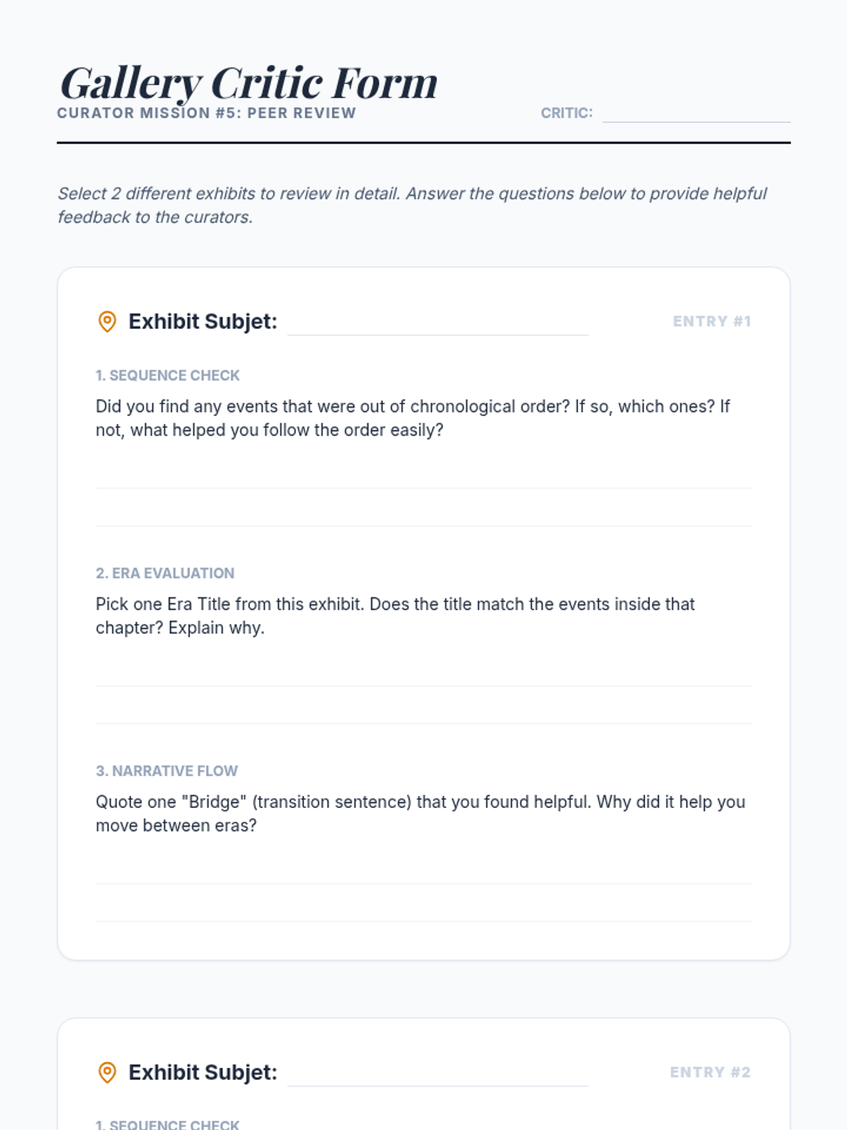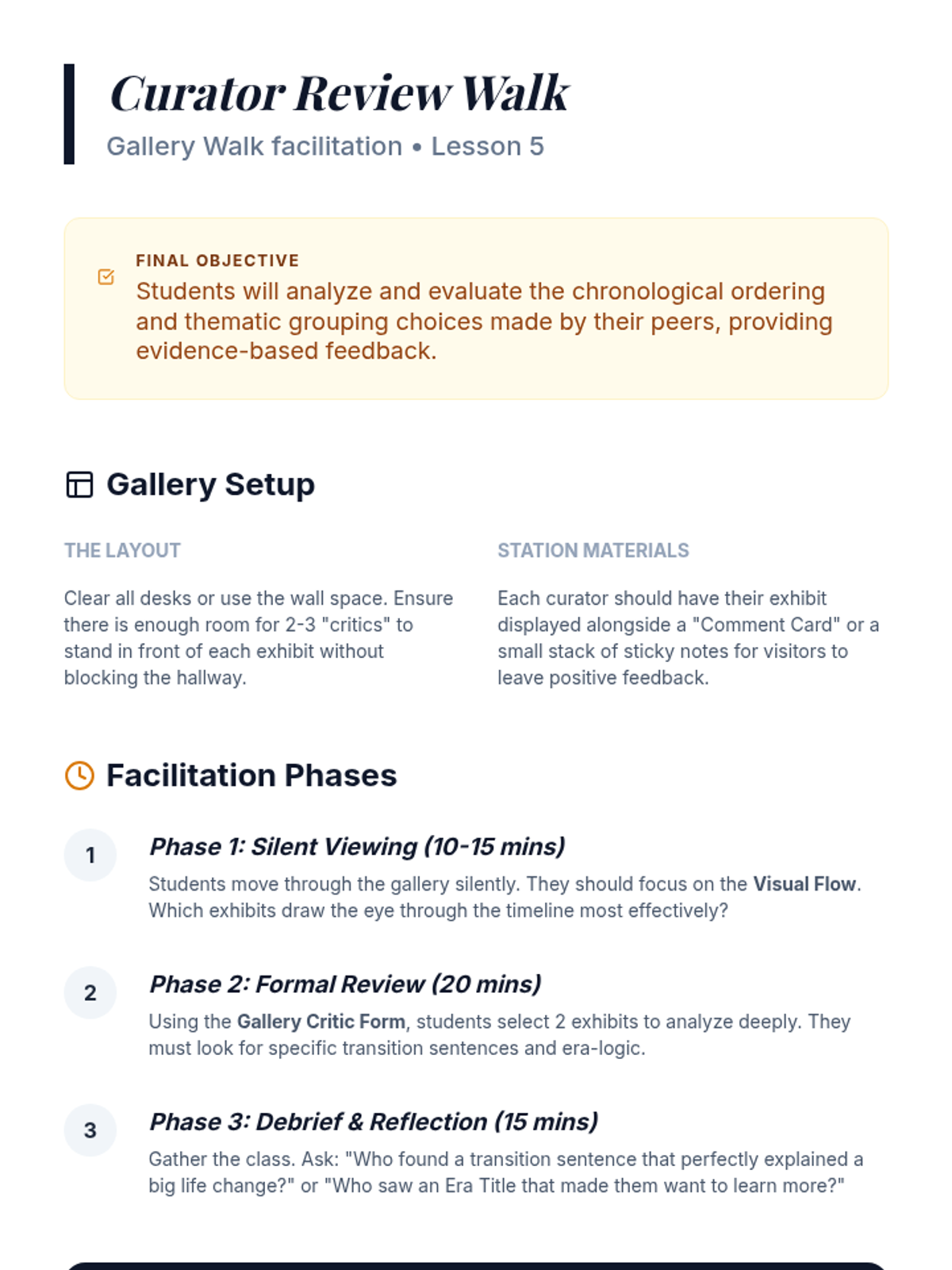 A project-based unit where 5th-grade students learn to research, filter, and organize the events of a historical figure's life into meaningful 'eras' for a final museum-style exhibit. Students develop skills in chronological ordering, thematic grouping, and narrative flow.