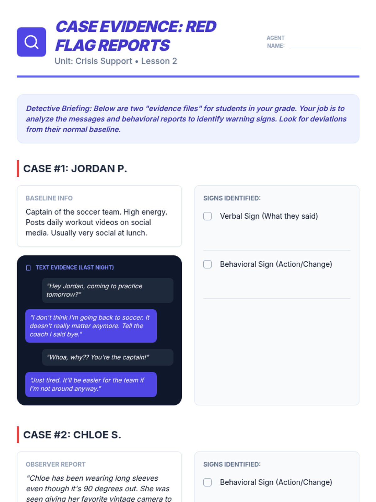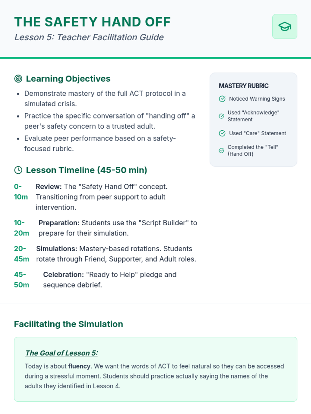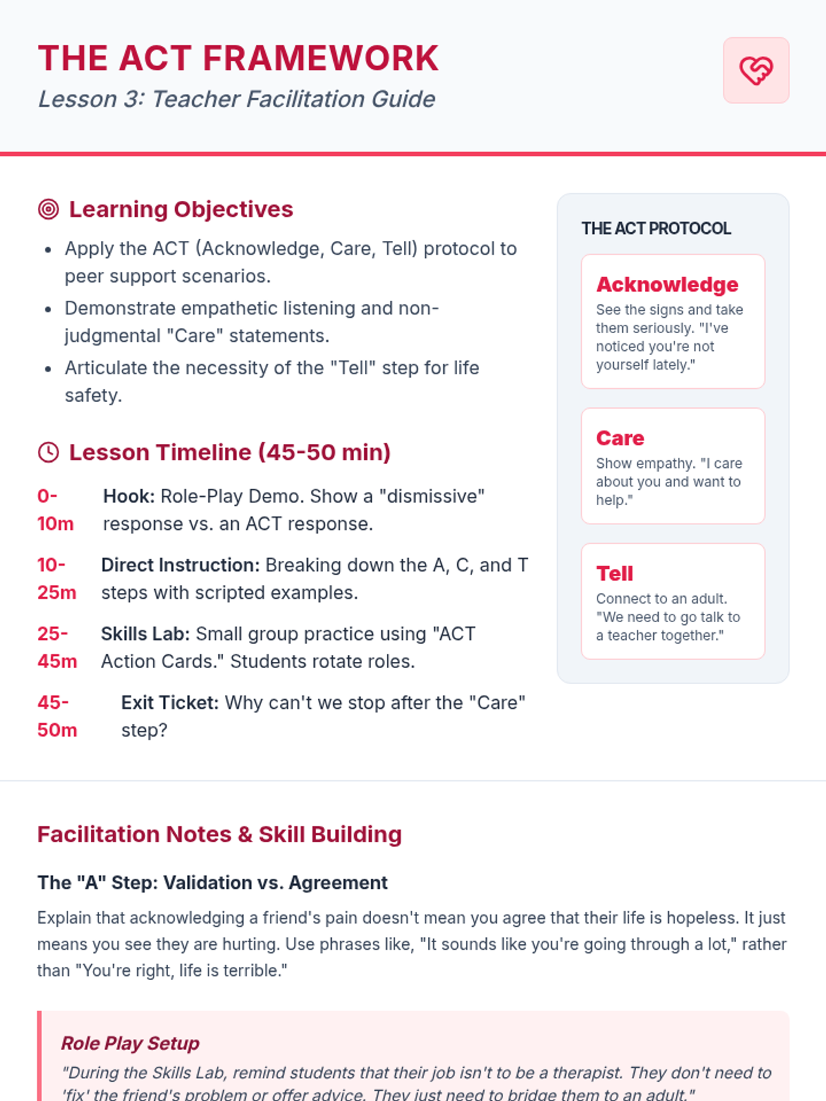 A comprehensive 5-lesson sequence for 7th-grade students focused on recognizing mental health warning signs and practicing the ACT (Acknowledge, Care, Tell) framework. Students transition from understanding mental health as a spectrum to identifying specific red flags and overcoming barriers to reporting concerns to trusted adults.
