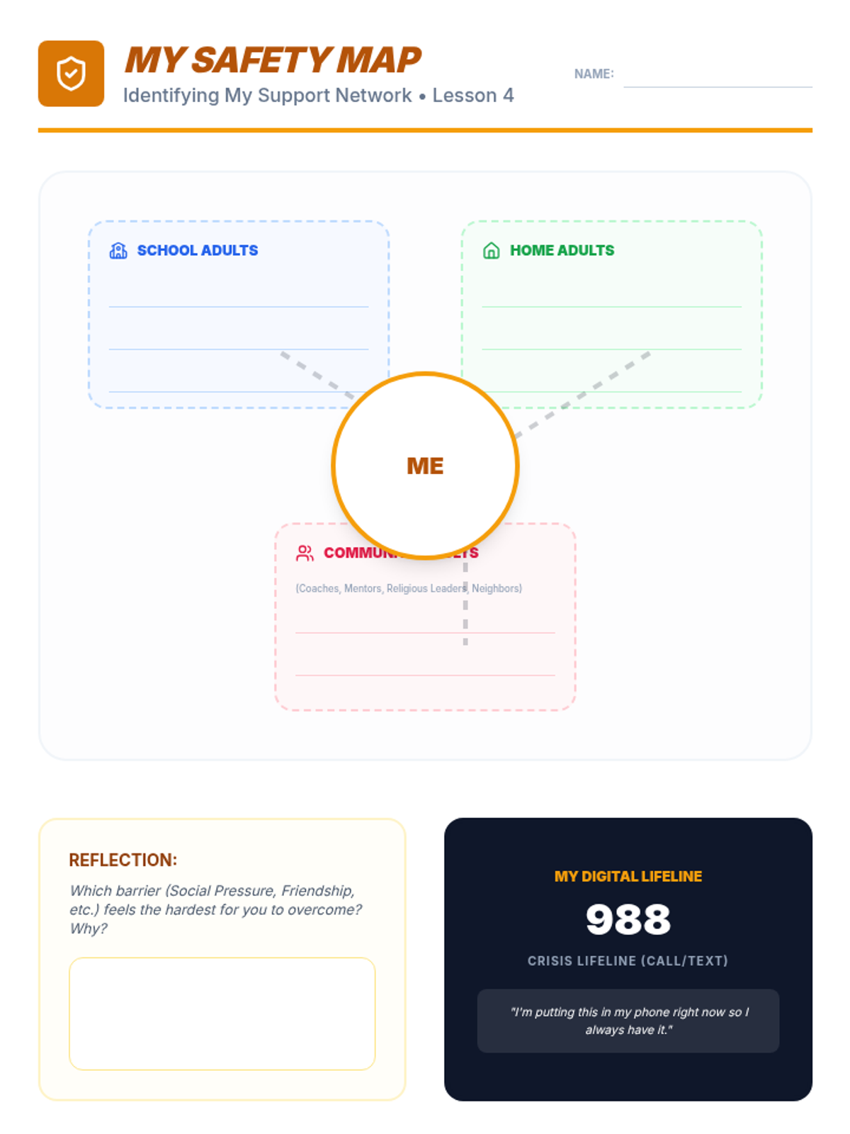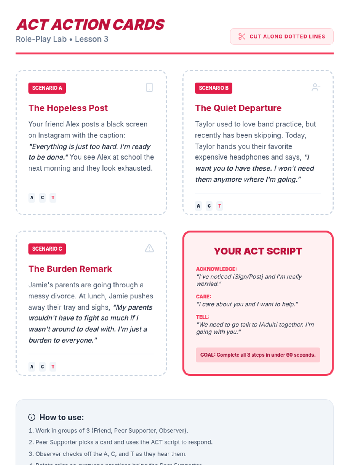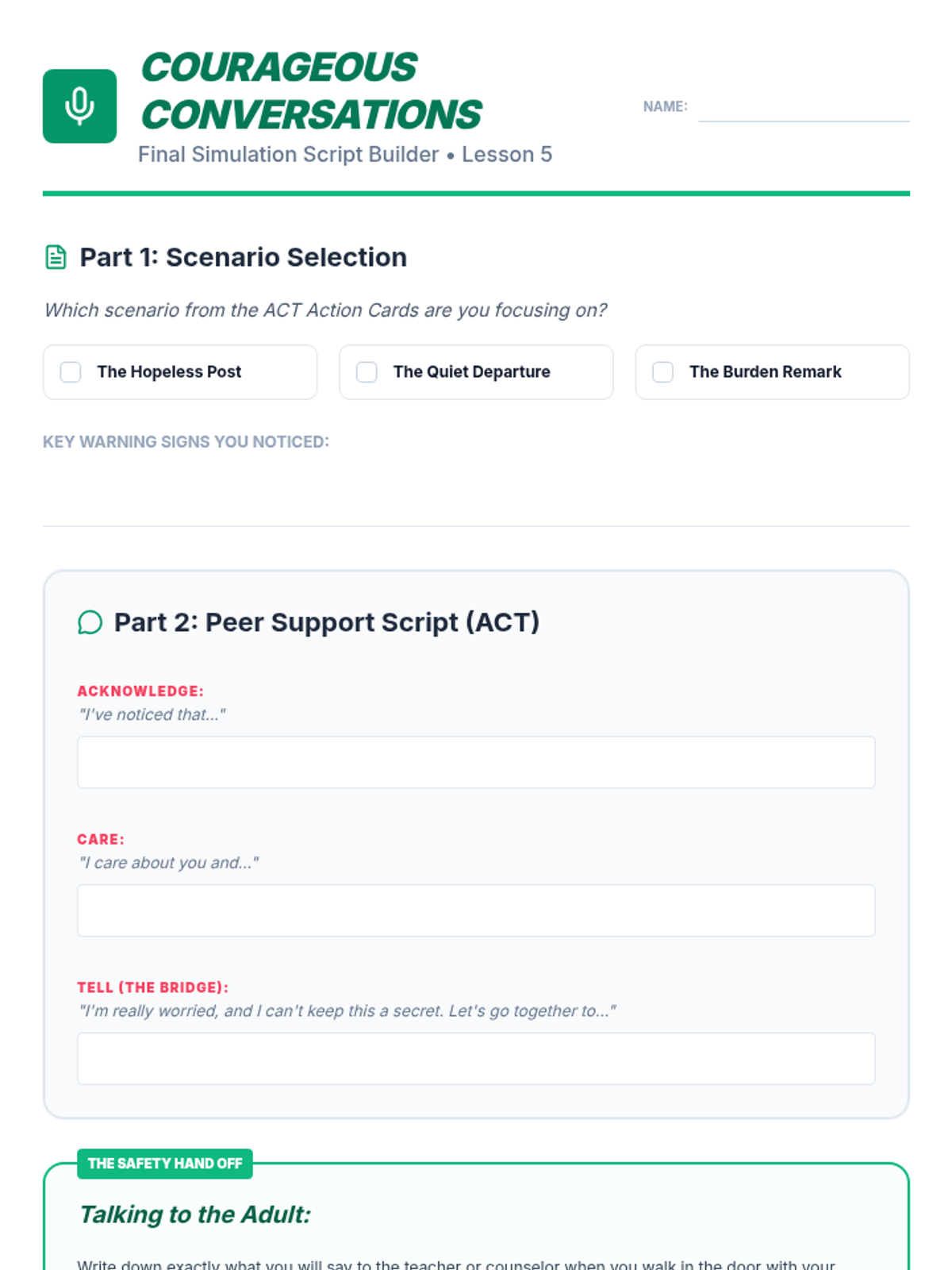 A comprehensive 5-lesson sequence for 7th-grade students focused on recognizing mental health warning signs and practicing the ACT (Acknowledge, Care, Tell) framework. Students transition from understanding mental health as a spectrum to identifying specific red flags and overcoming barriers to reporting concerns to trusted adults.