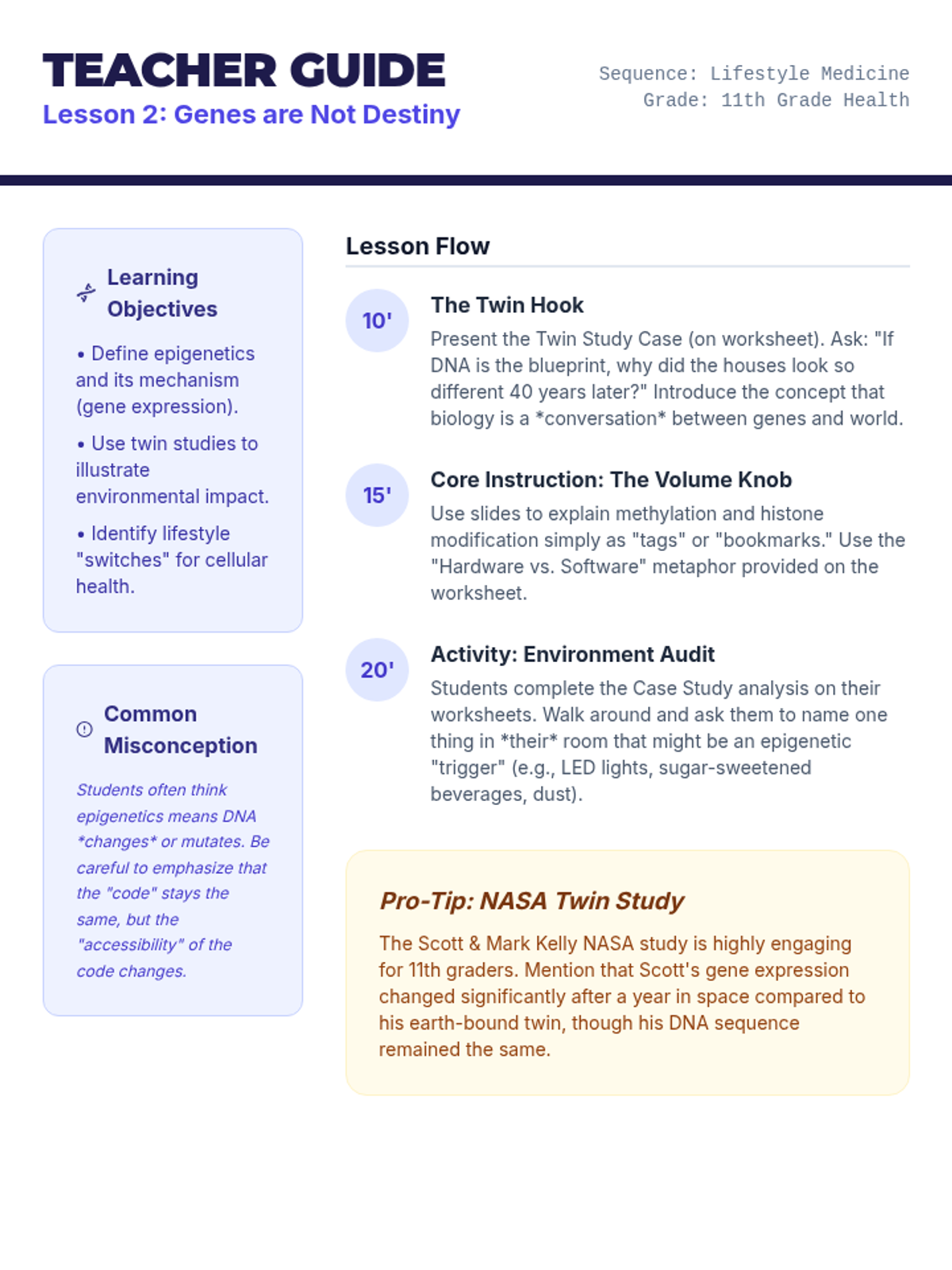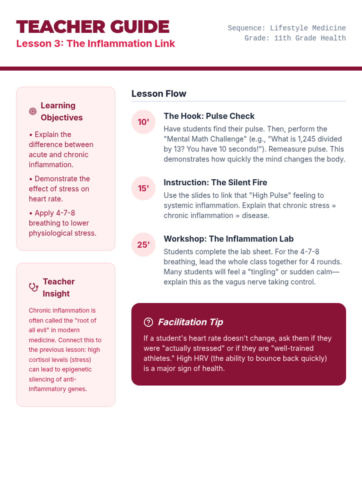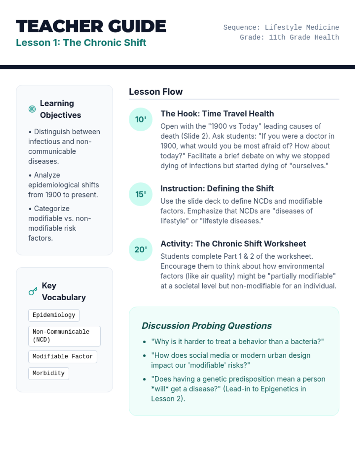 This 11th-grade health sequence explores lifestyle medicine as a primary tool for chronic disease prevention. Students investigate the shift from infectious to non-communicable diseases, the science of epigenetics, the physiological impact of stress and inflammation, the critical role of sleep, and finally design evidence-based personal health blueprints to mitigate genetic risks.