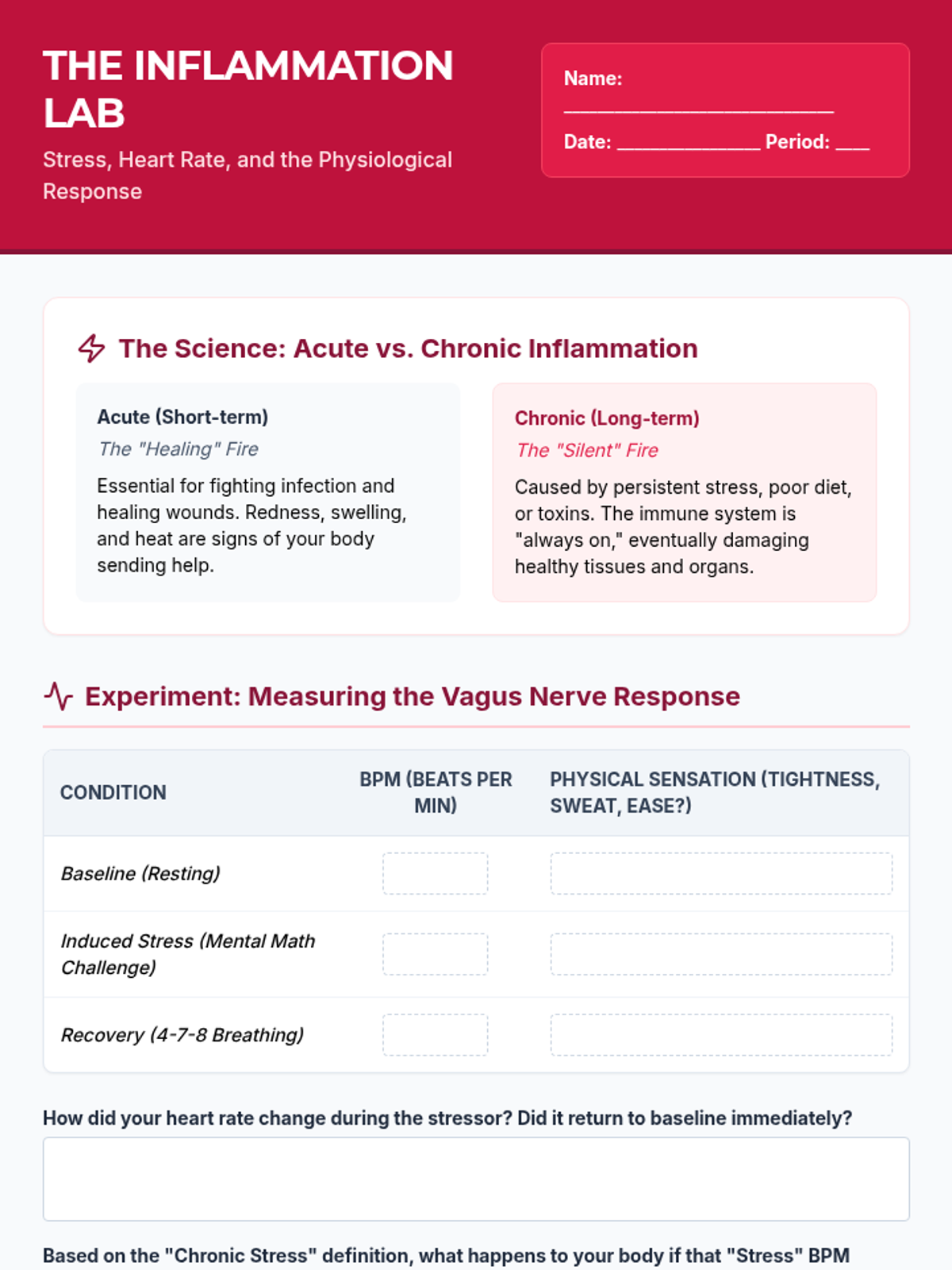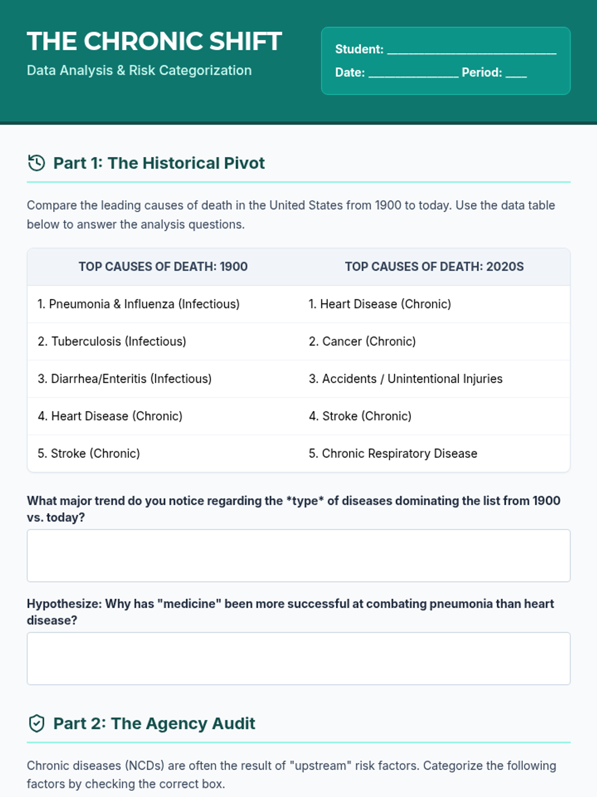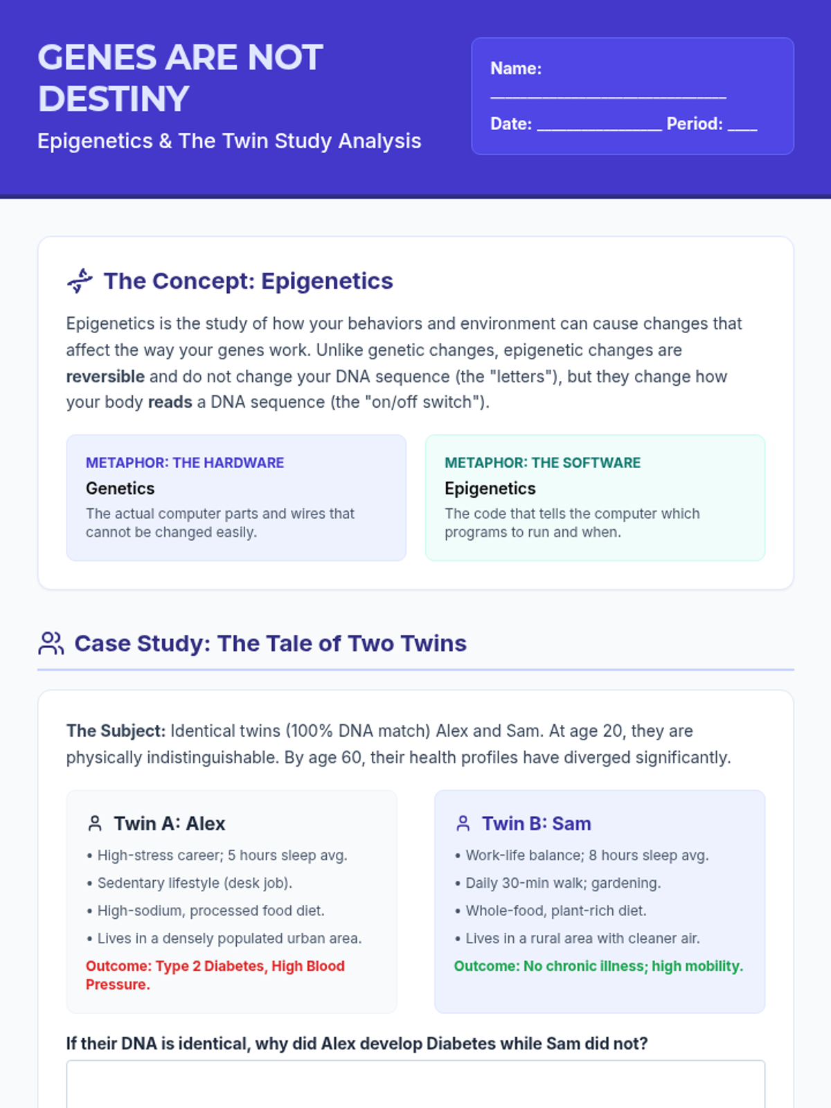This 11th-grade health sequence explores lifestyle medicine as a primary tool for chronic disease prevention. Students investigate the shift from infectious to non-communicable diseases, the science of epigenetics, the physiological impact of stress and inflammation, the critical role of sleep, and finally design evidence-based personal health blueprints to mitigate genetic risks.