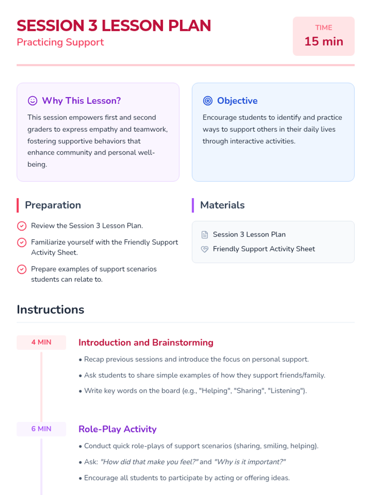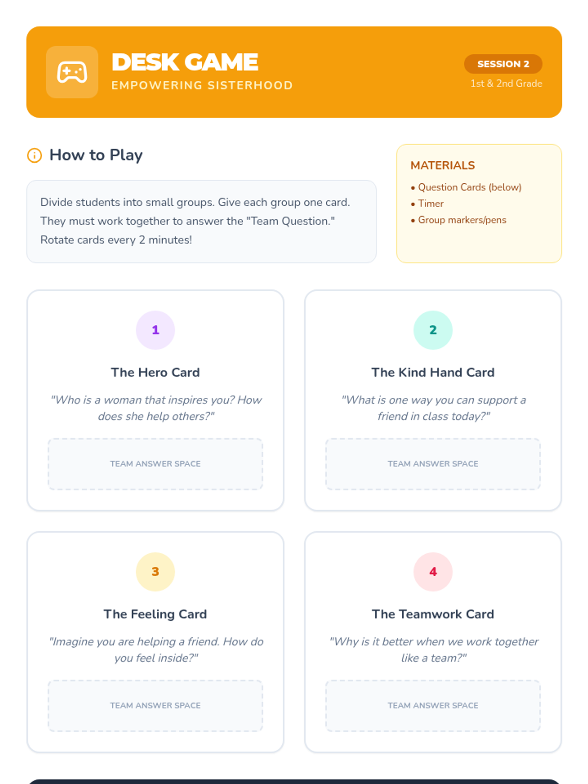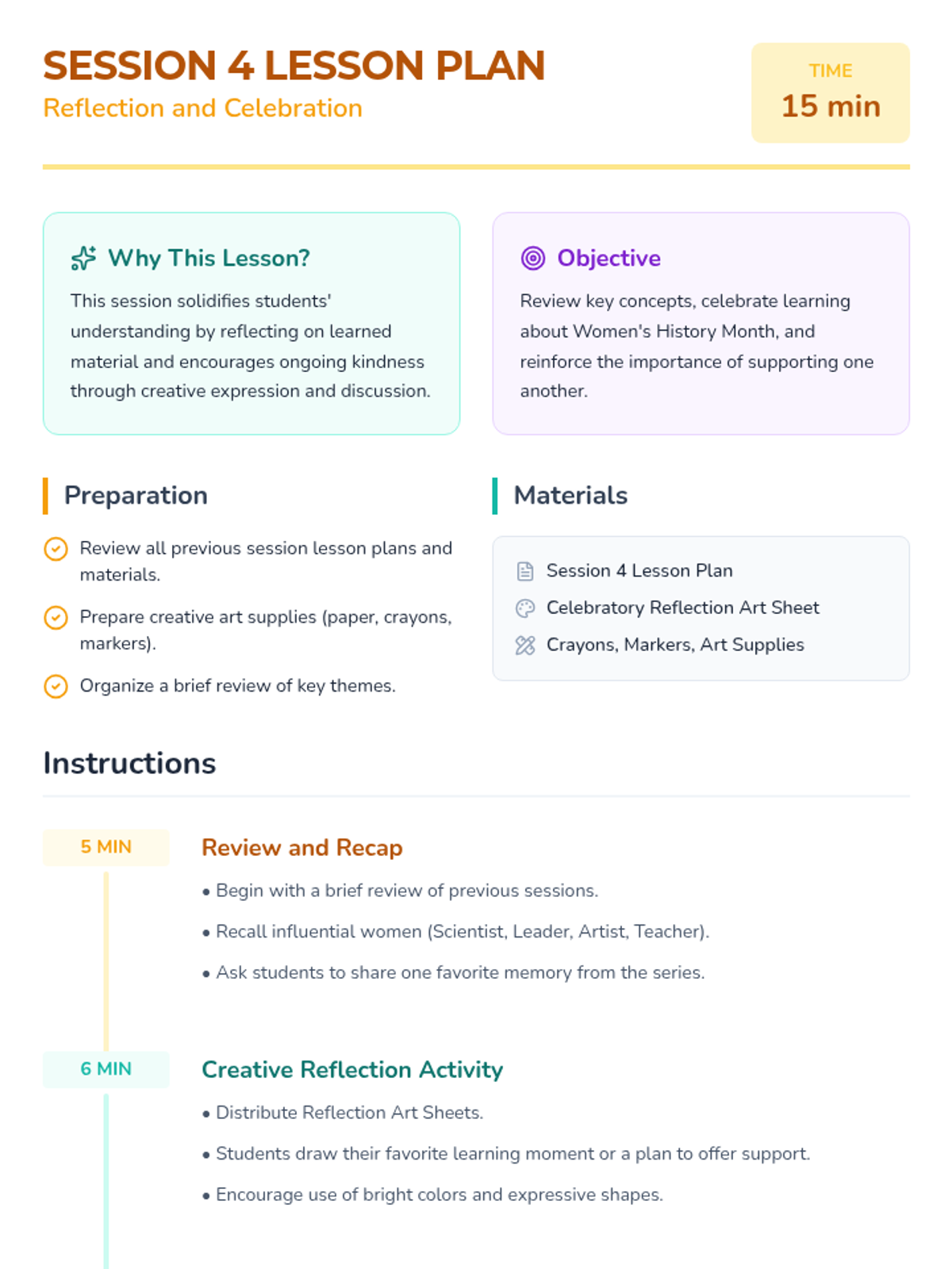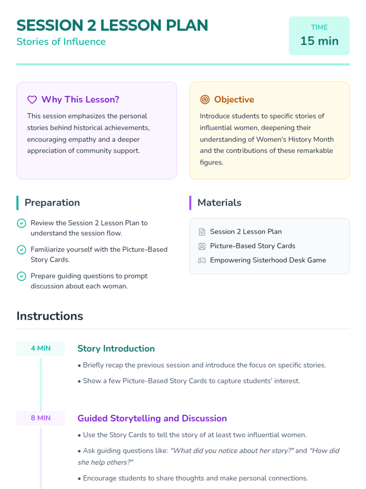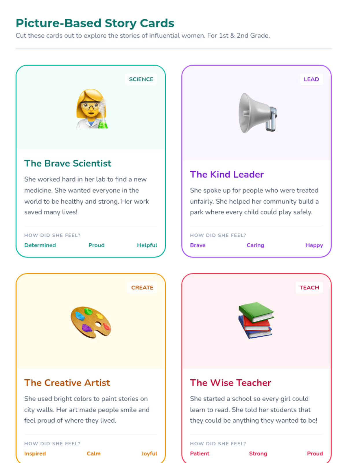 A 4-session sequence for first and second graders exploring Women's History Month through the lens of mutual support, influential women, and community building. Students engage with stories, role-play, and creative activities to understand how lifting others up creates a stronger community.