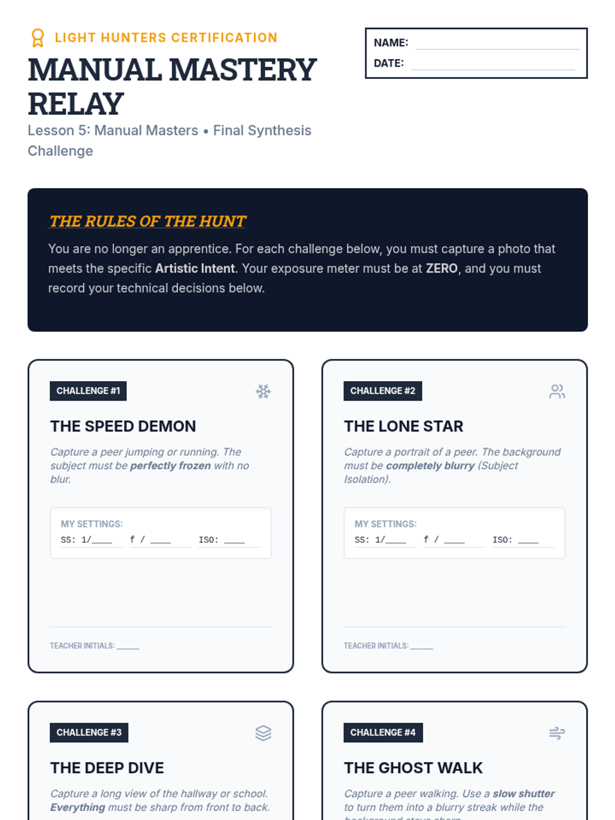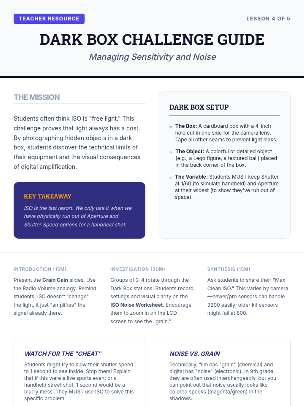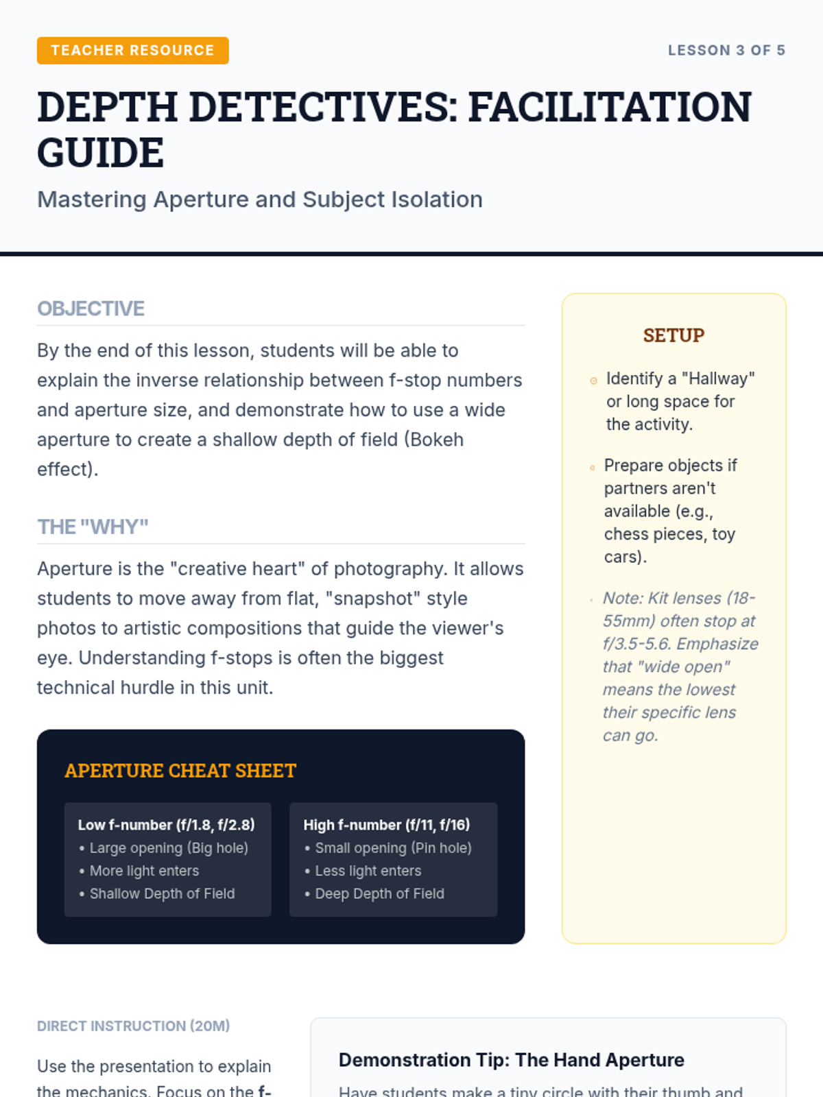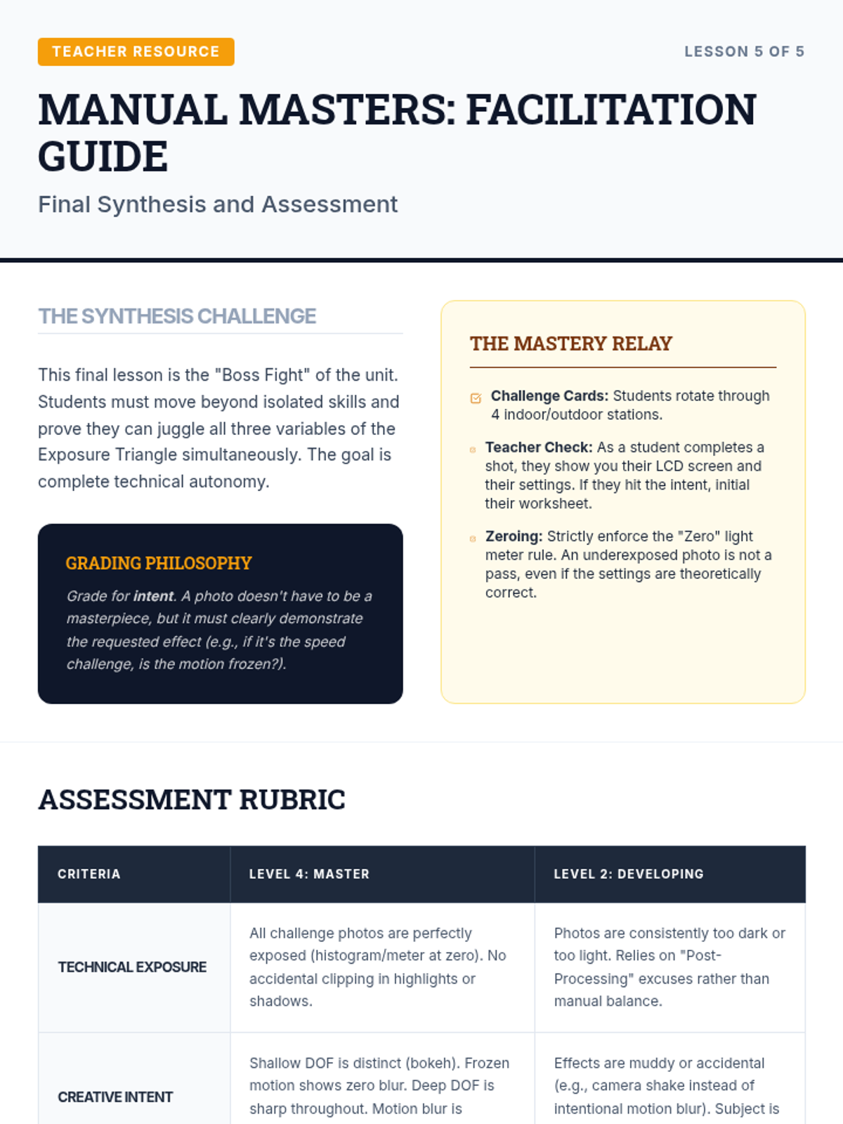 A comprehensive 9th-grade photography sequence that demystifies the Exposure Triangle: Aperture, Shutter Speed, and ISO. Students progress from diagnosing exposure errors to mastering manual control through hands-on experiments and artistic challenges.