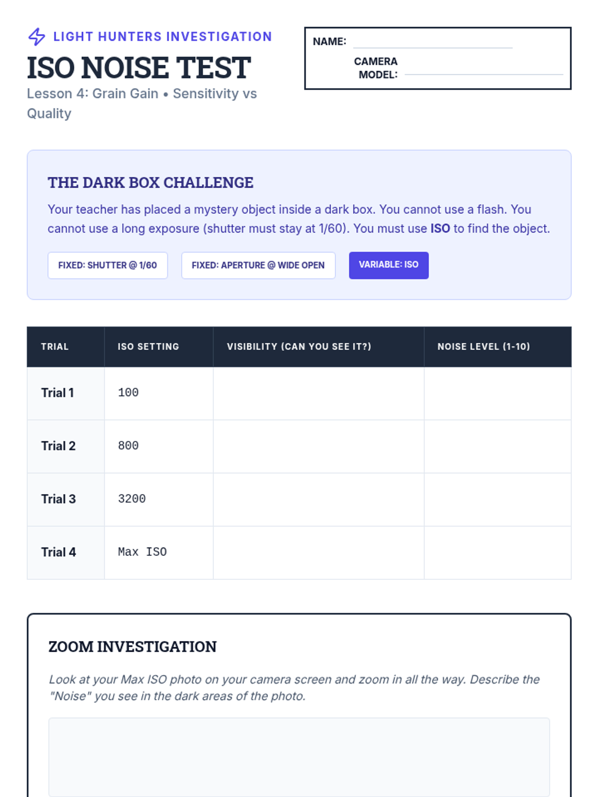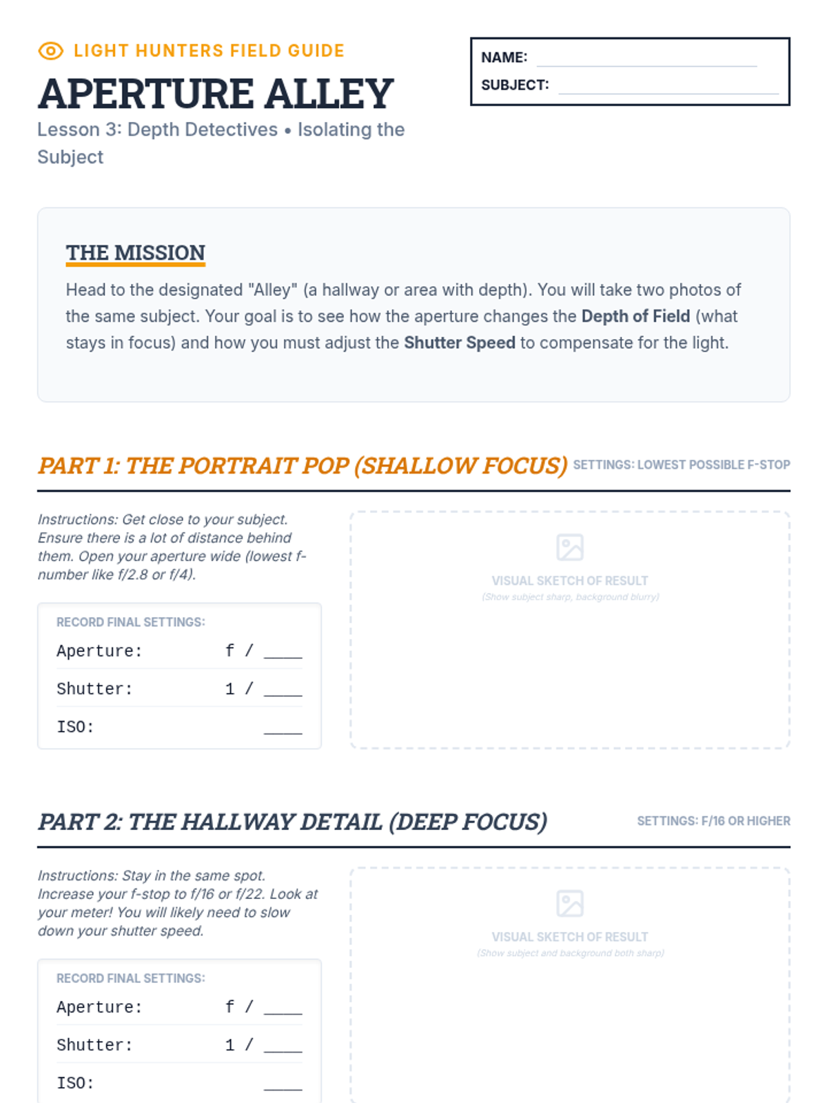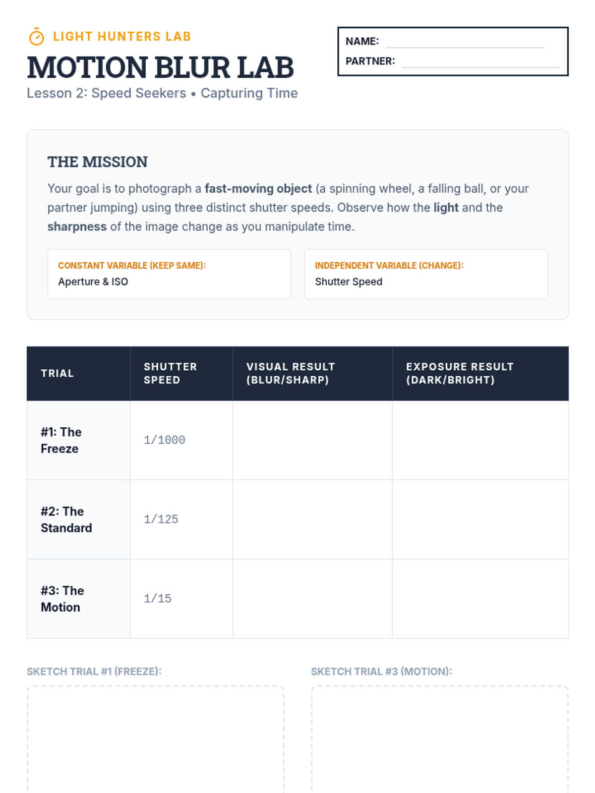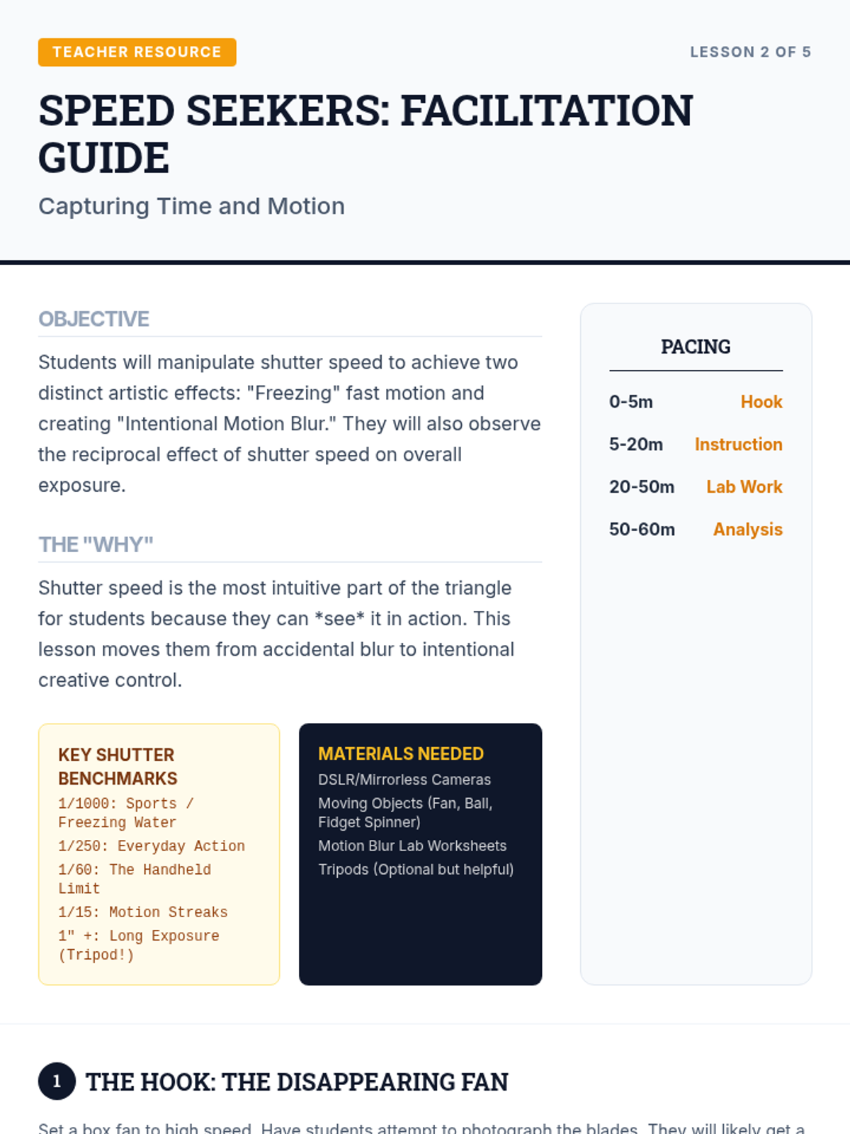 A comprehensive 9th-grade photography sequence that demystifies the Exposure Triangle: Aperture, Shutter Speed, and ISO. Students progress from diagnosing exposure errors to mastering manual control through hands-on experiments and artistic challenges.