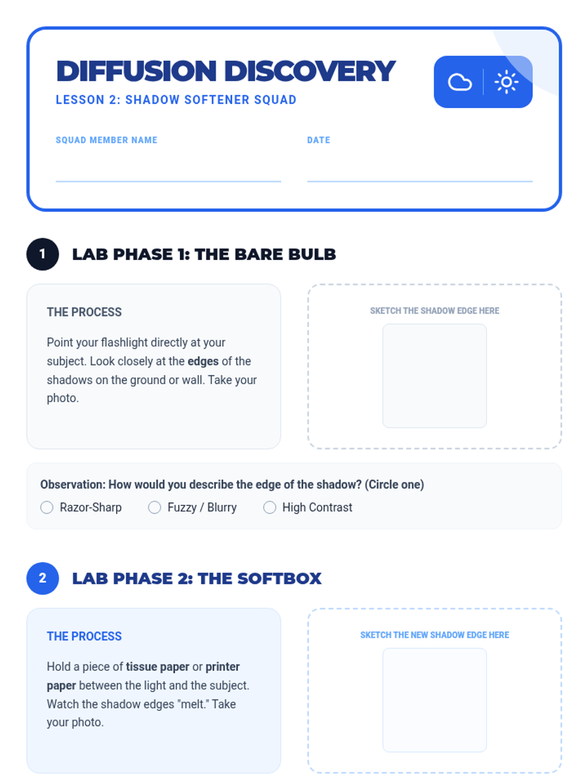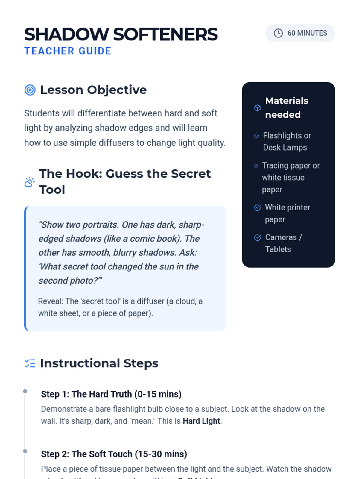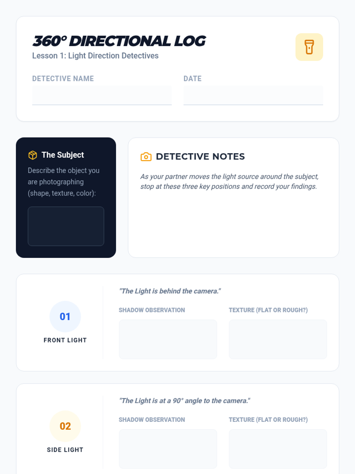A comprehensive sequence for 6th-grade photography students exploring the fundamental role of light. Students move from basic exposure concepts to creative manipulation of shadows, color temperature, and silhouettes to control the mood and texture of their images.