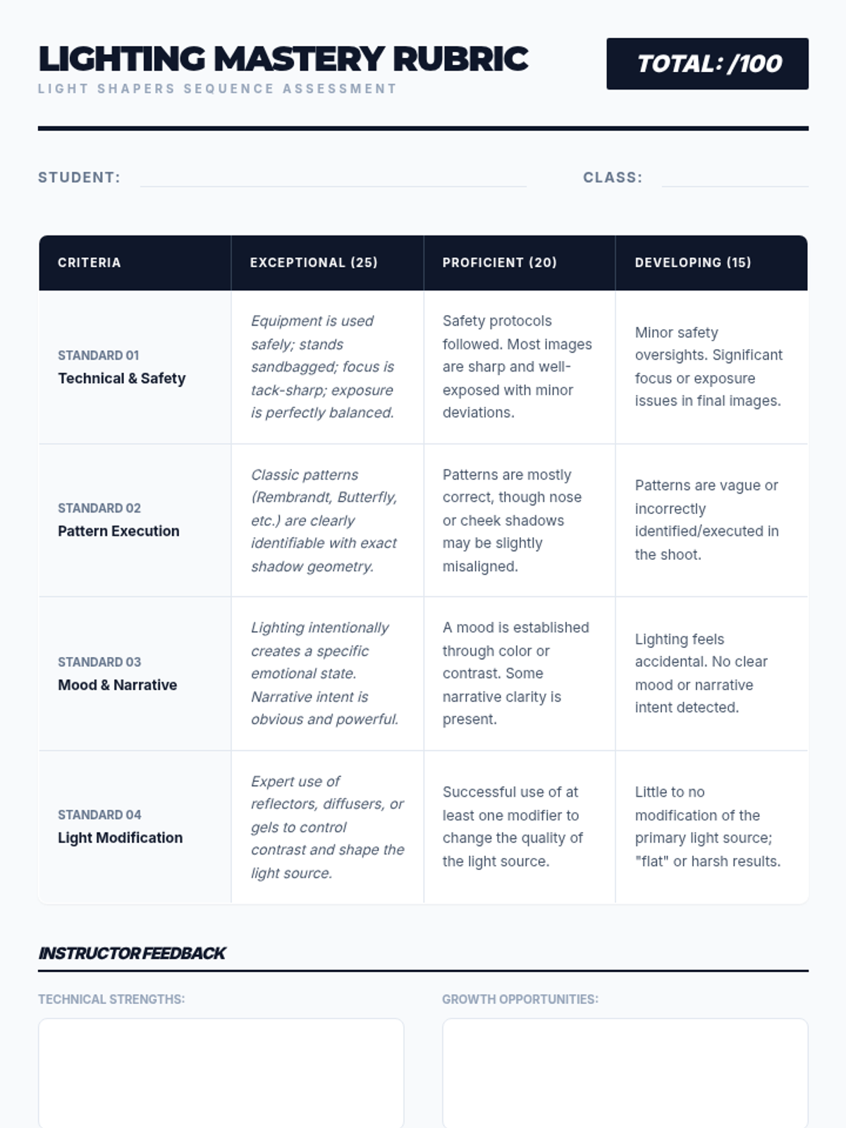 This sequence explores the critical role of light as the primary medium of photography, guiding students from natural light observation to advanced studio manipulation. Students learn to shape light to create specific moods and flatter subjects through direction, color, and quality.