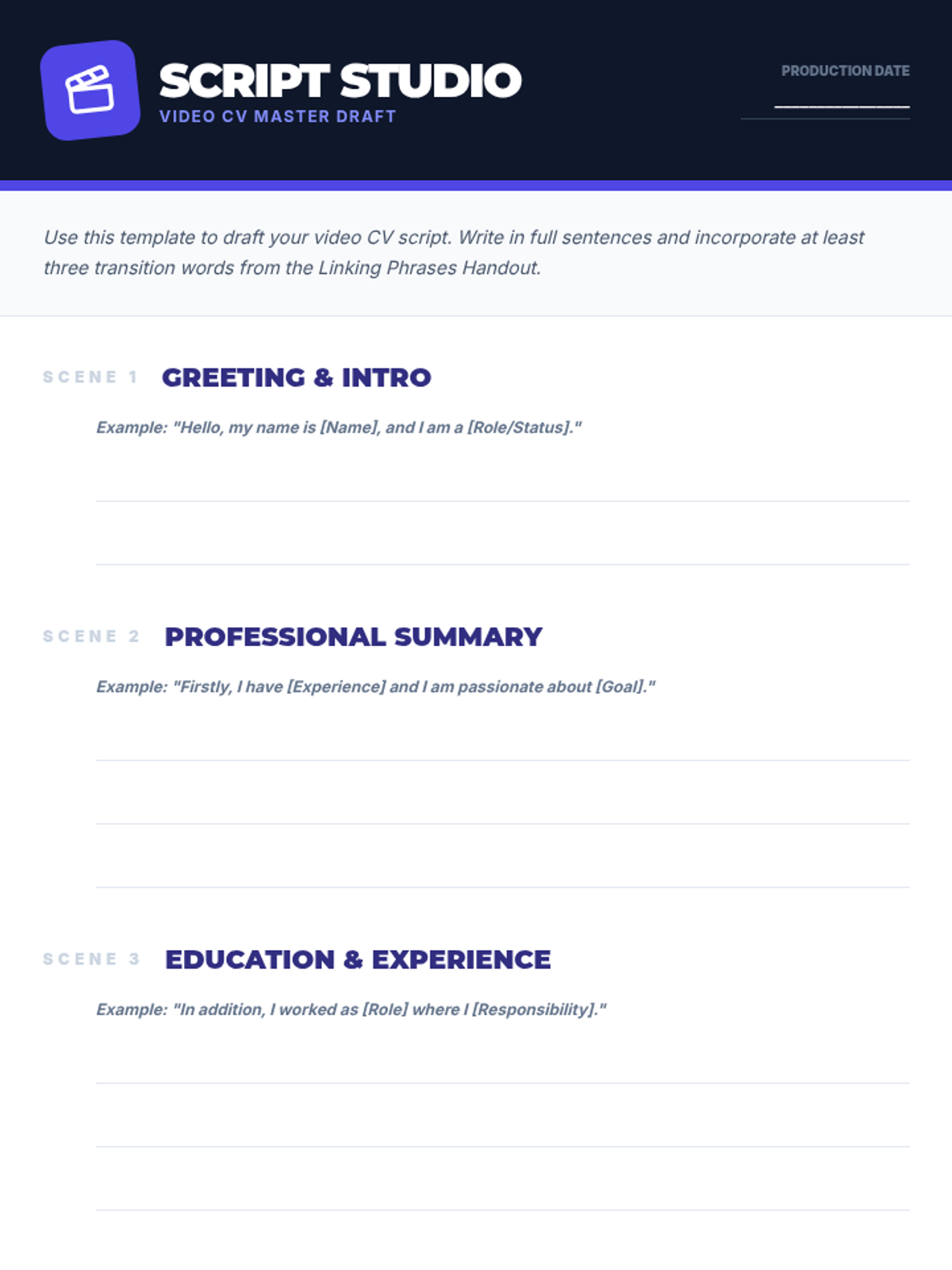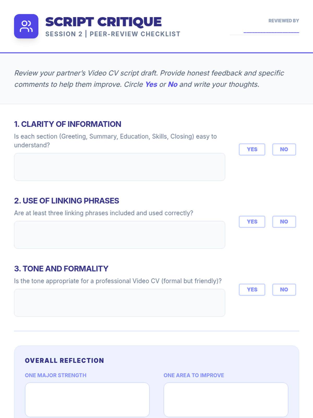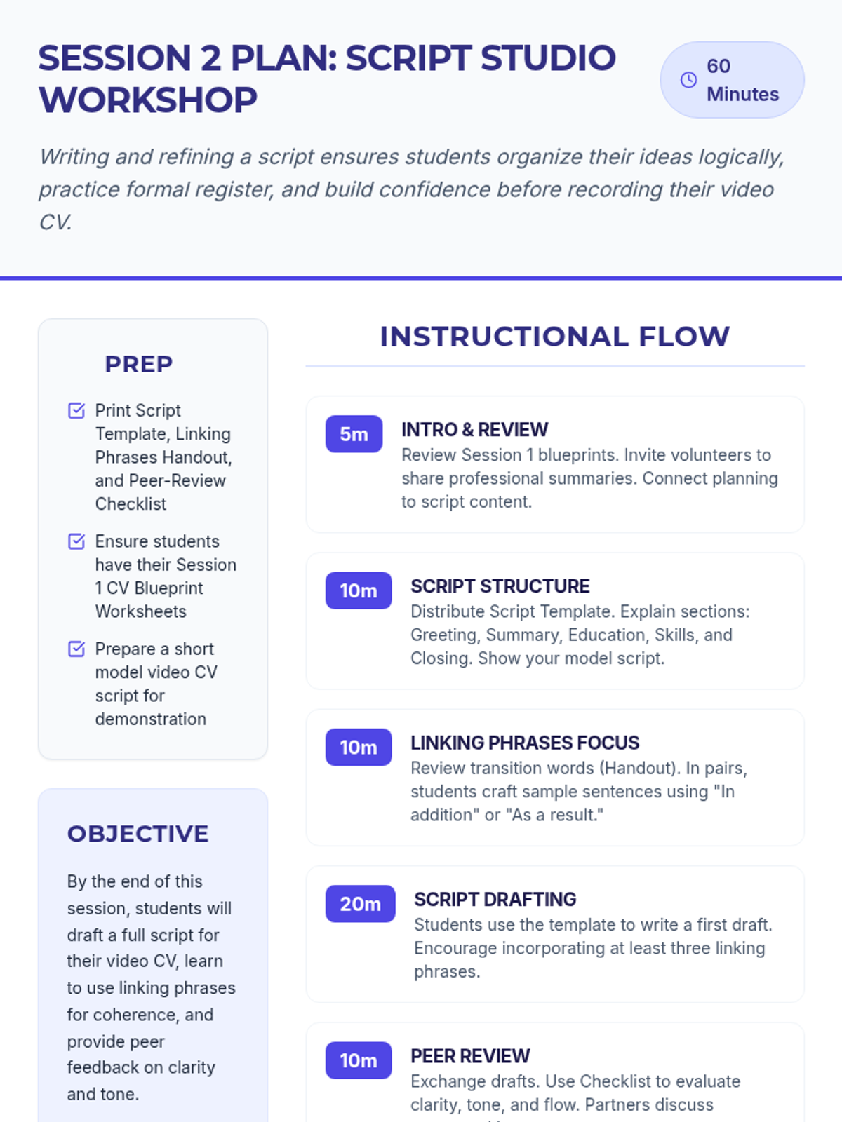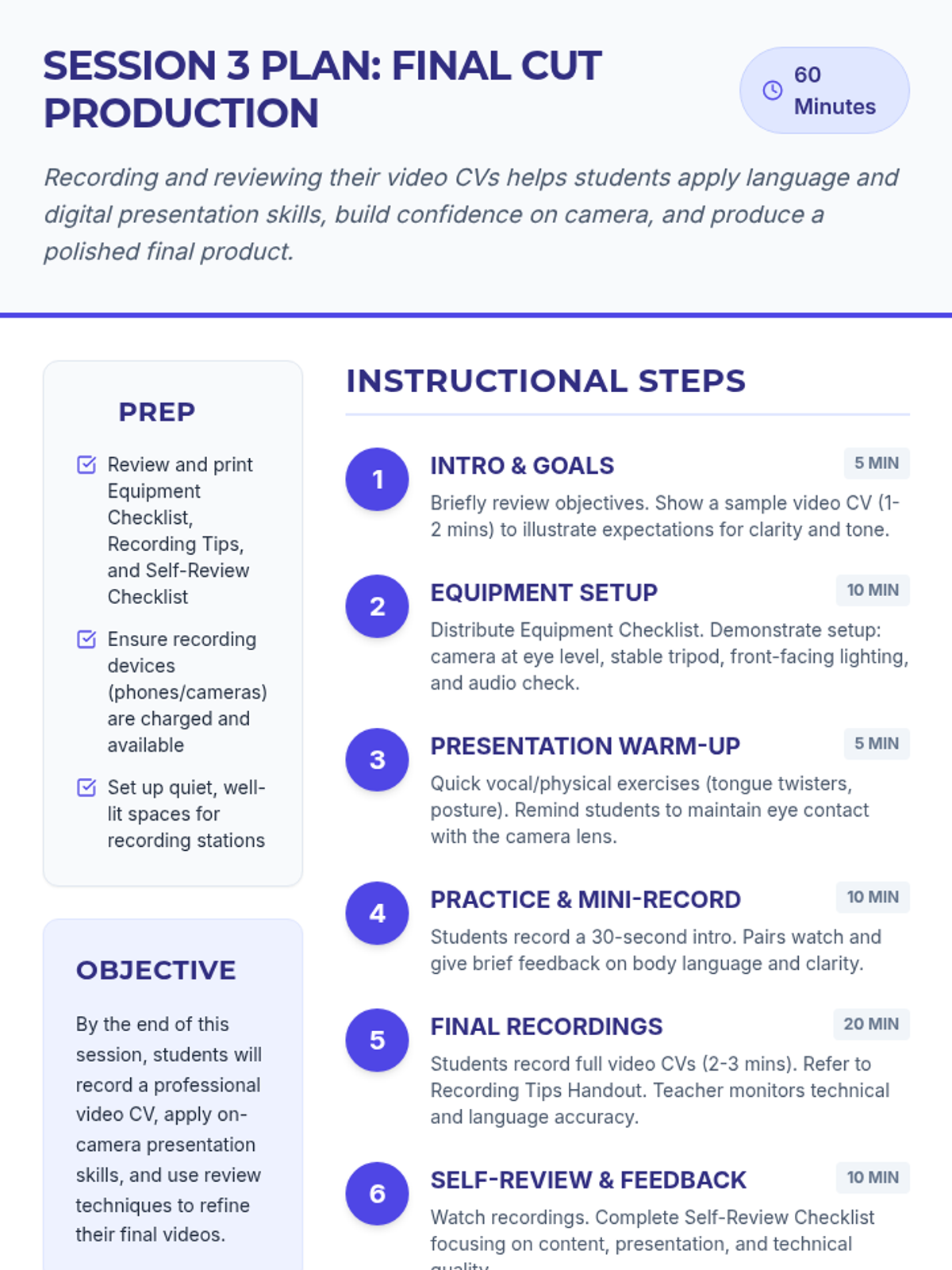A 3-session unit for 11th grade B1 EFL learners focused on planning, scripting, and producing a professional video CV. Students develop key vocabulary, digital communication skills, and self-presentation confidence.