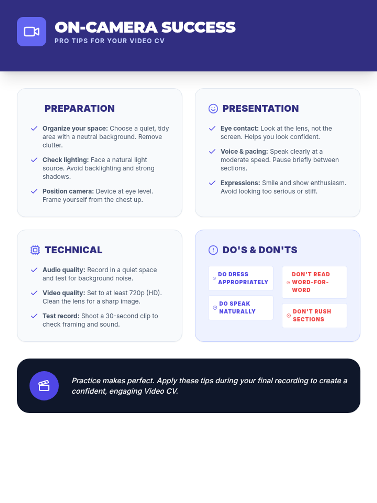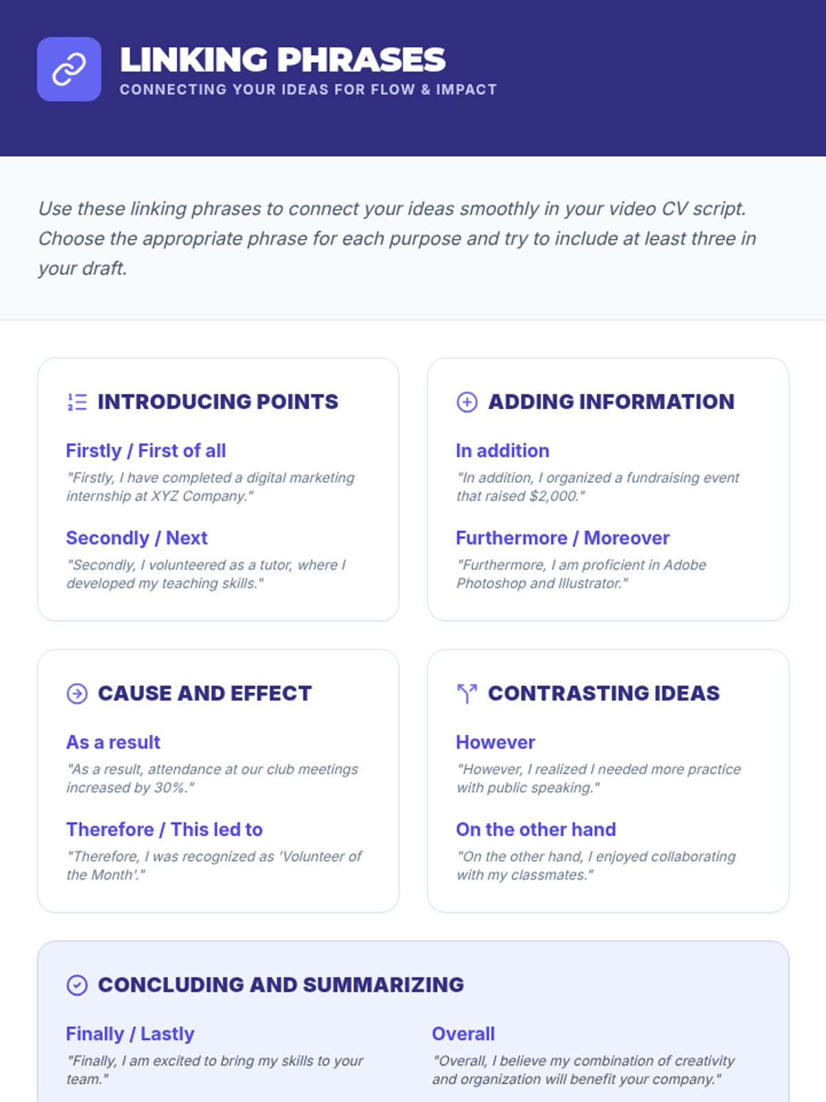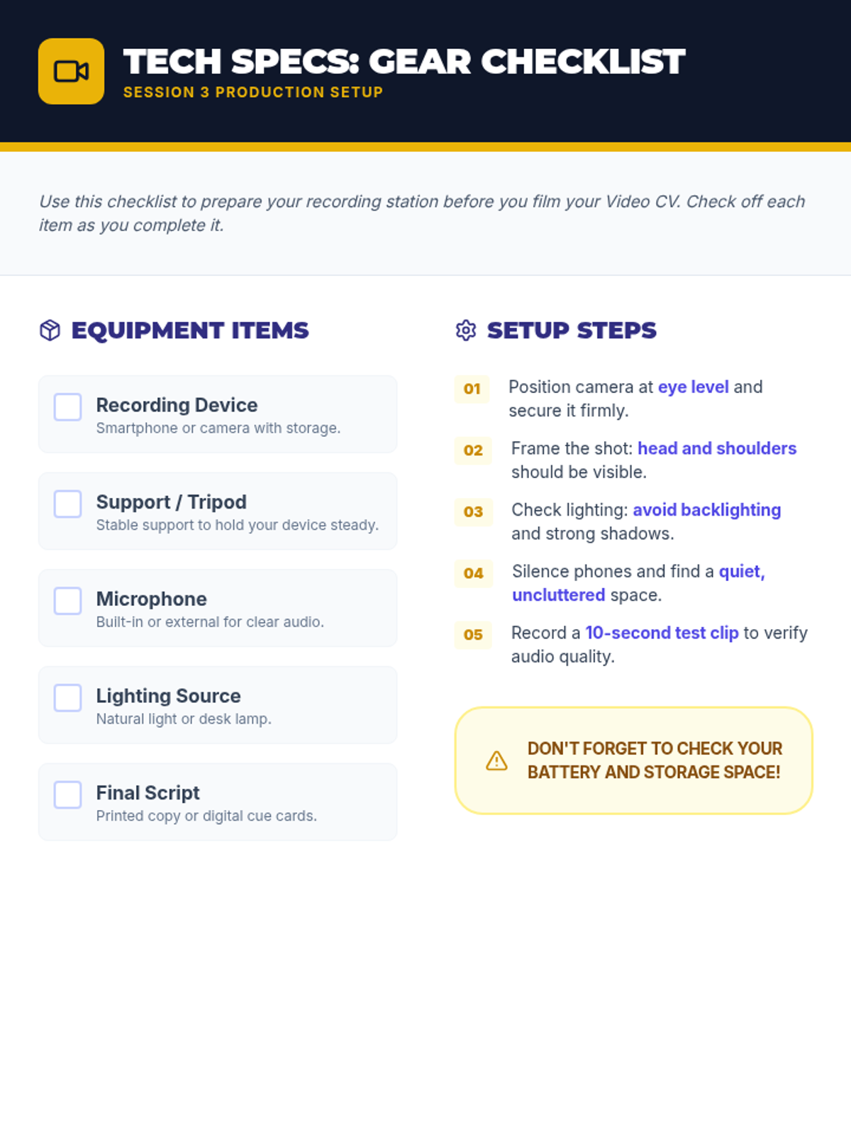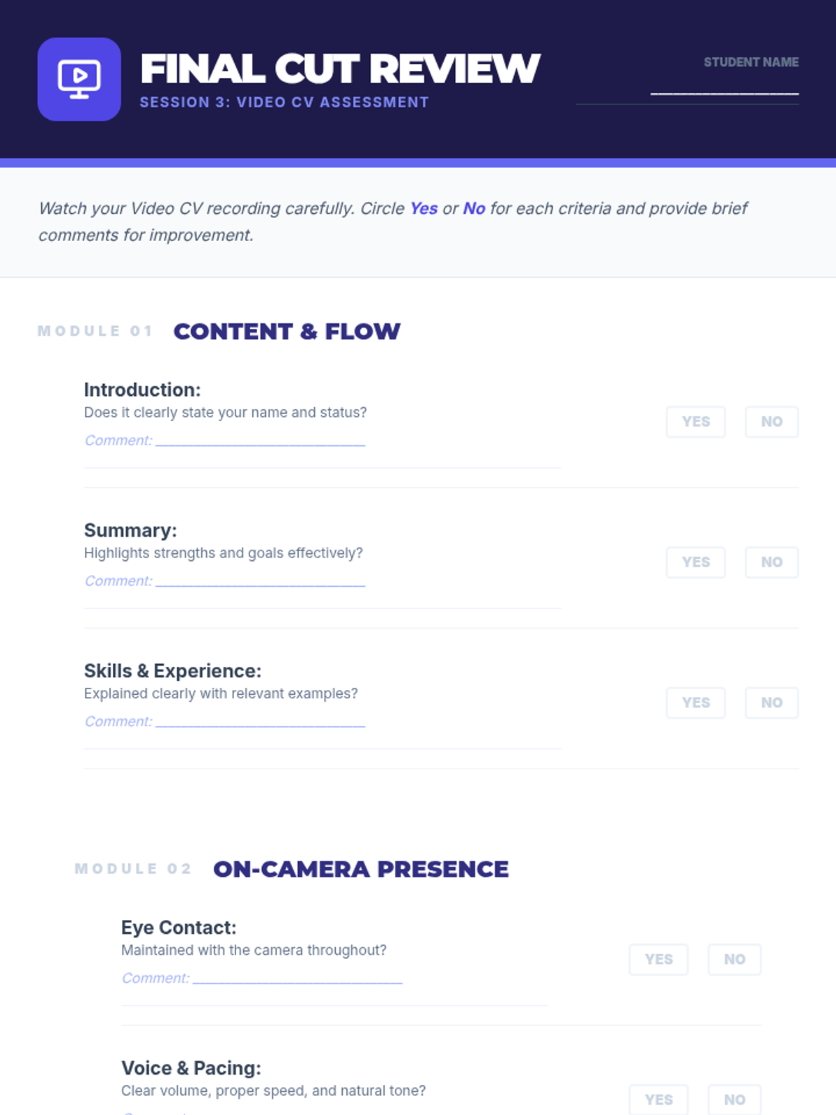 A 3-session unit for 11th grade B1 EFL learners focused on planning, scripting, and producing a professional video CV. Students develop key vocabulary, digital communication skills, and self-presentation confidence.