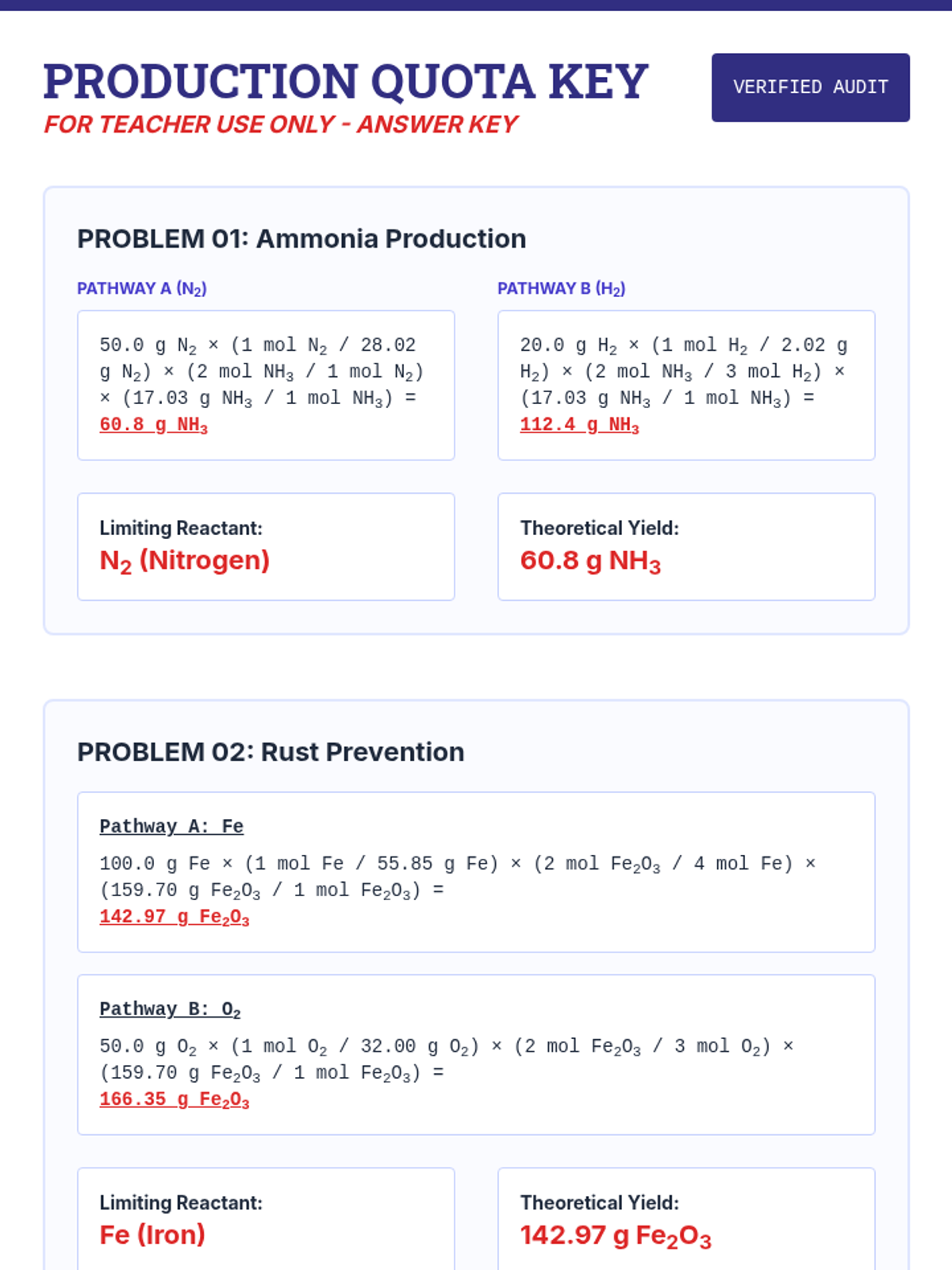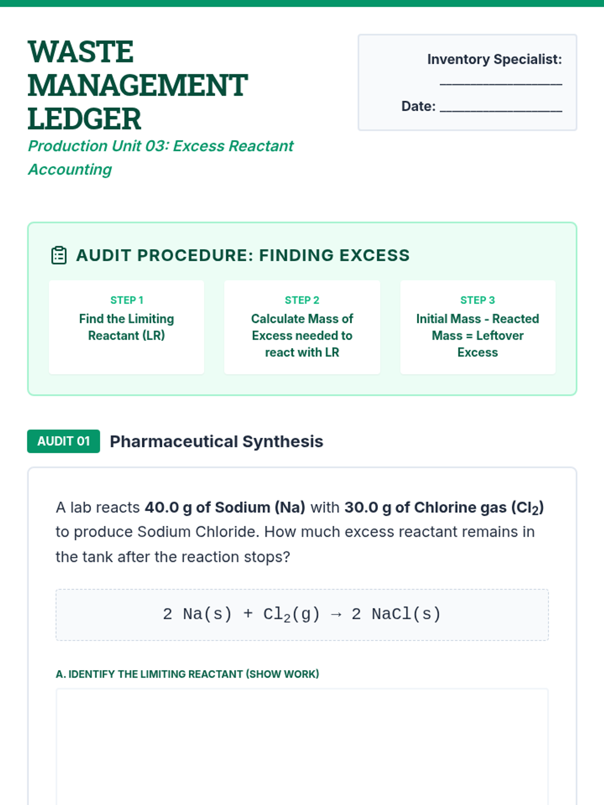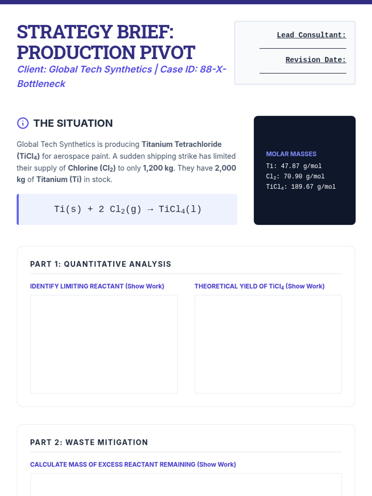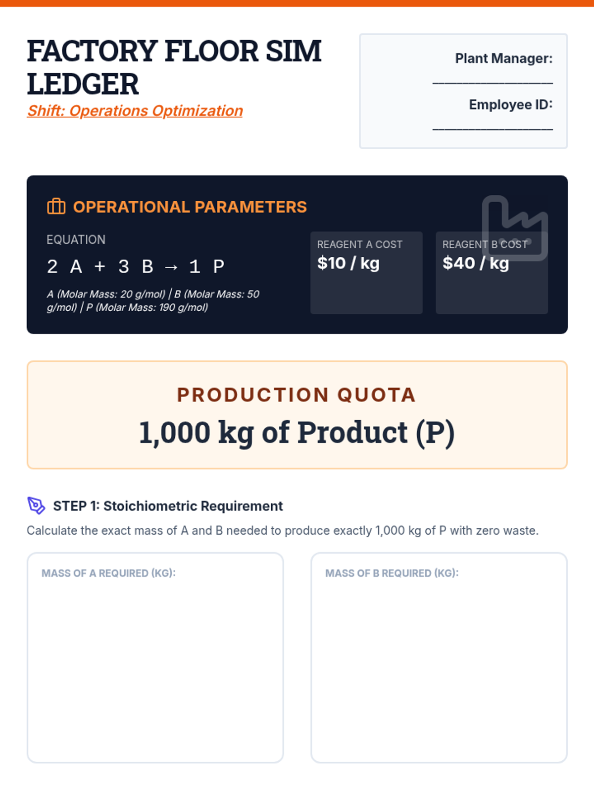 A 10th-grade chemistry sequence exploring limiting reactants through the lens of industrial efficiency. Students move from conceptual modeling with manipulatives to complex stoichiometric calculations and strategic resource management in a simulated chemical plant.