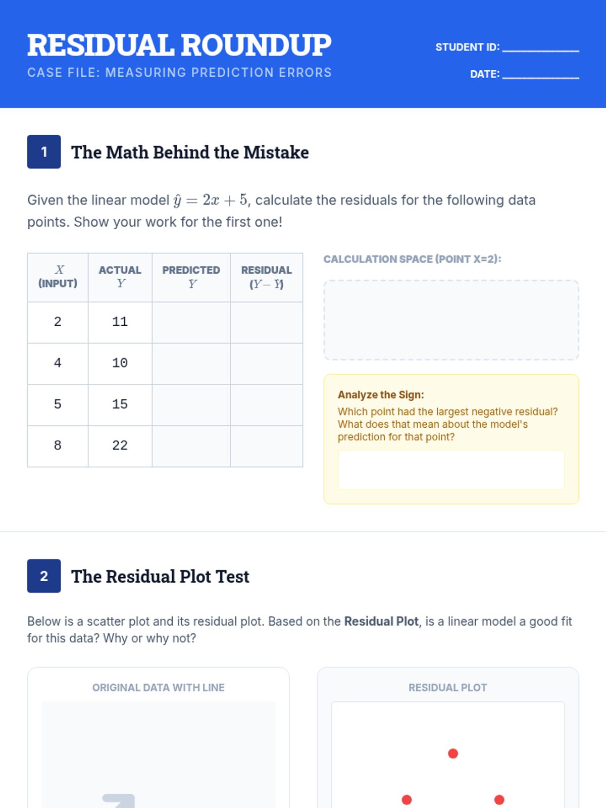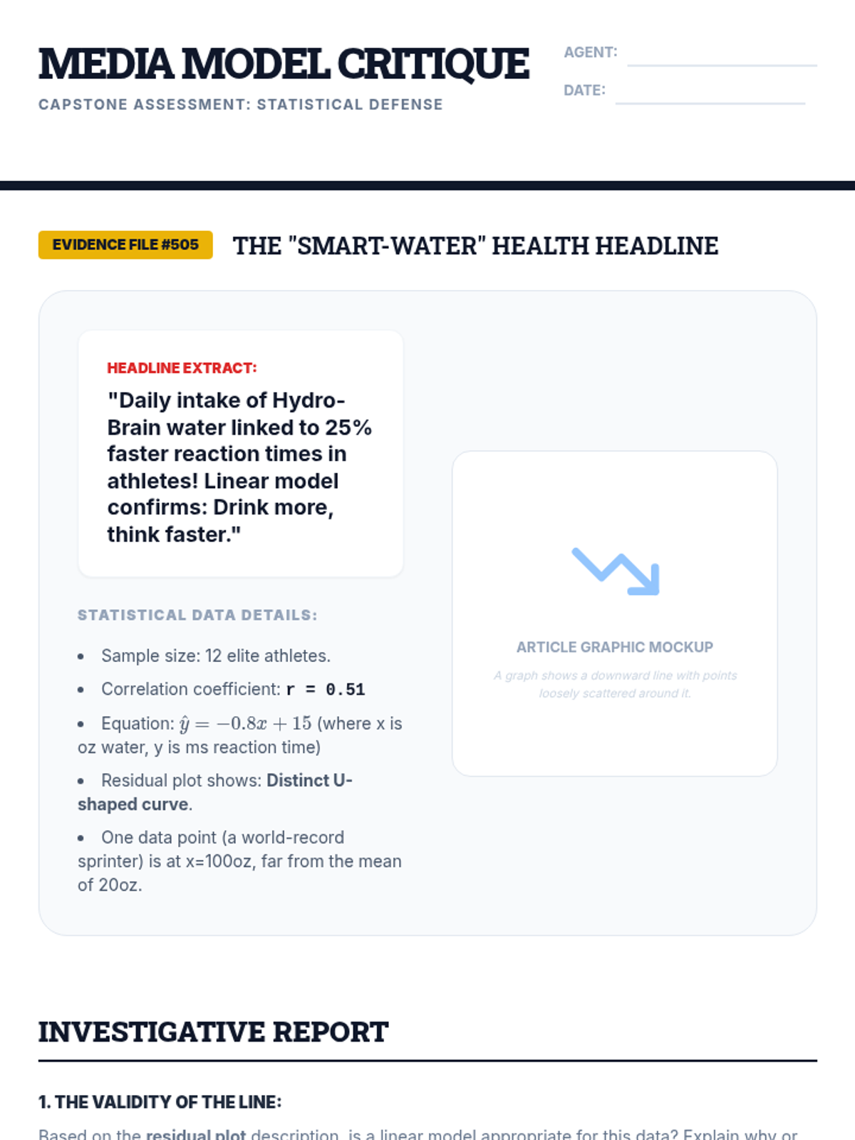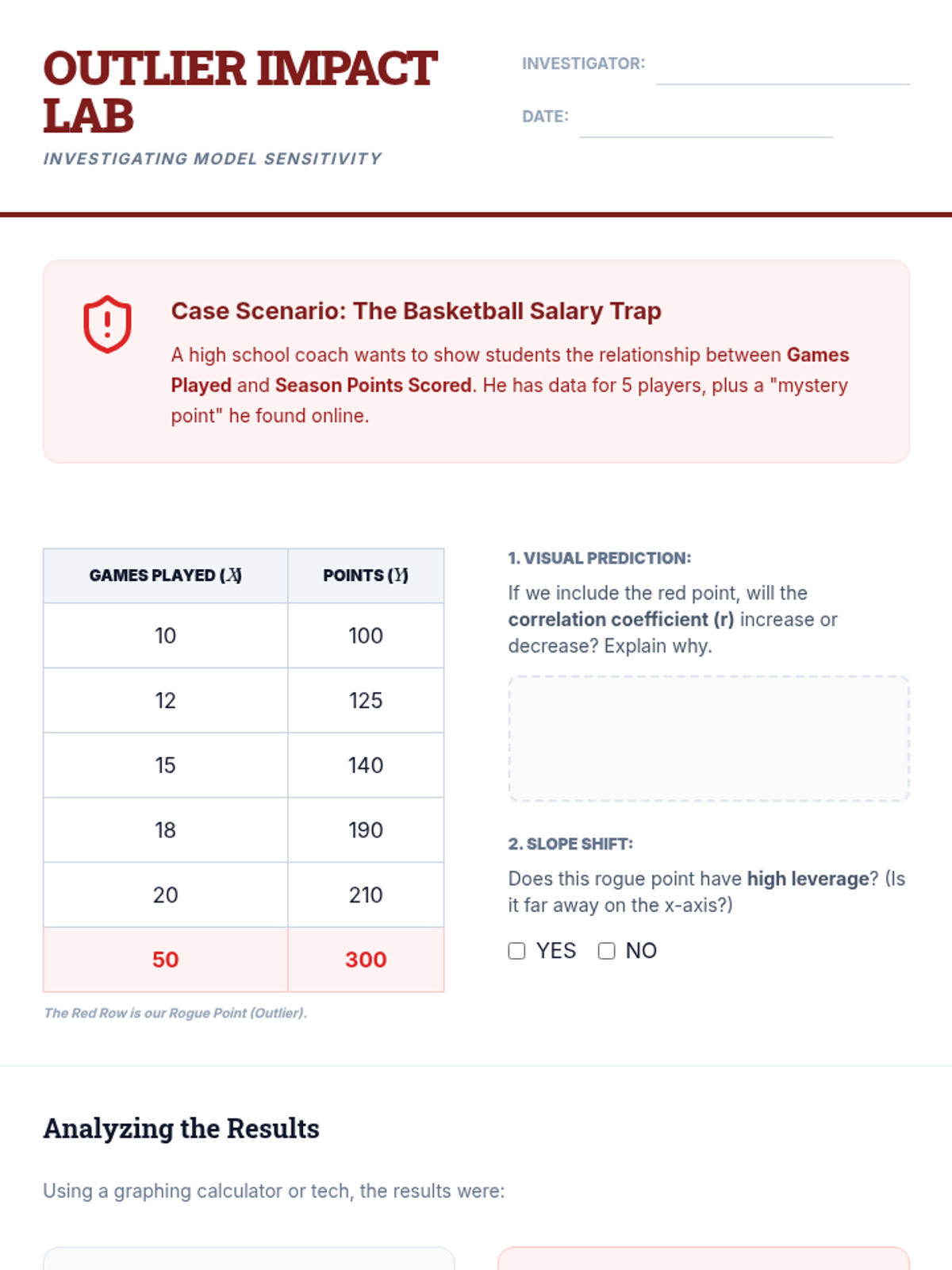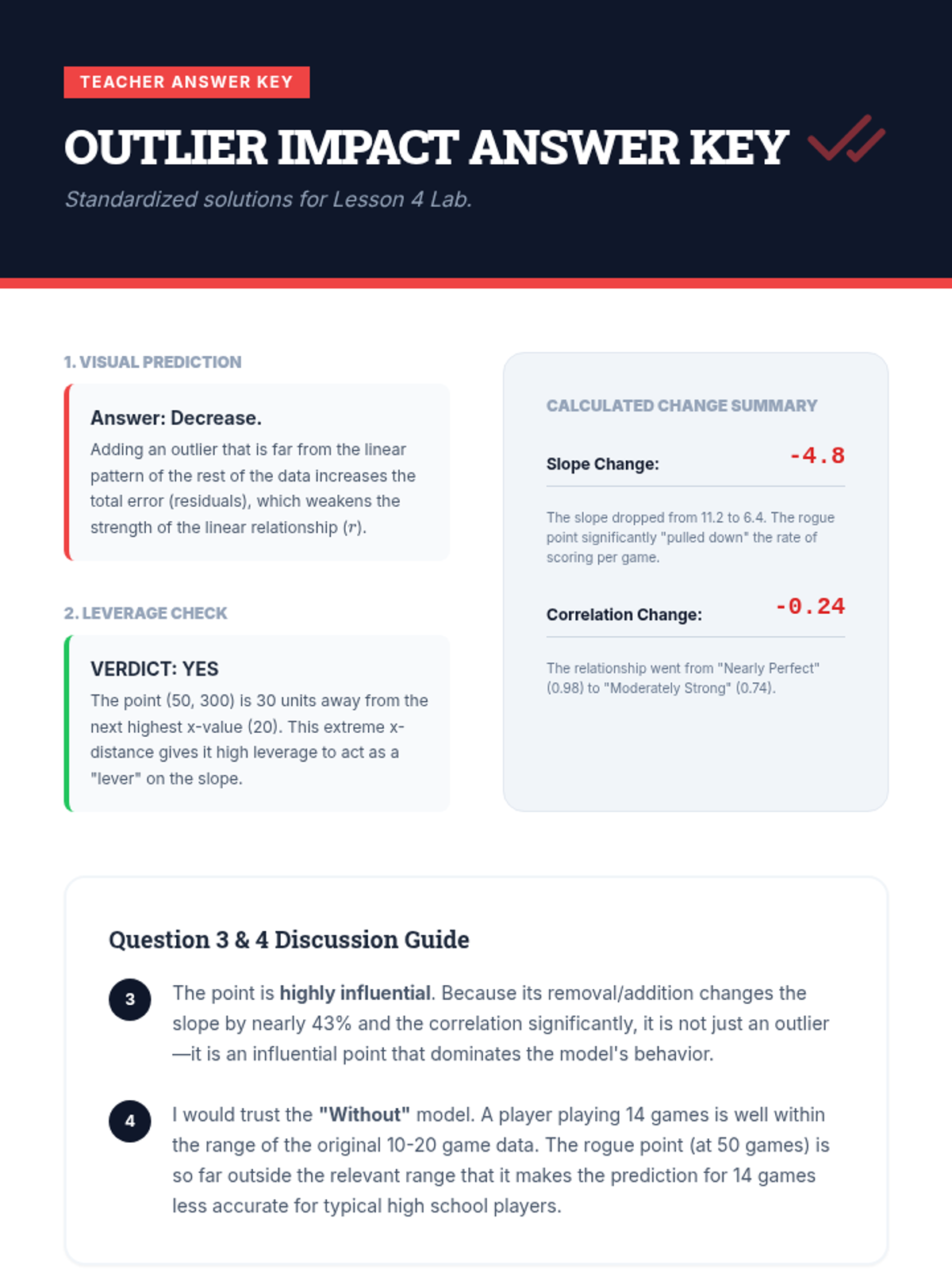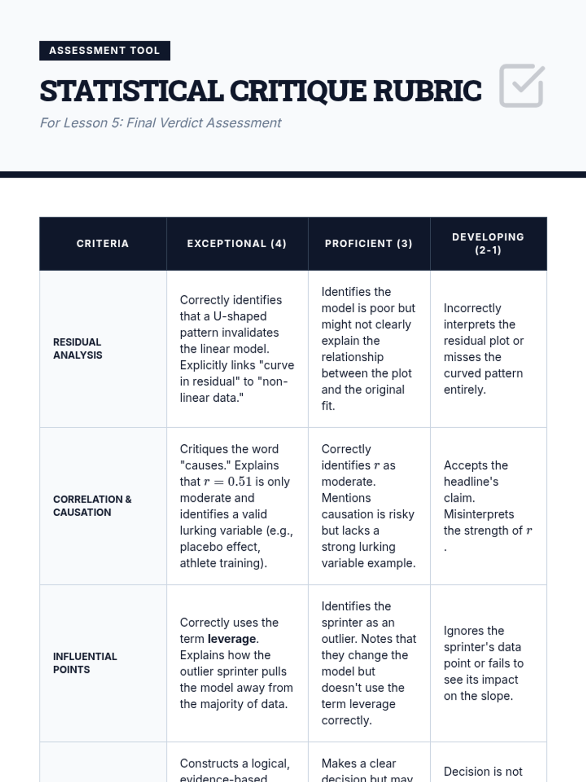 This 10th-grade sequence moves students from basic linear calculation to deep statistical reasoning, focusing on the reliability of linear models. Students explore correlation vs. causation, residuals, the correlation coefficient, and the significant impact of outliers to evaluate the validity of statistical arguments in the real world.