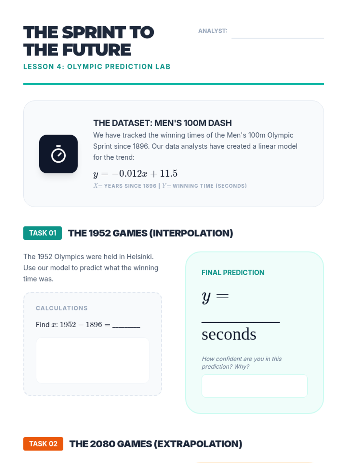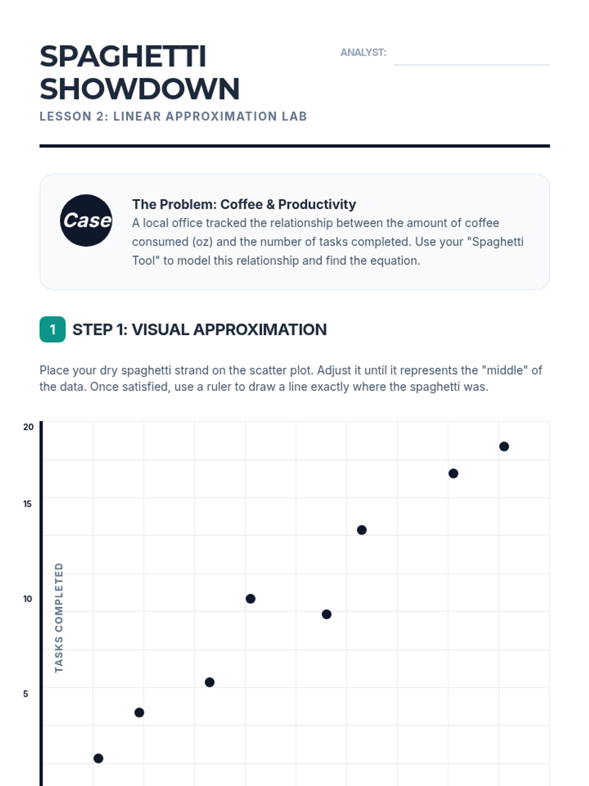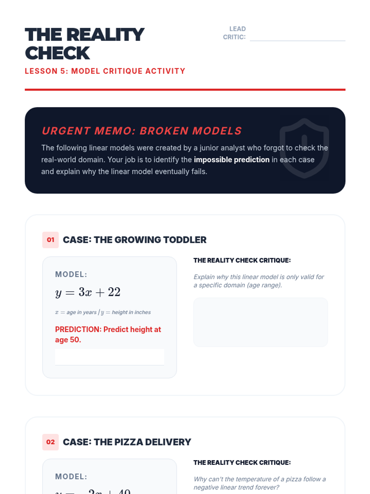 A 5-lesson sequence where students act as data analysts to explore, construct, and interpret linear models. Students progress from basic scatter plots to making predictions and critiquing the validity of linear models in real-world contexts.