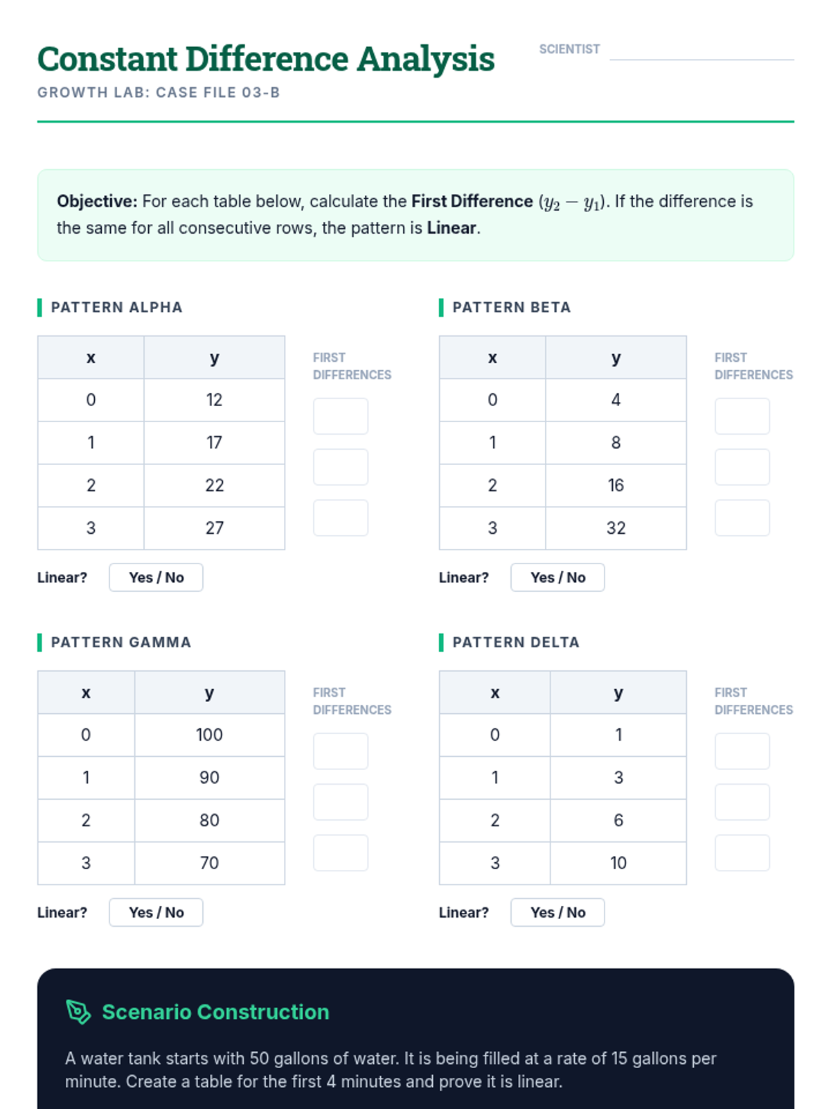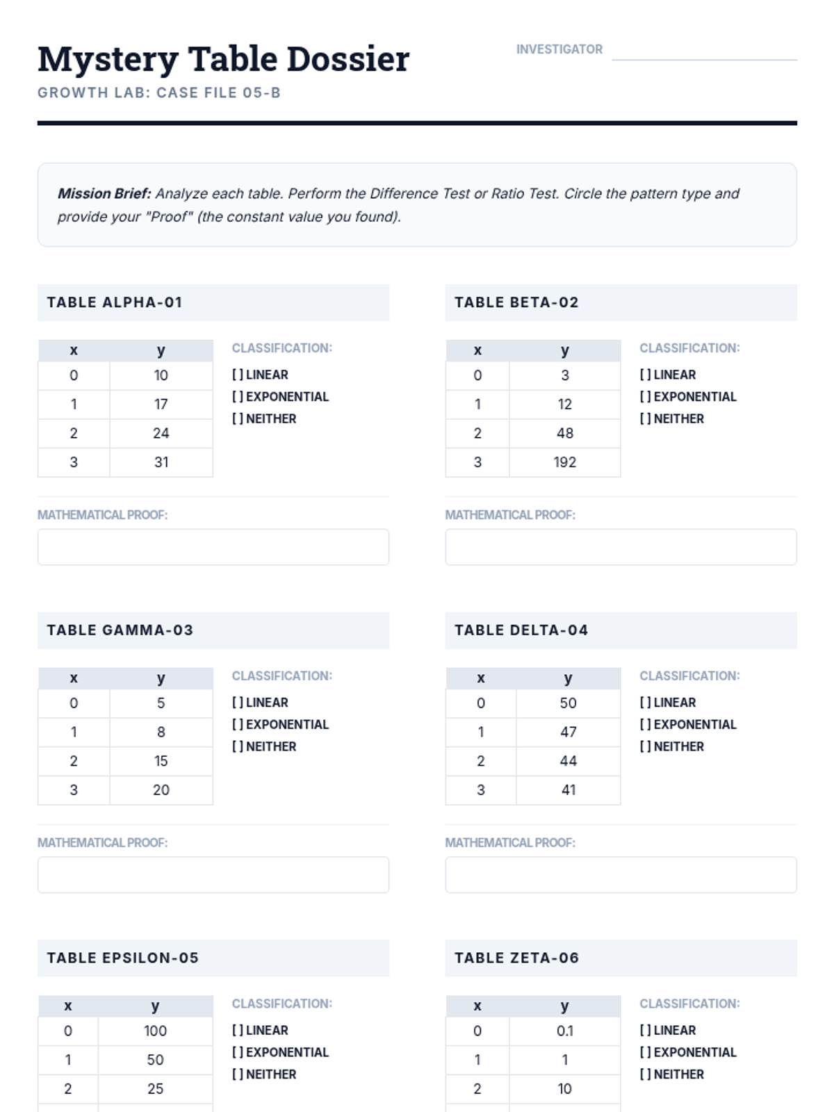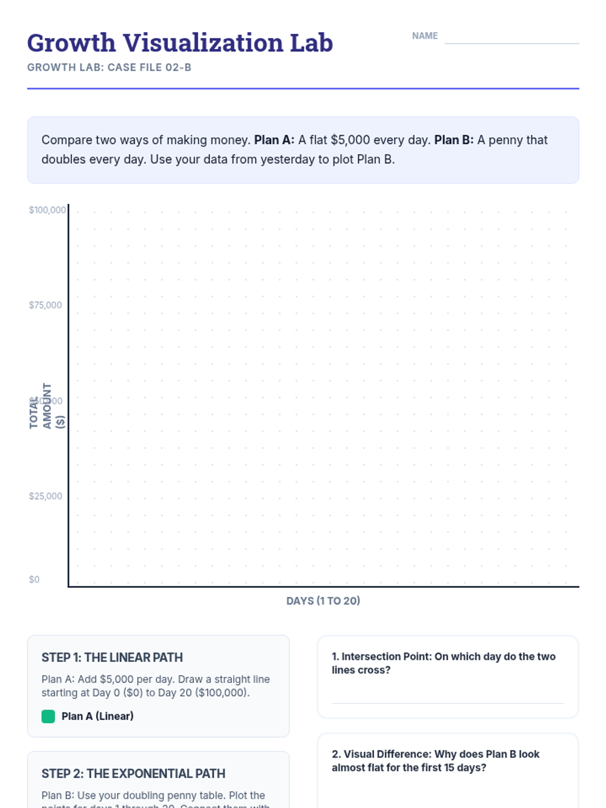 An inquiry-based exploration of additive vs. multiplicative growth, moving from a classic penny-doubling dilemma to formal identification of linear and exponential functions using tables and graphs.