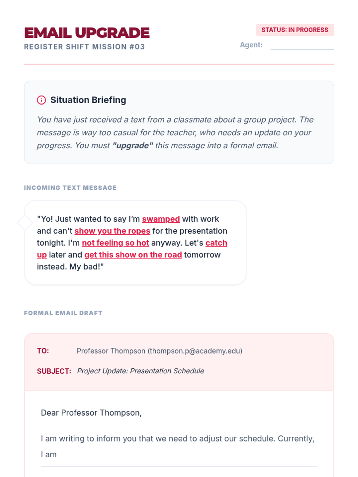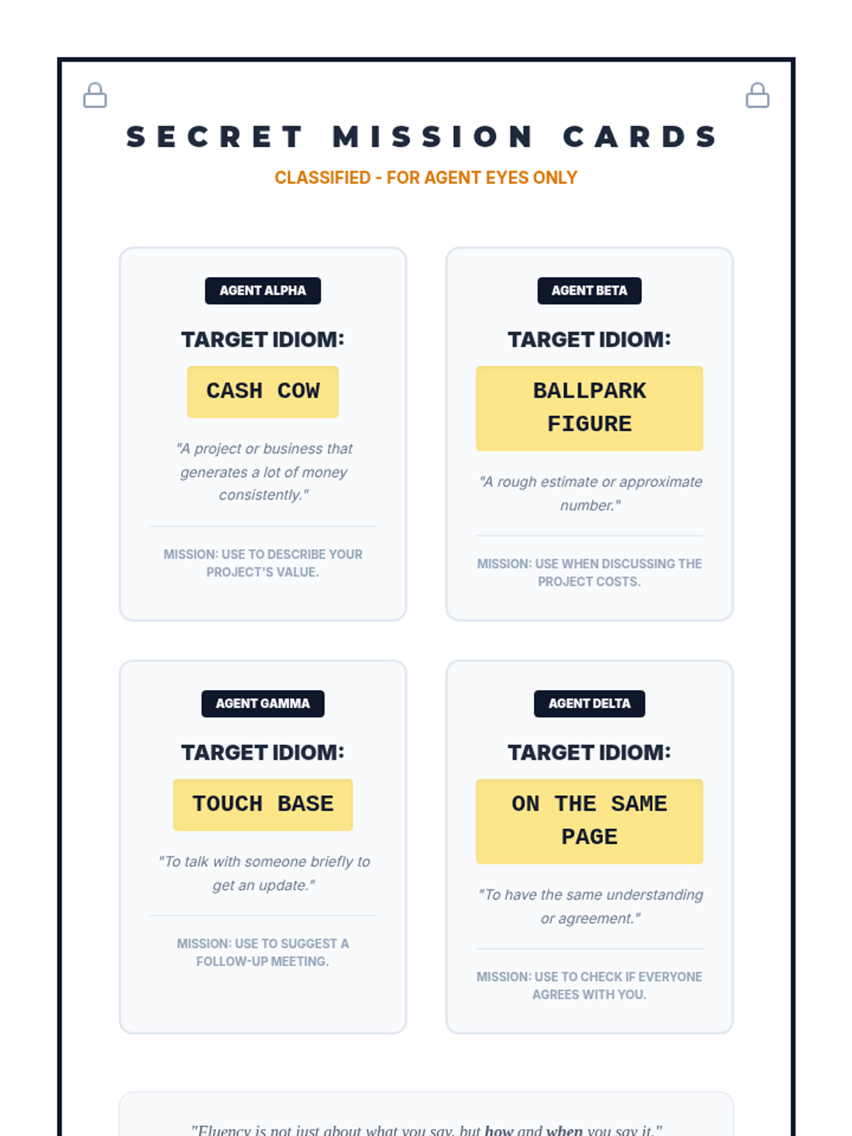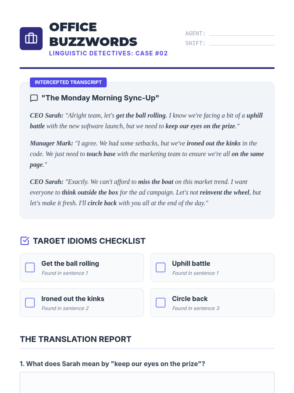 A 5-lesson sequence for advanced 6th-grade ESL students focusing on professional idioms and figurative language through a 'Linguistic Detectives' theme. Students progress from distinguishing literal meanings to using nuanced expressions in professional simulations.