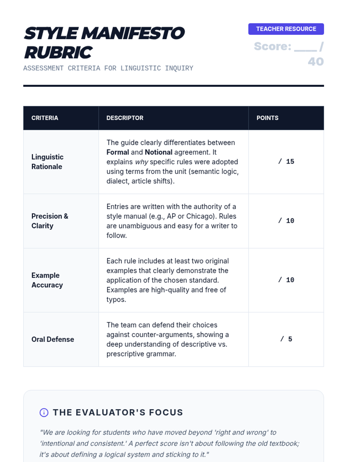 An advanced 10th-grade ELA sequence that treats grammar as a linguistic inquiry, exploring the tension between formal rules and notional agreement. Students analyze real-world usage, dialectical differences, and semantic logic to master complex subject-verb agreement.