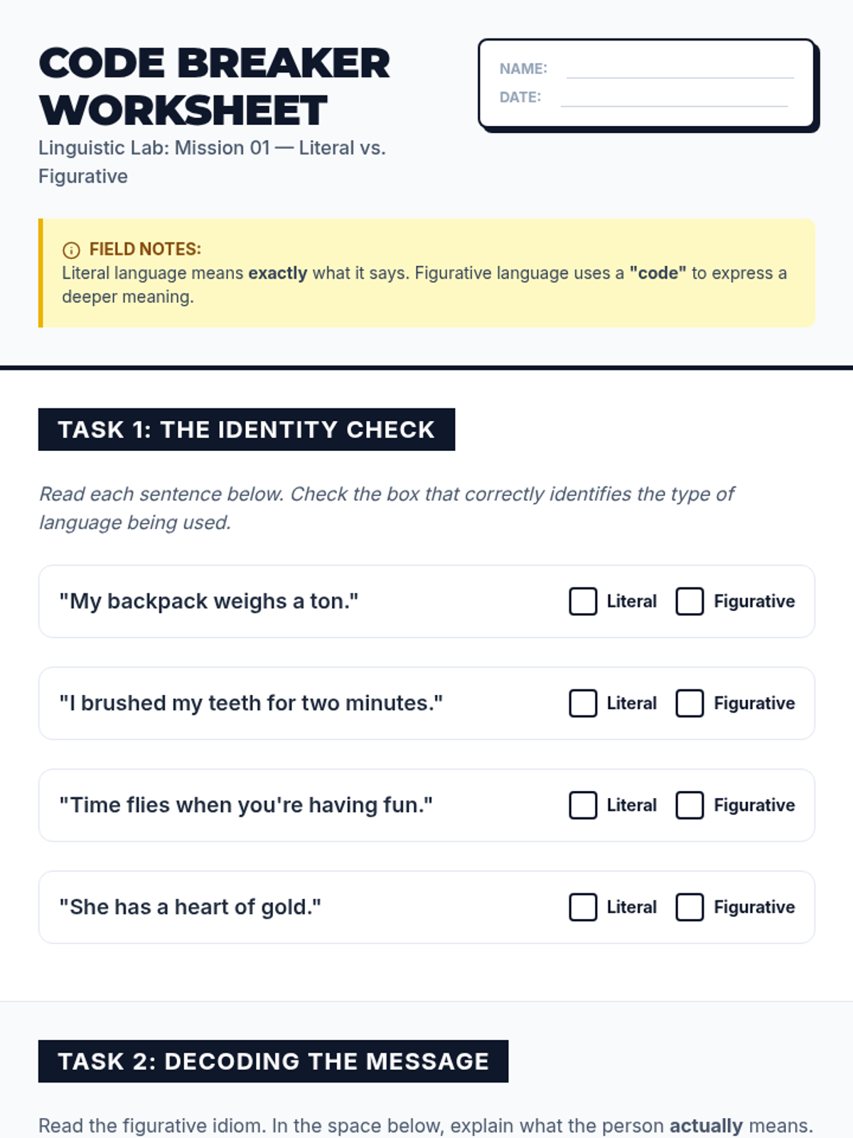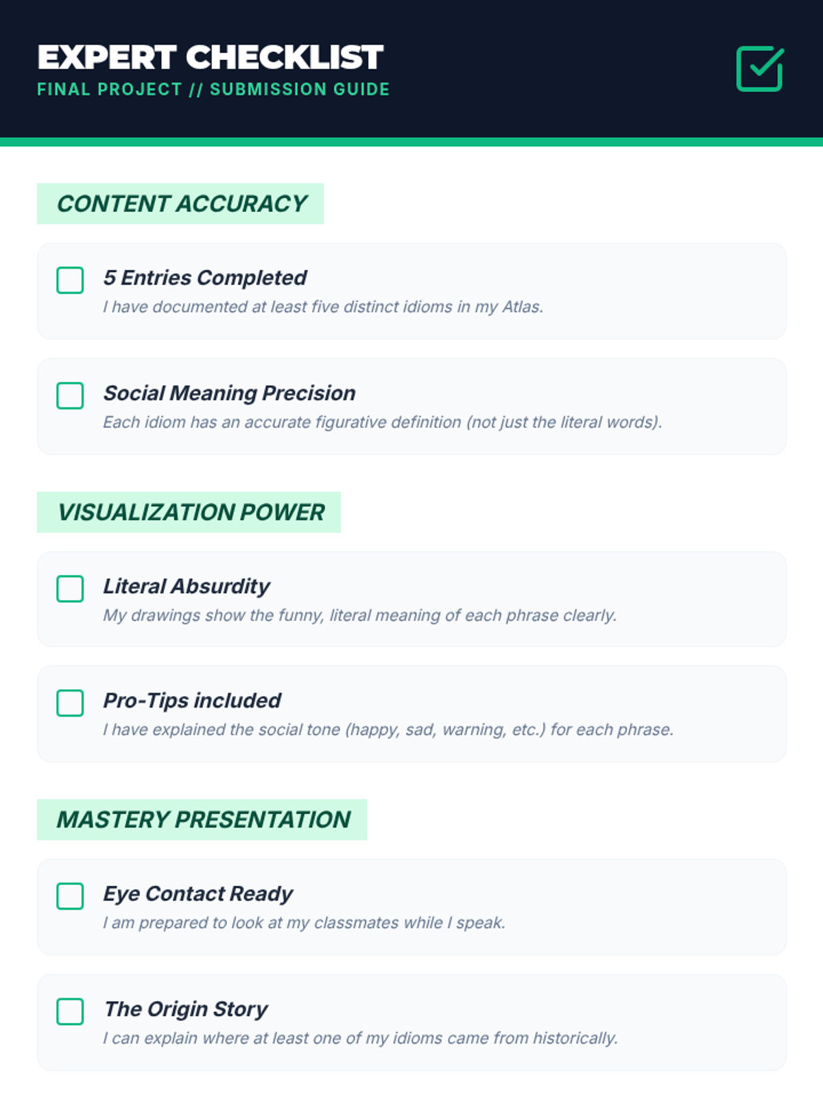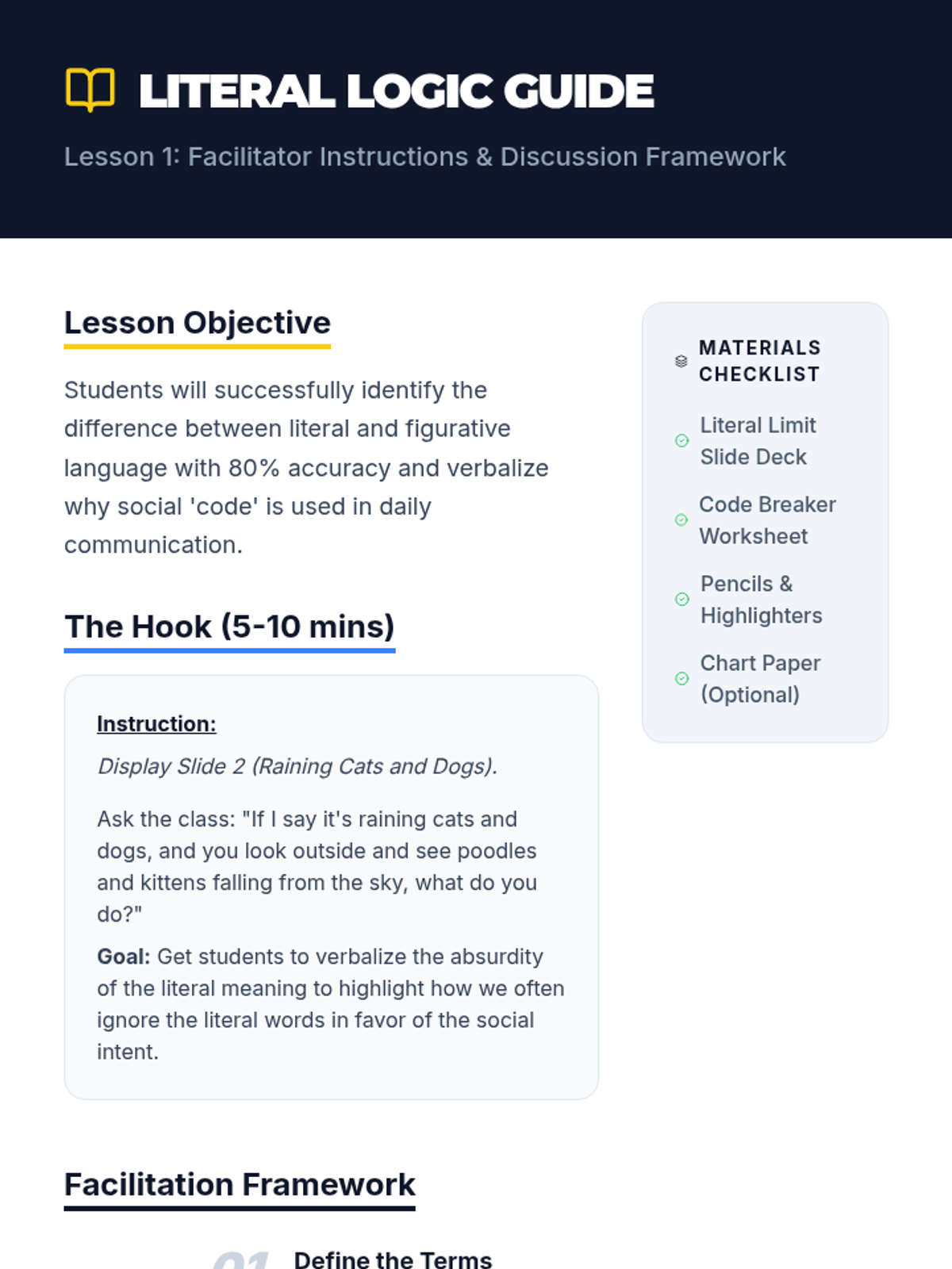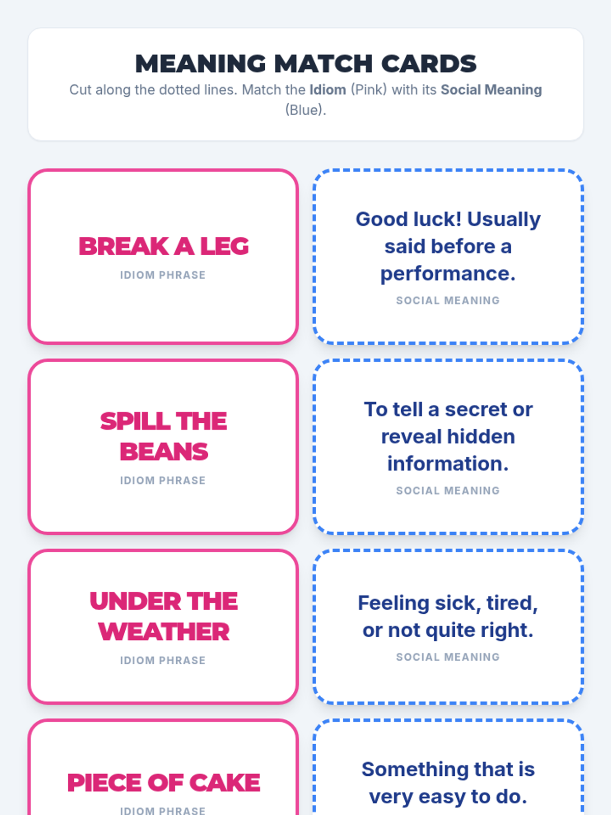 This sequence helps 8th-grade students decode the 'social code' of idioms by contrasting literal and figurative meanings. Students use visualization, contextual analysis, and historical inquiry to master common expressions and create a personal reference guide.