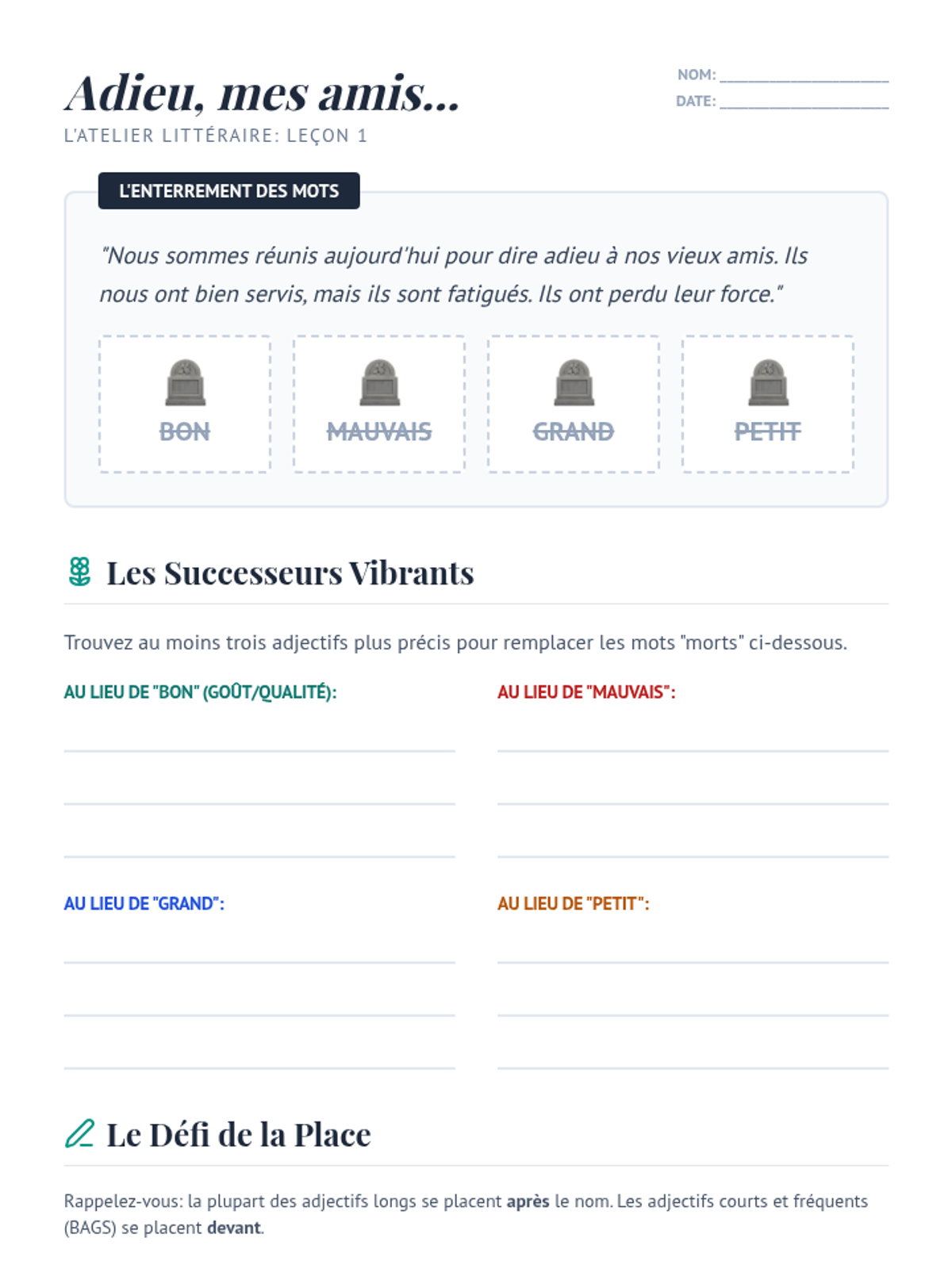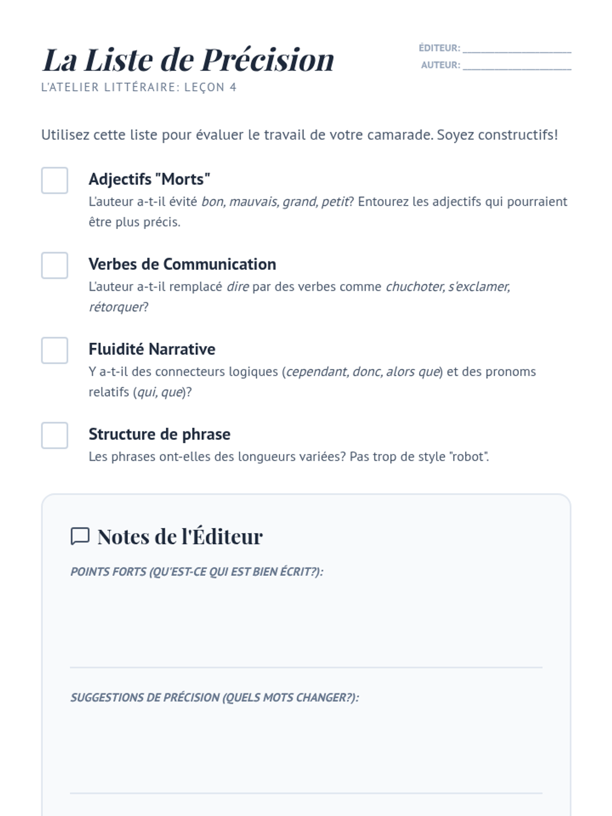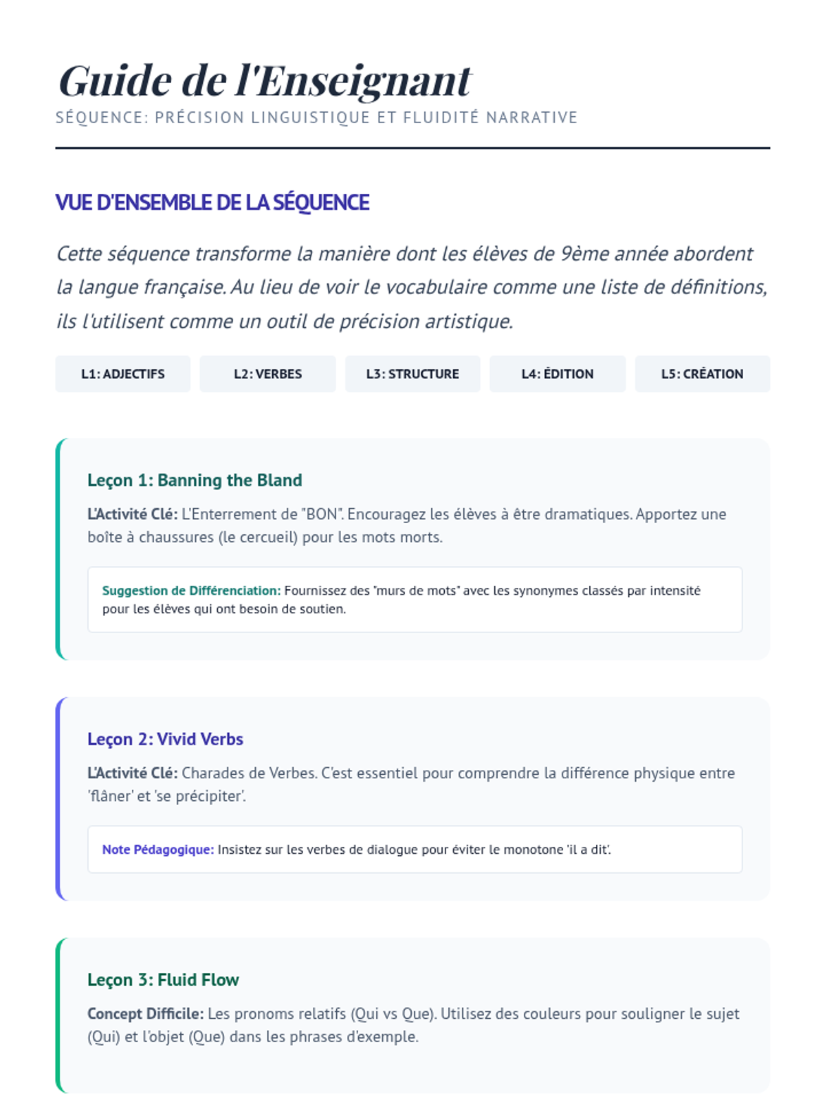 This sequence targets linguistic precision by expanding students' descriptive capabilities beyond basic adjectives and verbs. Through a workshop approach, students learn to replace generic terms with specific, evocative synonyms and improve narrative flow using complex structures.