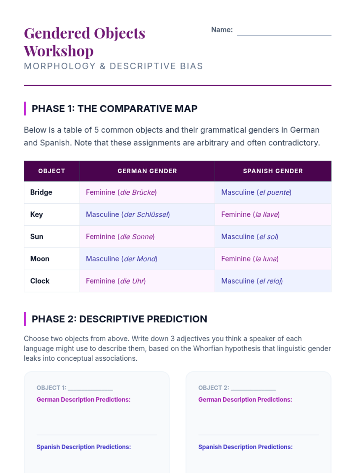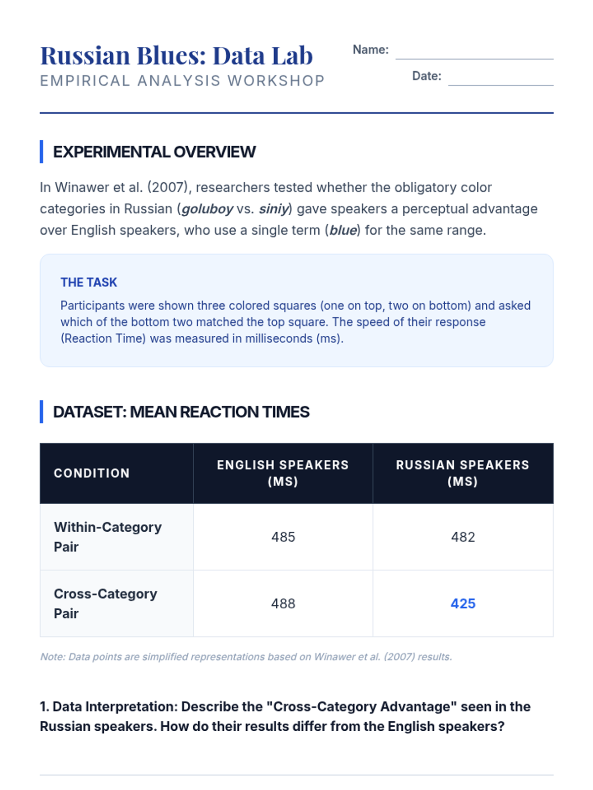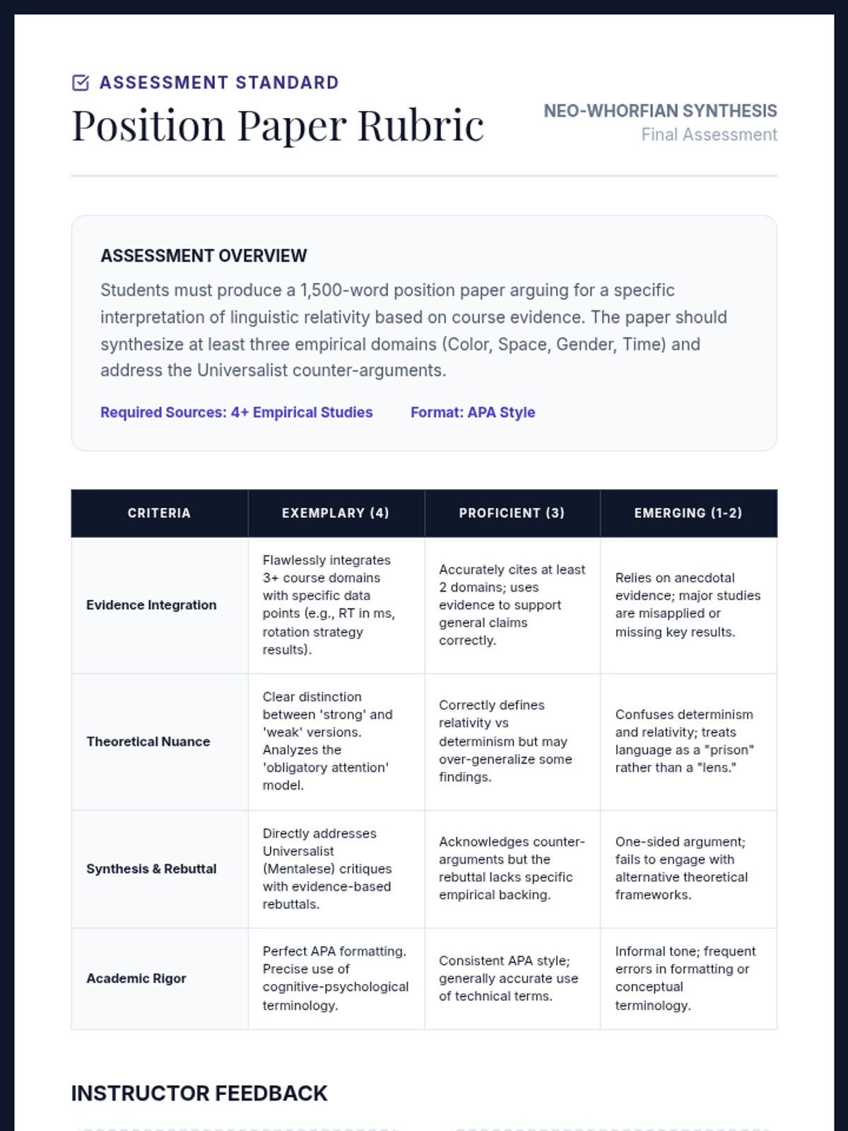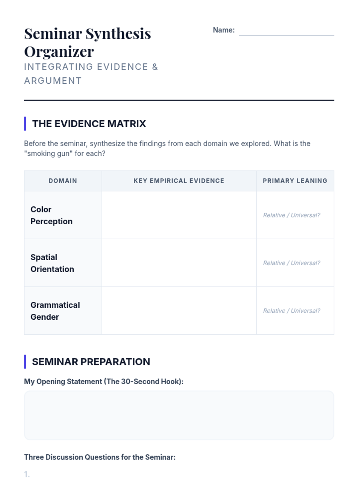 This undergraduate psychology sequence explores the Sapir-Whorf hypothesis, examining how language structures influence cognitive processes like color perception, spatial orientation, and object categorization through historical and modern empirical lenses.