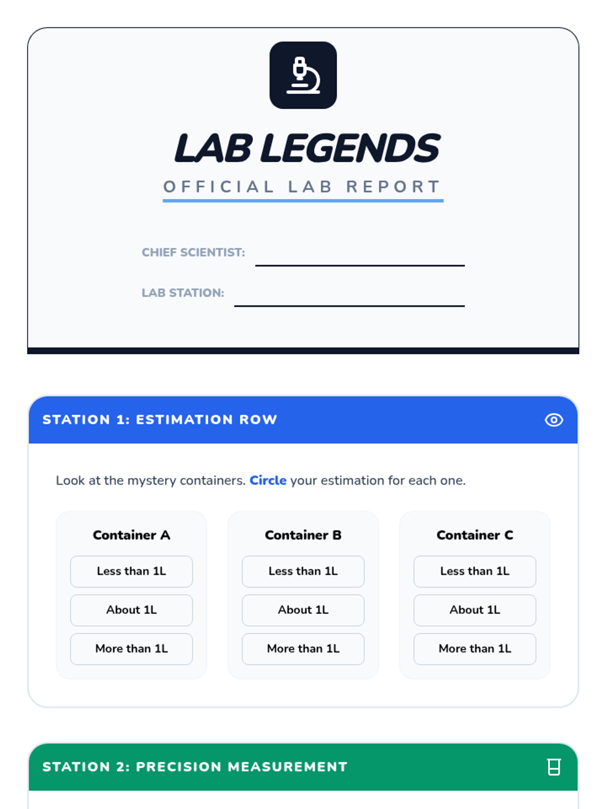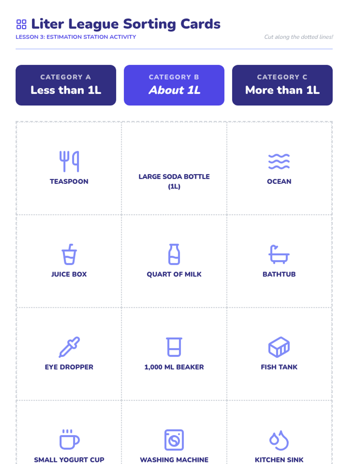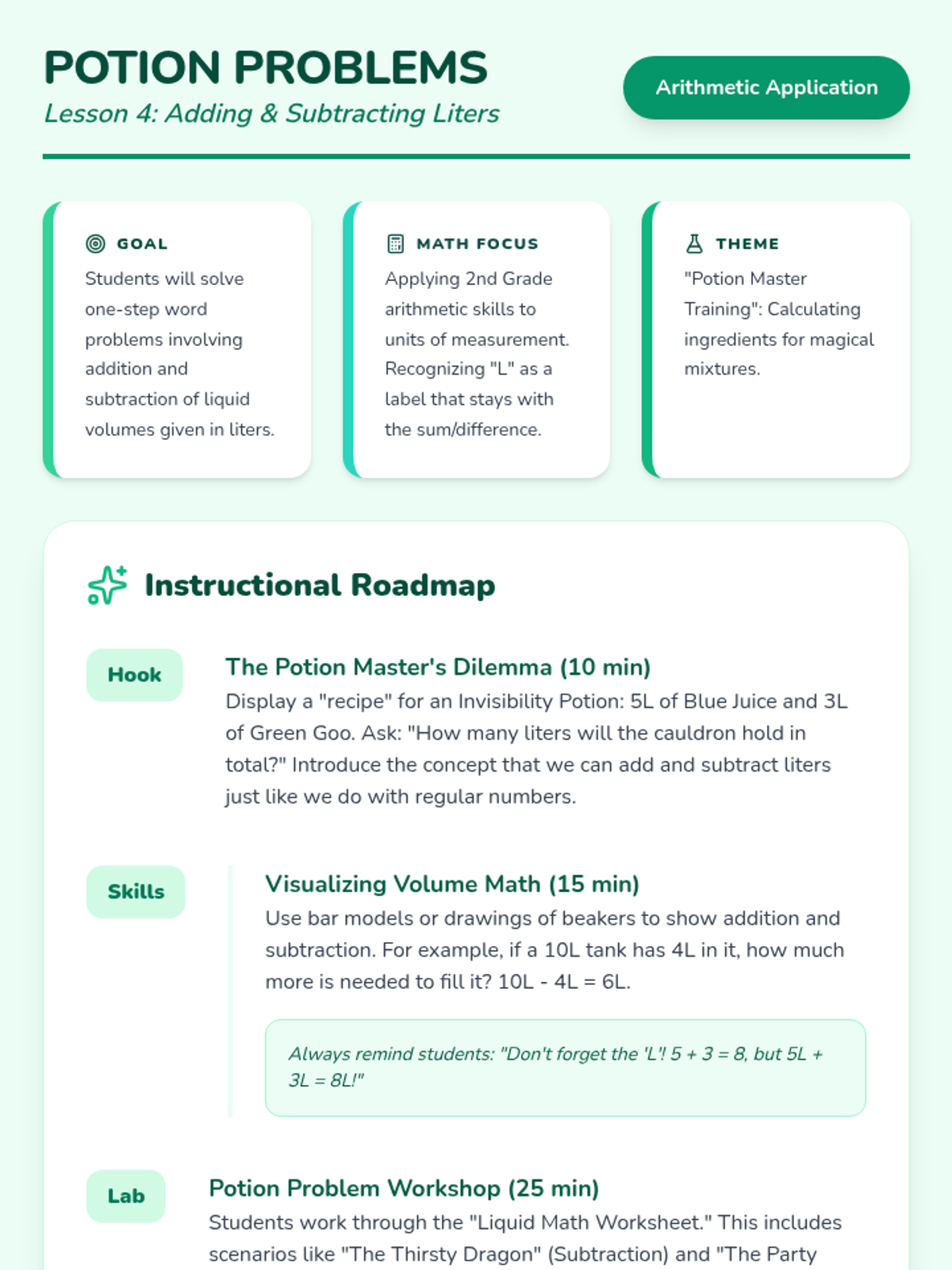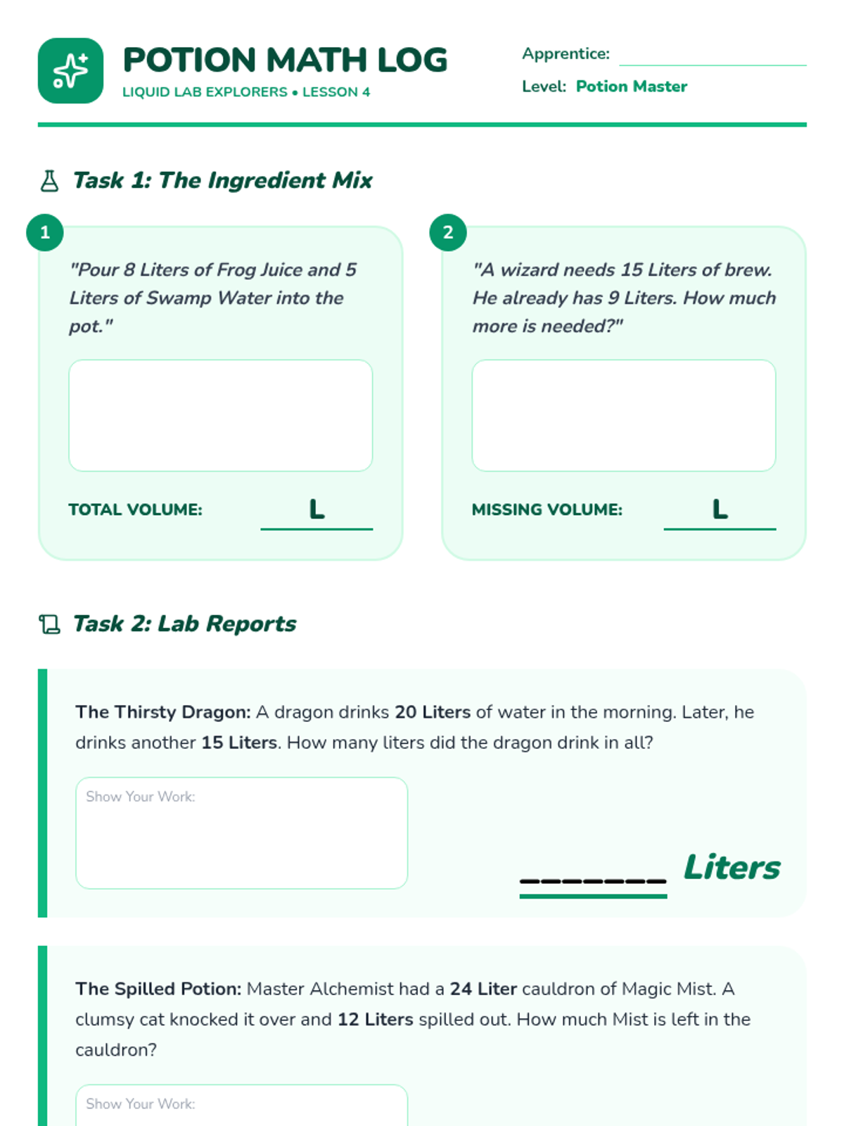A comprehensive unit focused on measuring, estimating, and calculating liquid volumes in liters and masses in grams and kilograms. Students engage in hands-on lab activities and word problem challenges.