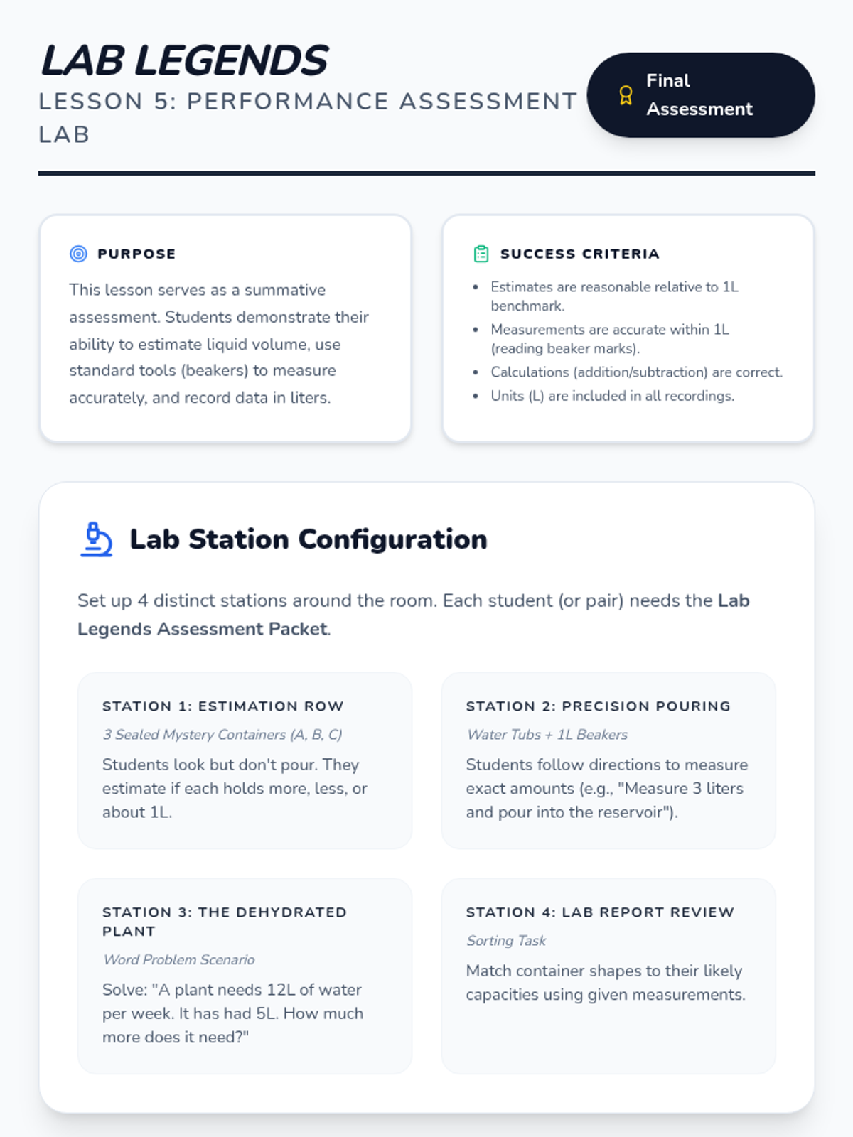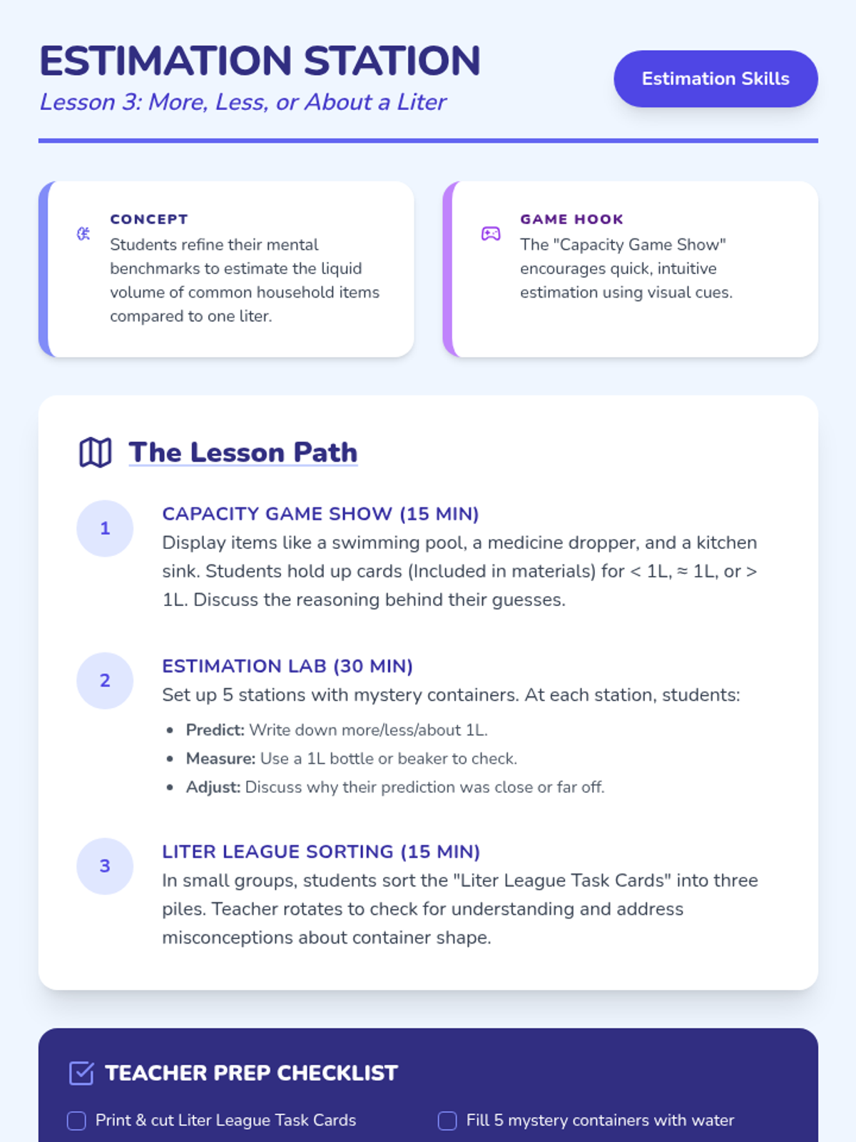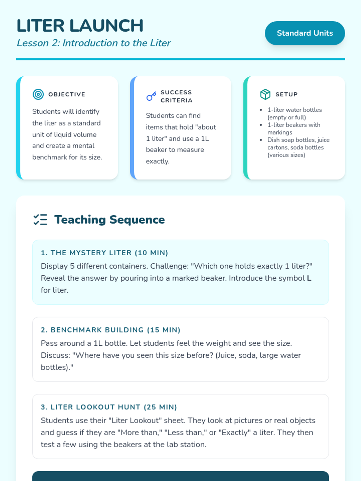 A comprehensive 5-lesson sequence for 2nd Grade students to explore liquid volume and capacity. Students progress from non-standard comparisons to using liters and solving real-world measurement problems through hands-on lab activities.