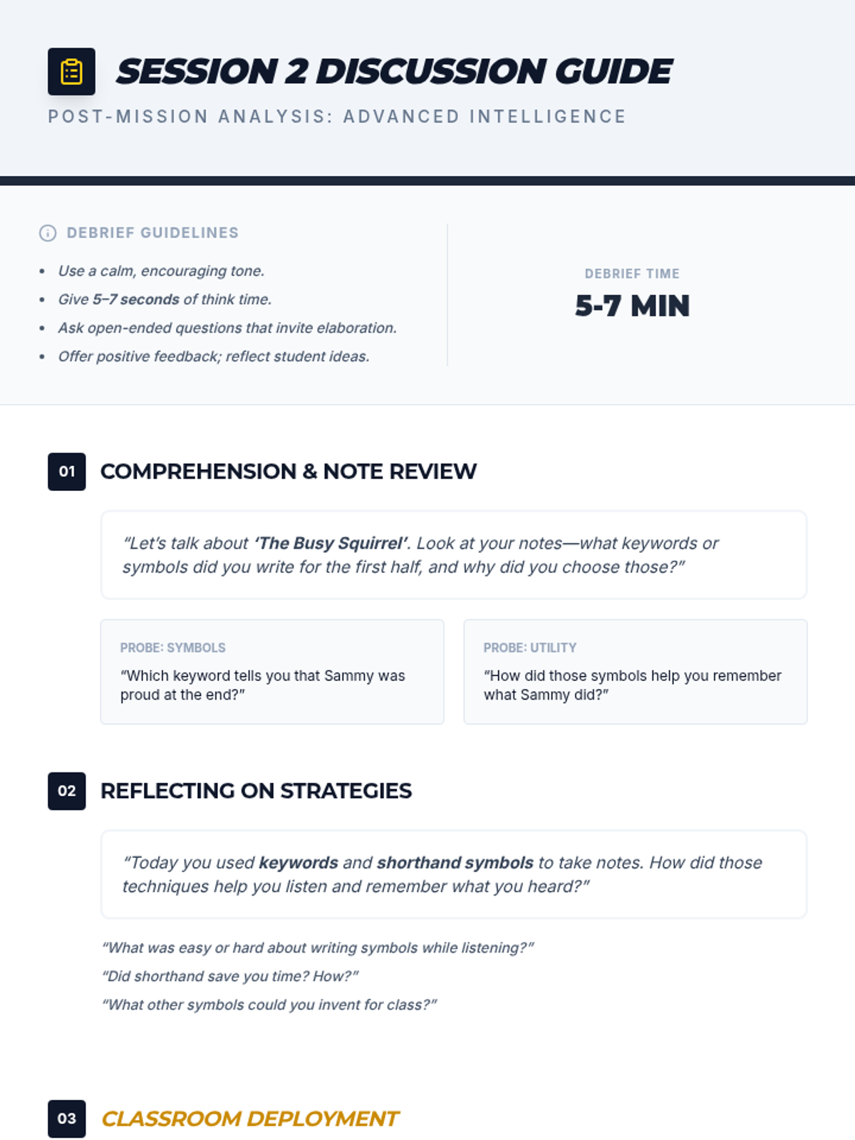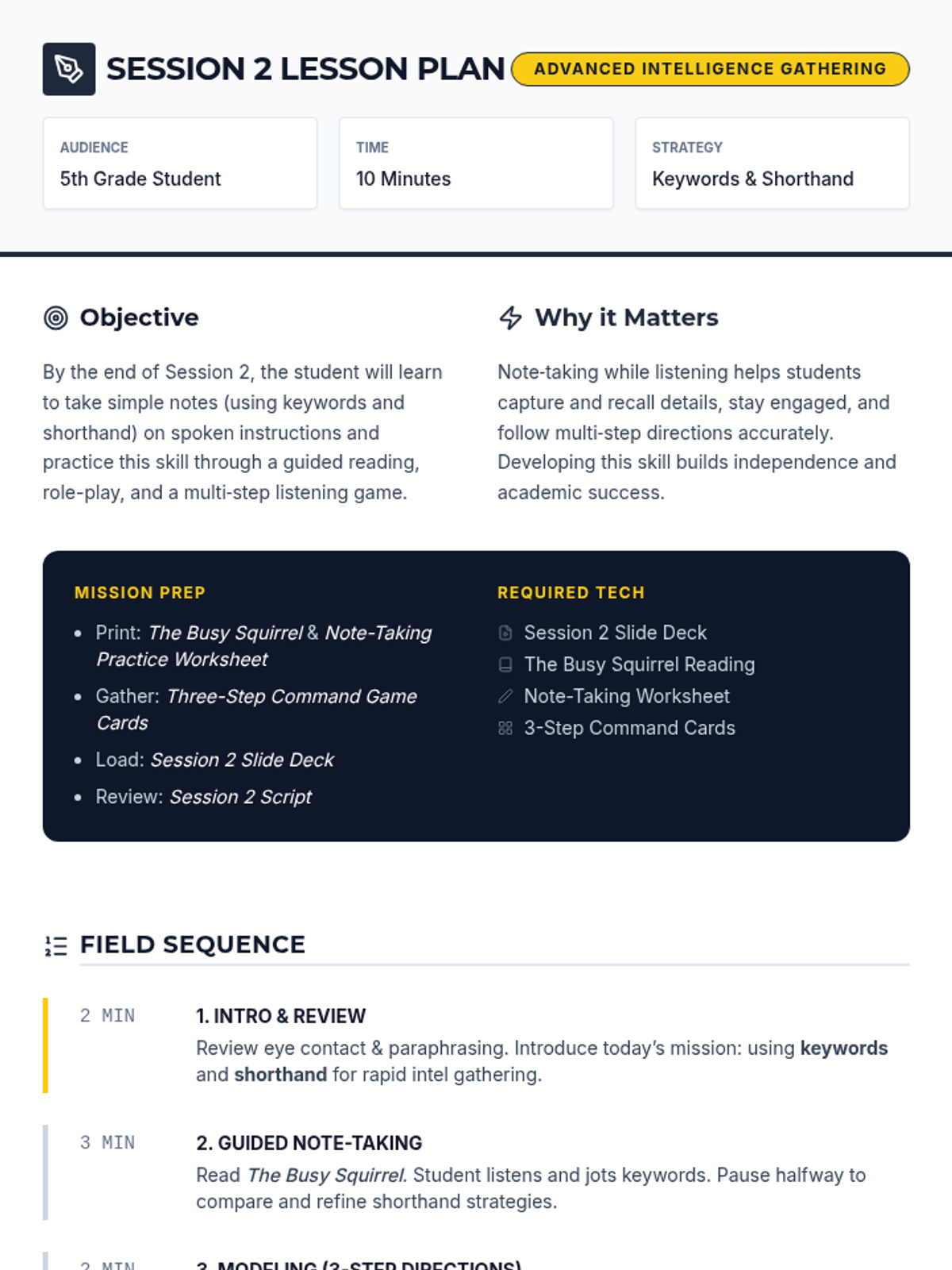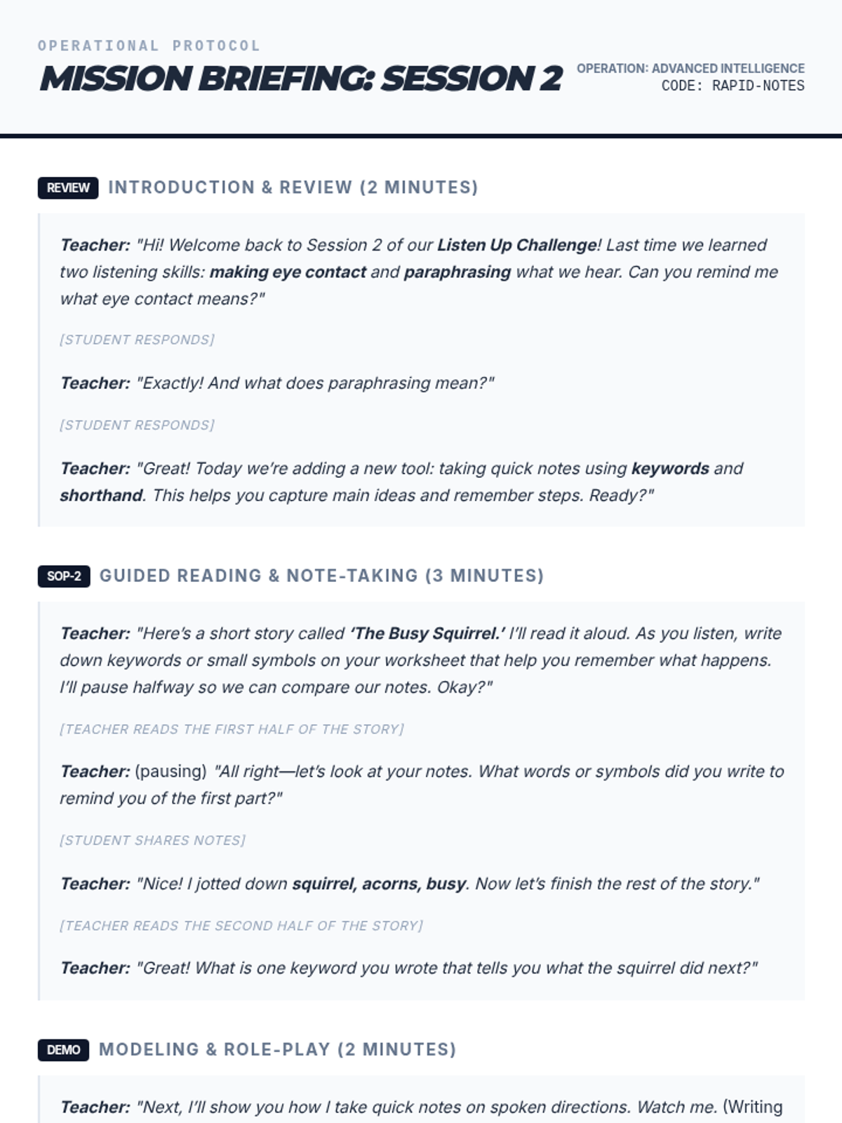 A two-session Tier 3 intervention for 5th-grade students focused on active listening strategies, including eye contact, paraphrasing, and note-taking to improve classroom success.