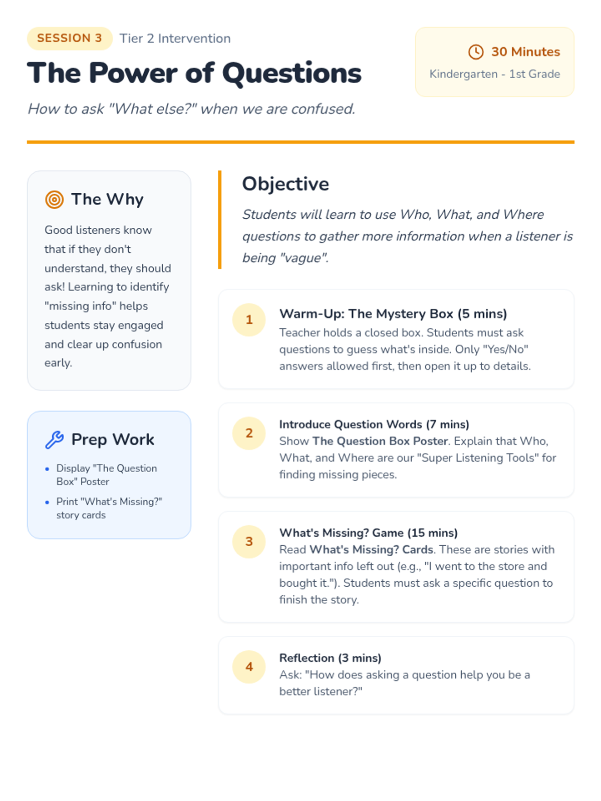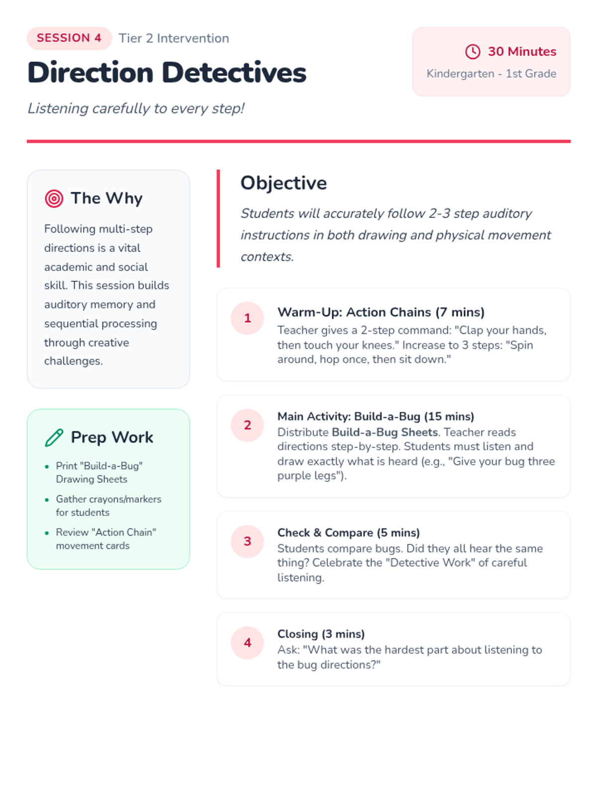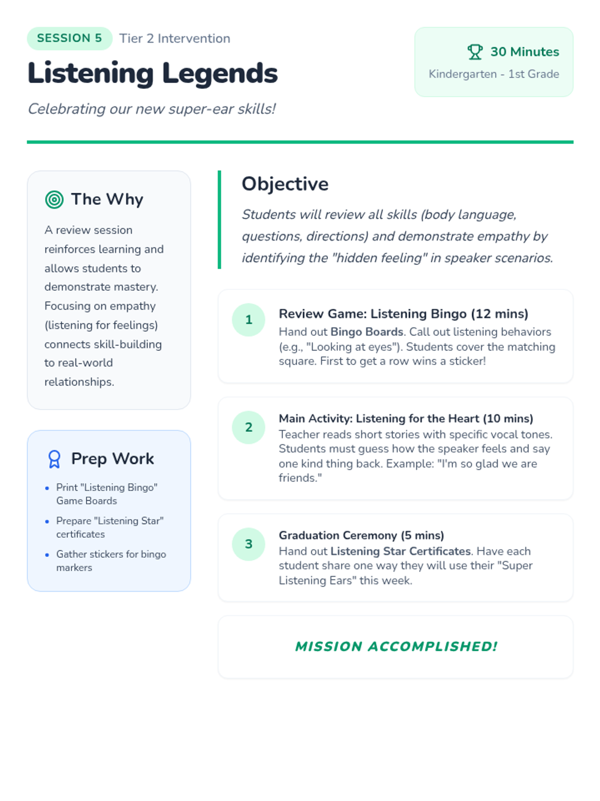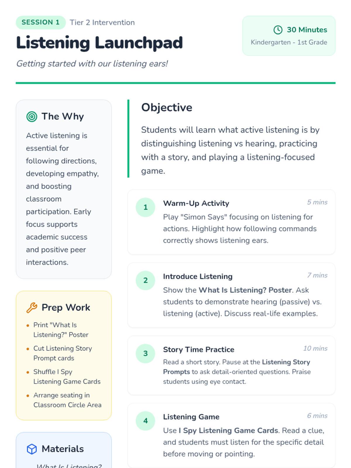 A 5-session Tier 2 intervention for K-1 students focusing on active listening, nonverbal cues, clarifying questions, following directions, and empathy. Students develop foundational communication skills through engaging games and visual supports.