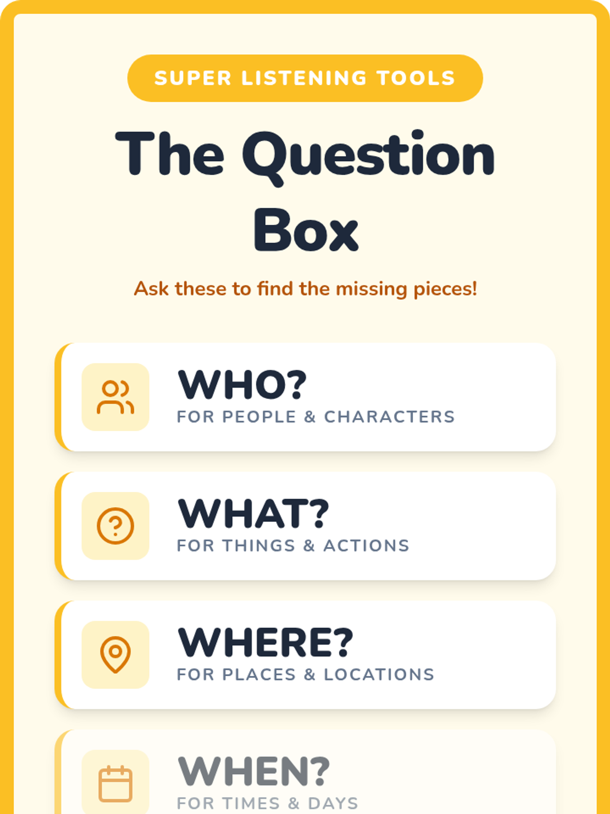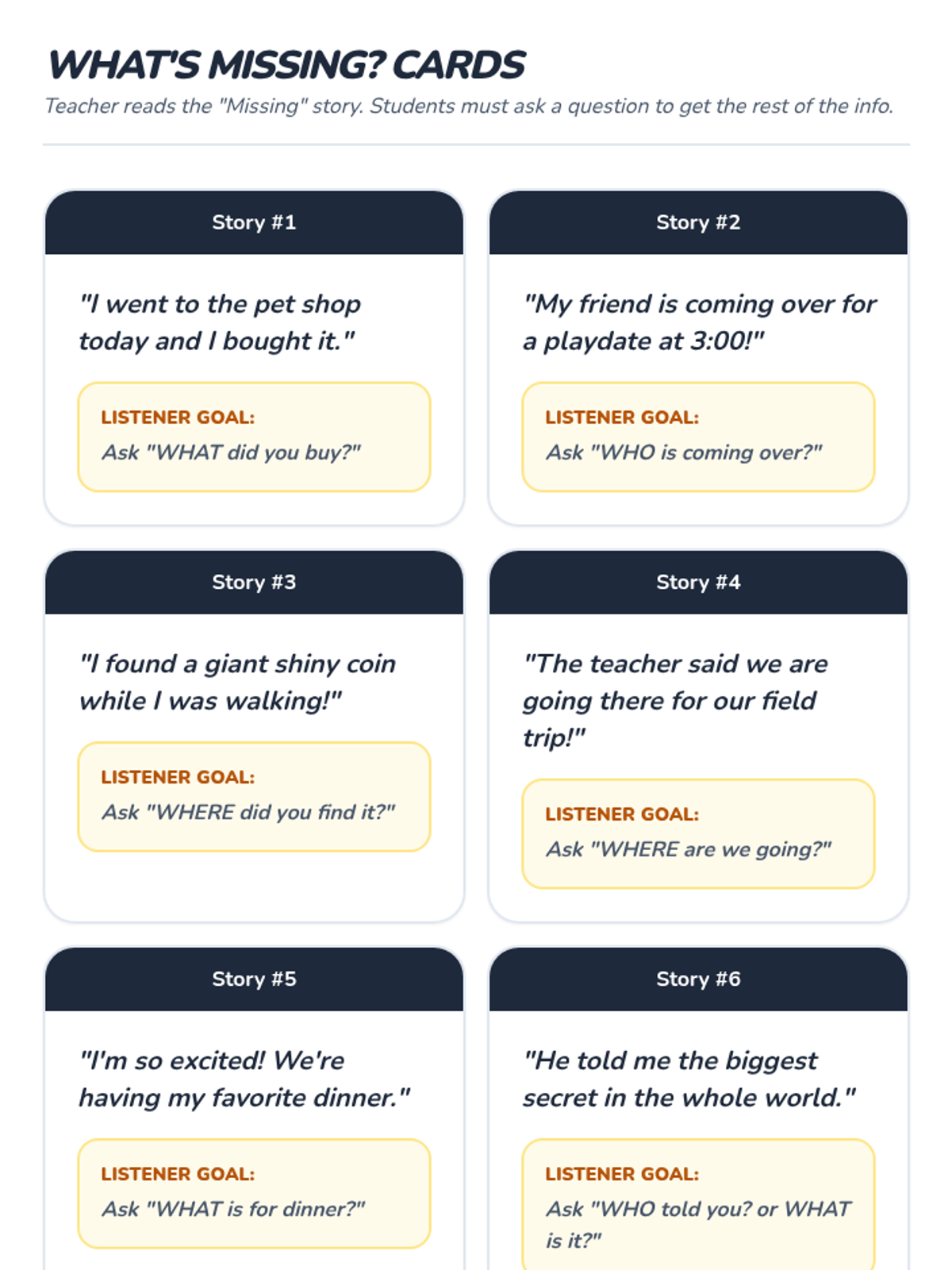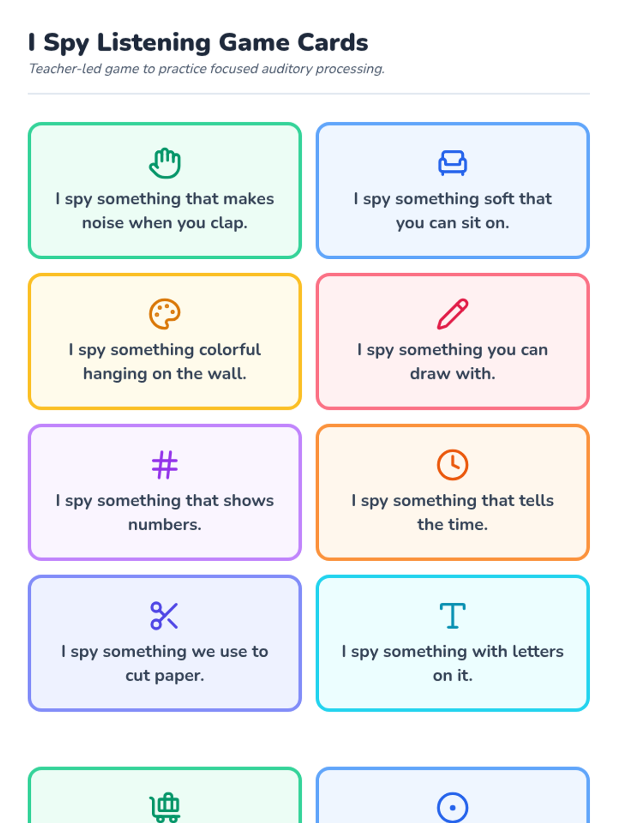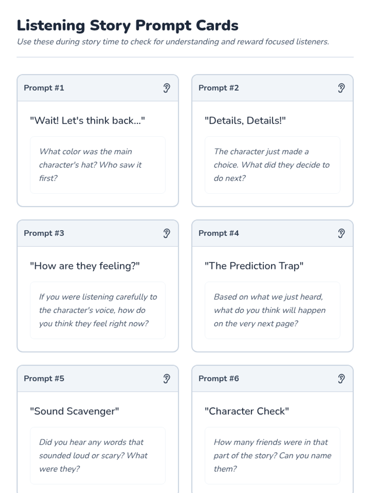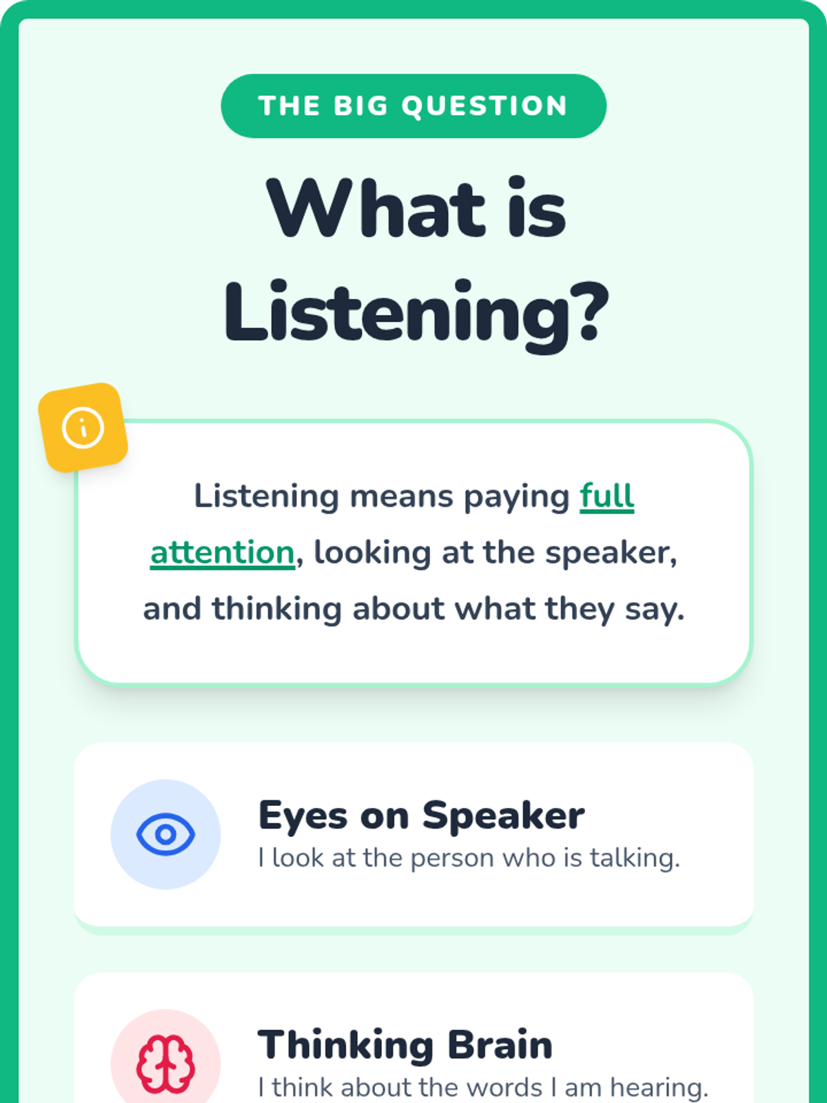 A 5-session Tier 2 intervention for K-1 students focusing on active listening, nonverbal cues, clarifying questions, following directions, and empathy. Students develop foundational communication skills through engaging games and visual supports.