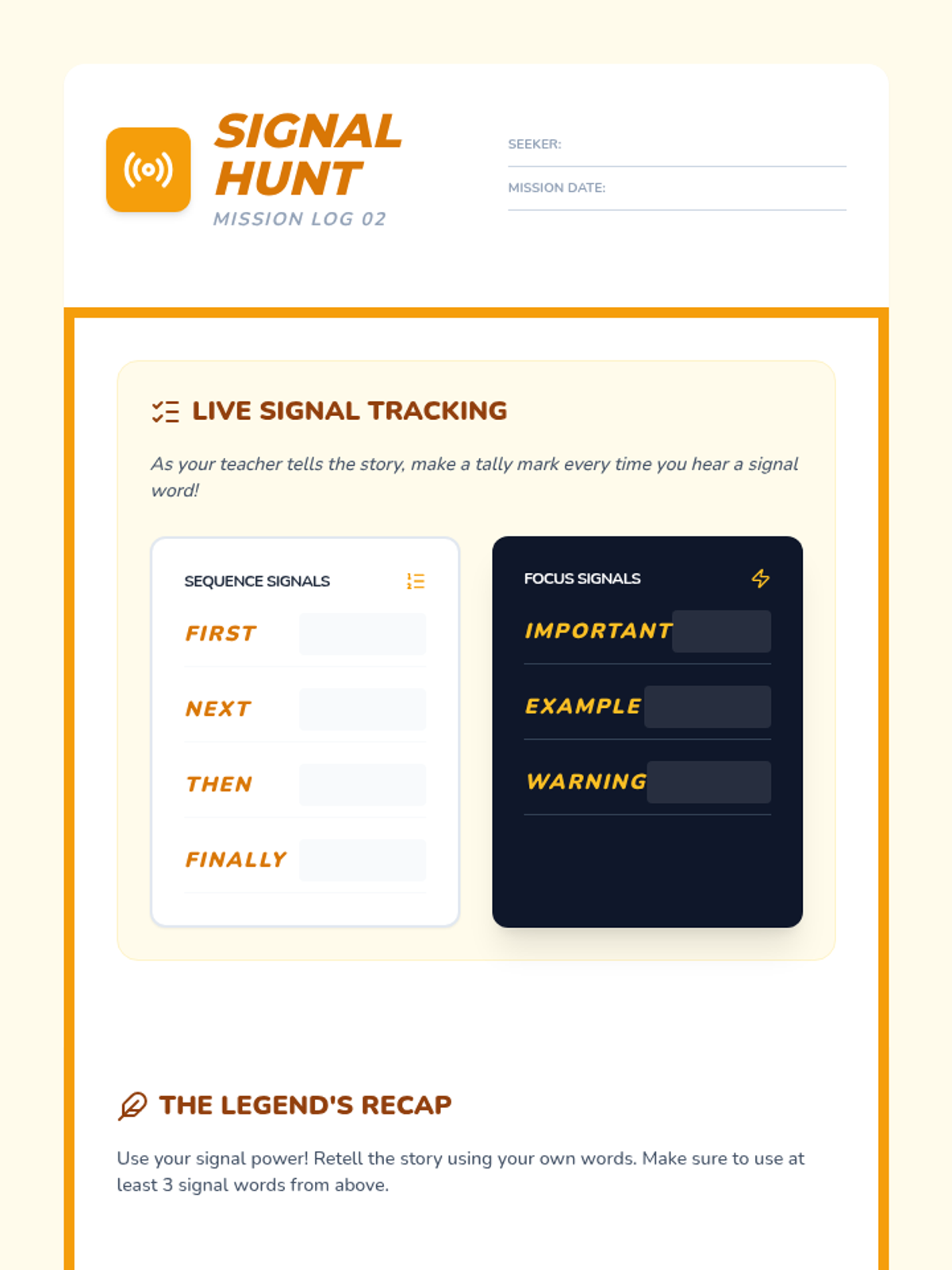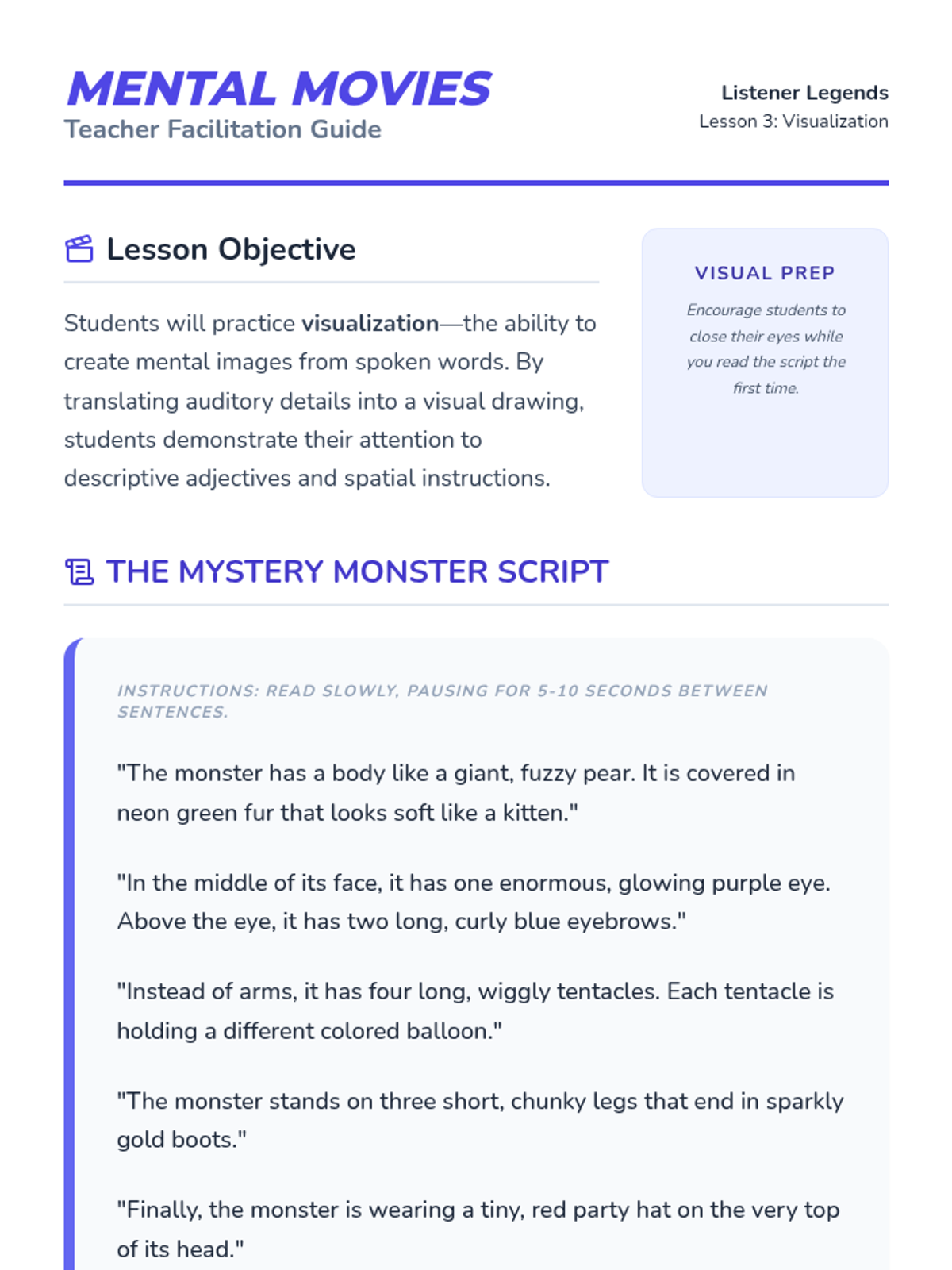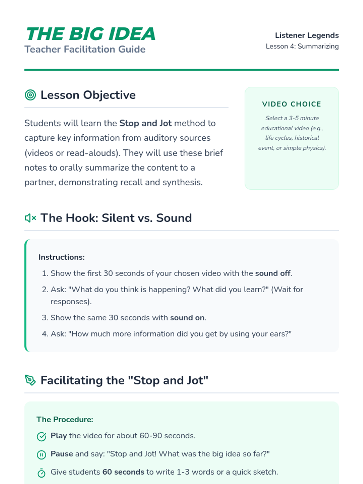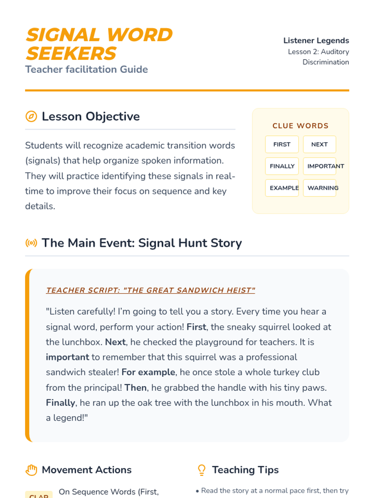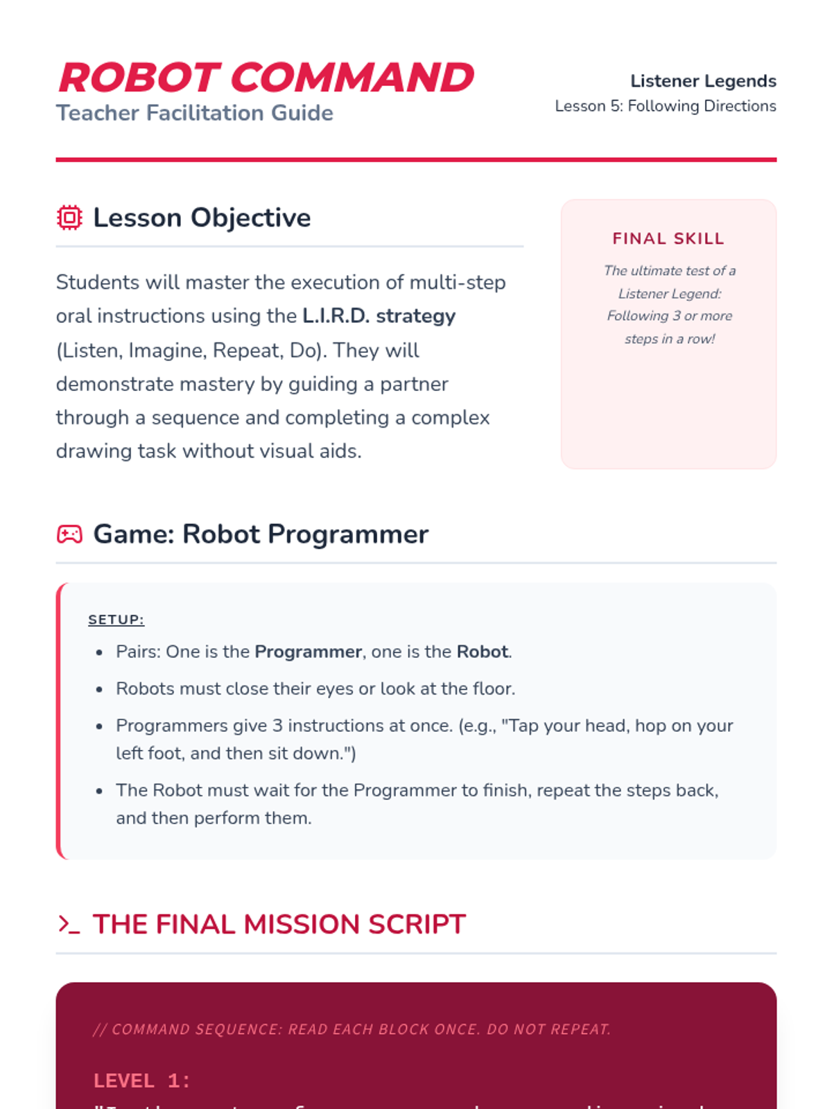 A 5-lesson unit for 3rd graders focused on active listening, identifying signal words, visualizing information, summarizing spoken content, and following multi-step directions. Students transition from physical listening habits to complex auditory processing through interactive simulations and games.
