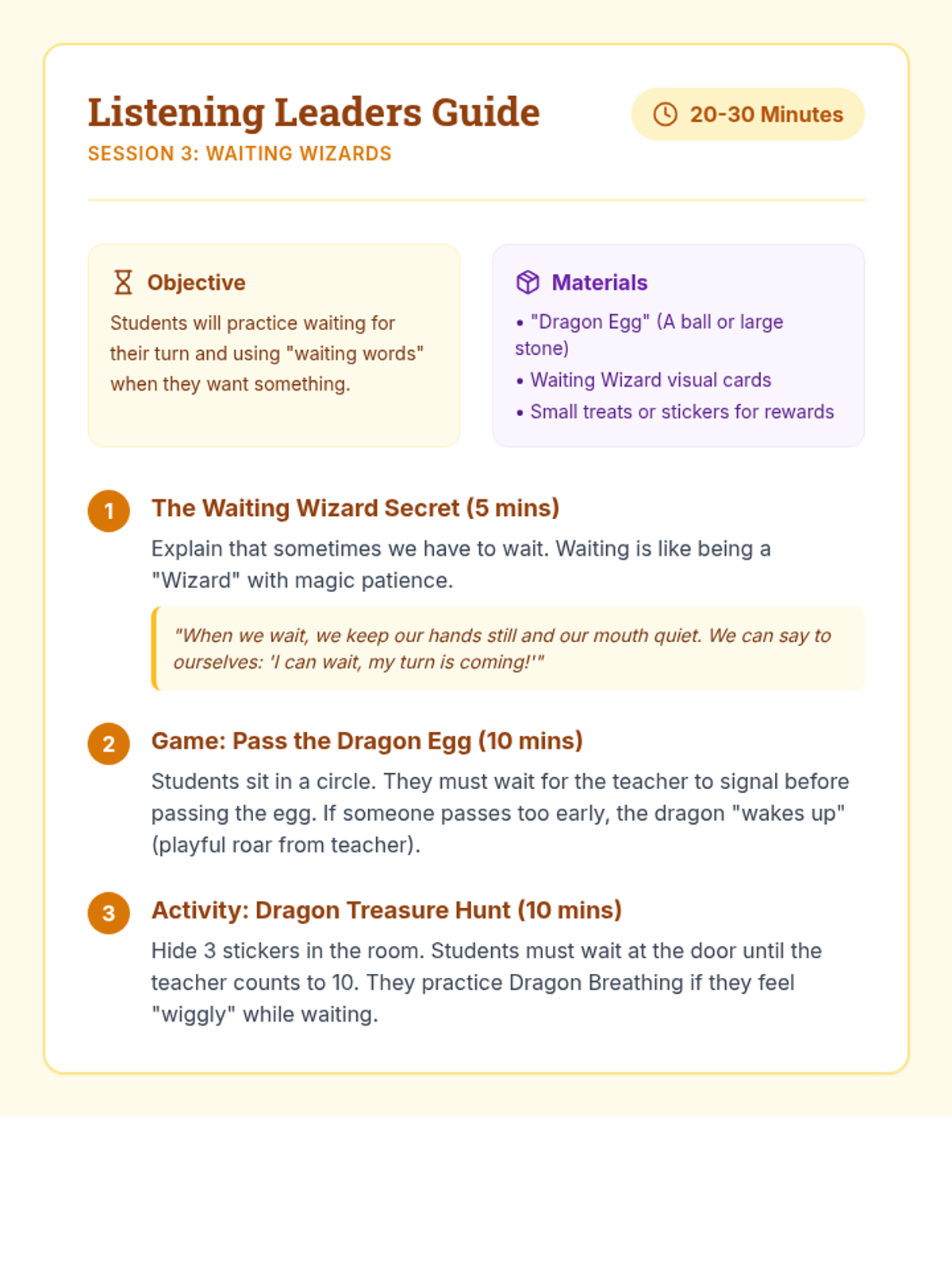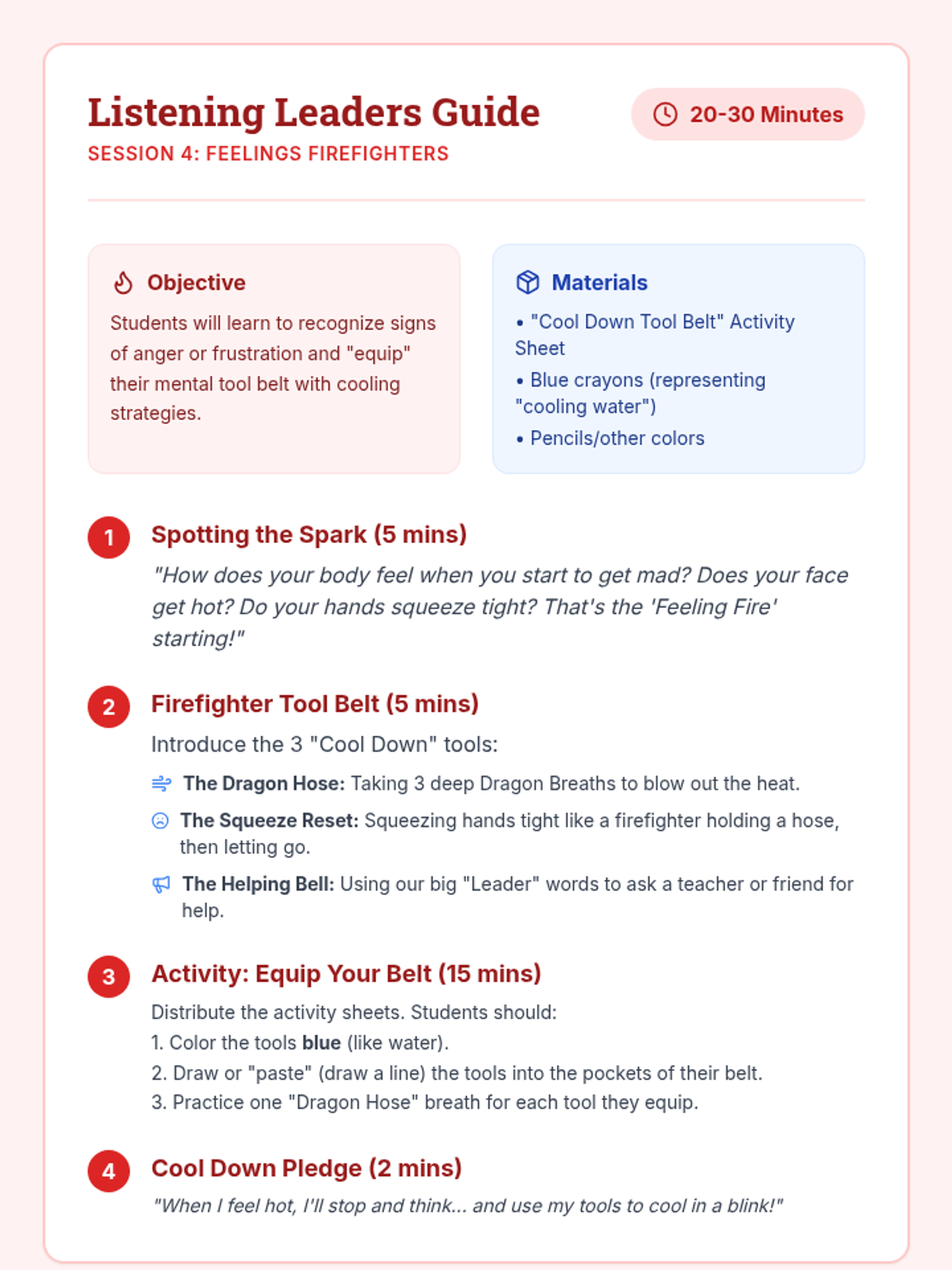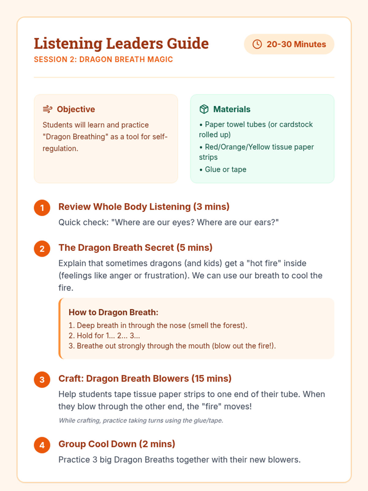 A 6-session social-emotional learning group for kindergarteners focusing on listening skills, impulse control, and emotional regulation through a fun dragon-themed lens. Students learn 'Dragon Breathing' and other 'Leader' skills to help them navigate the classroom environment.