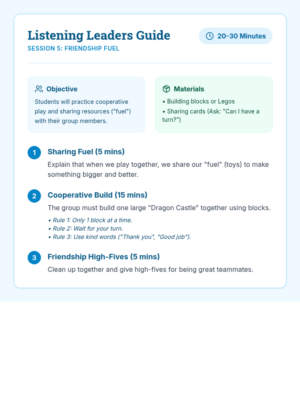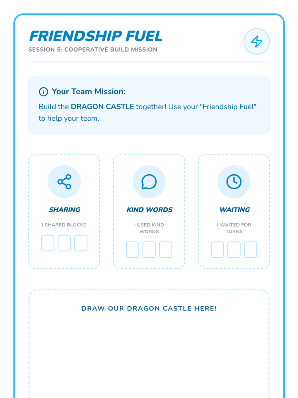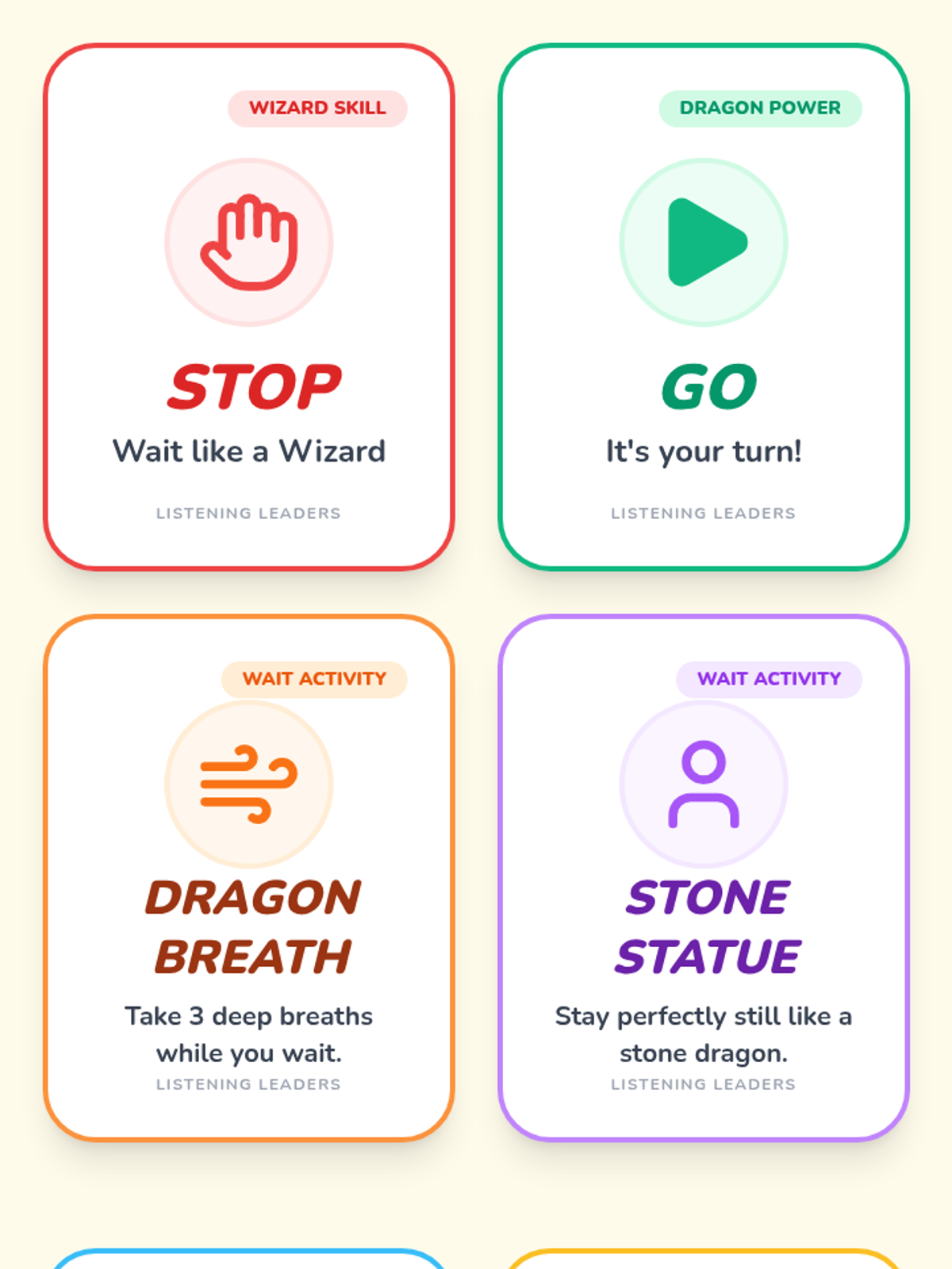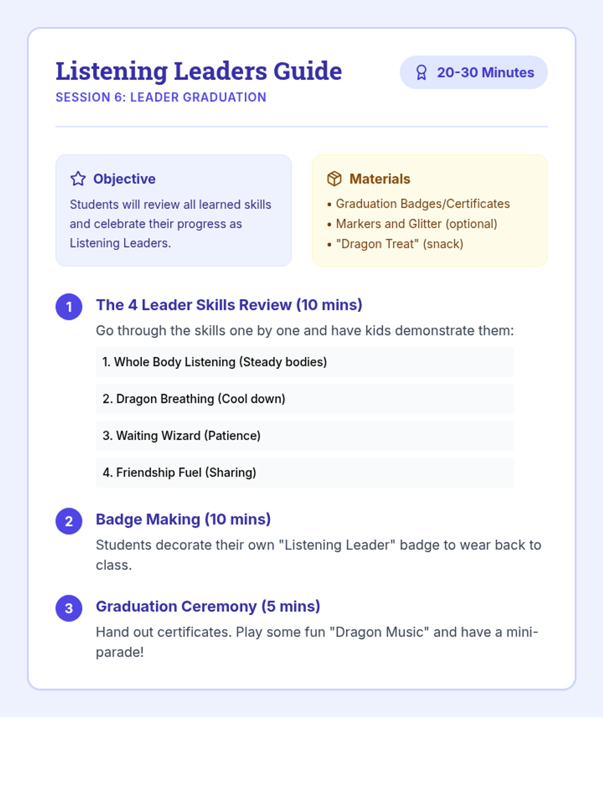 A 6-session social-emotional learning group for kindergarteners focusing on listening skills, impulse control, and emotional regulation through a fun dragon-themed lens. Students learn 'Dragon Breathing' and other 'Leader' skills to help them navigate the classroom environment.