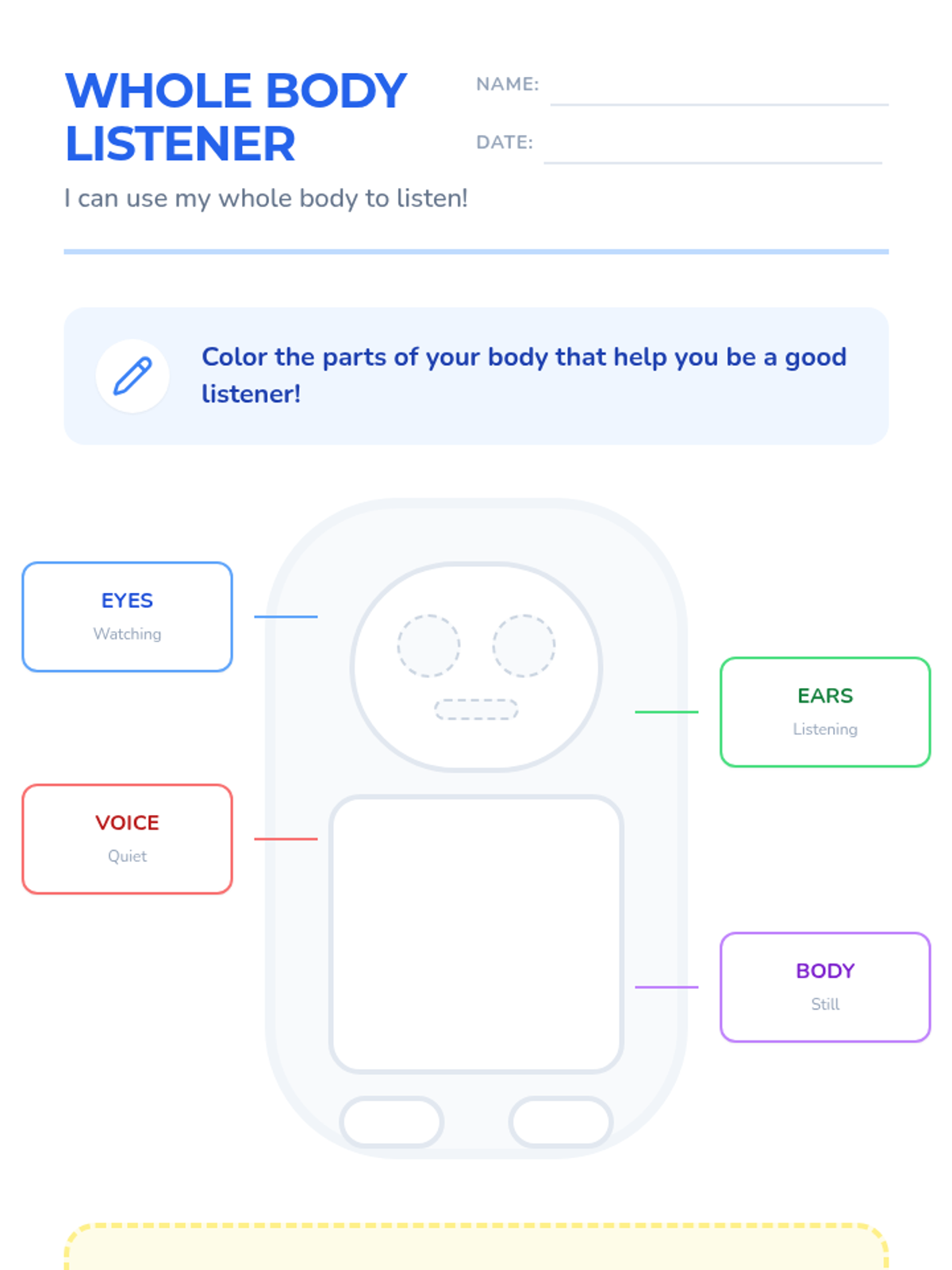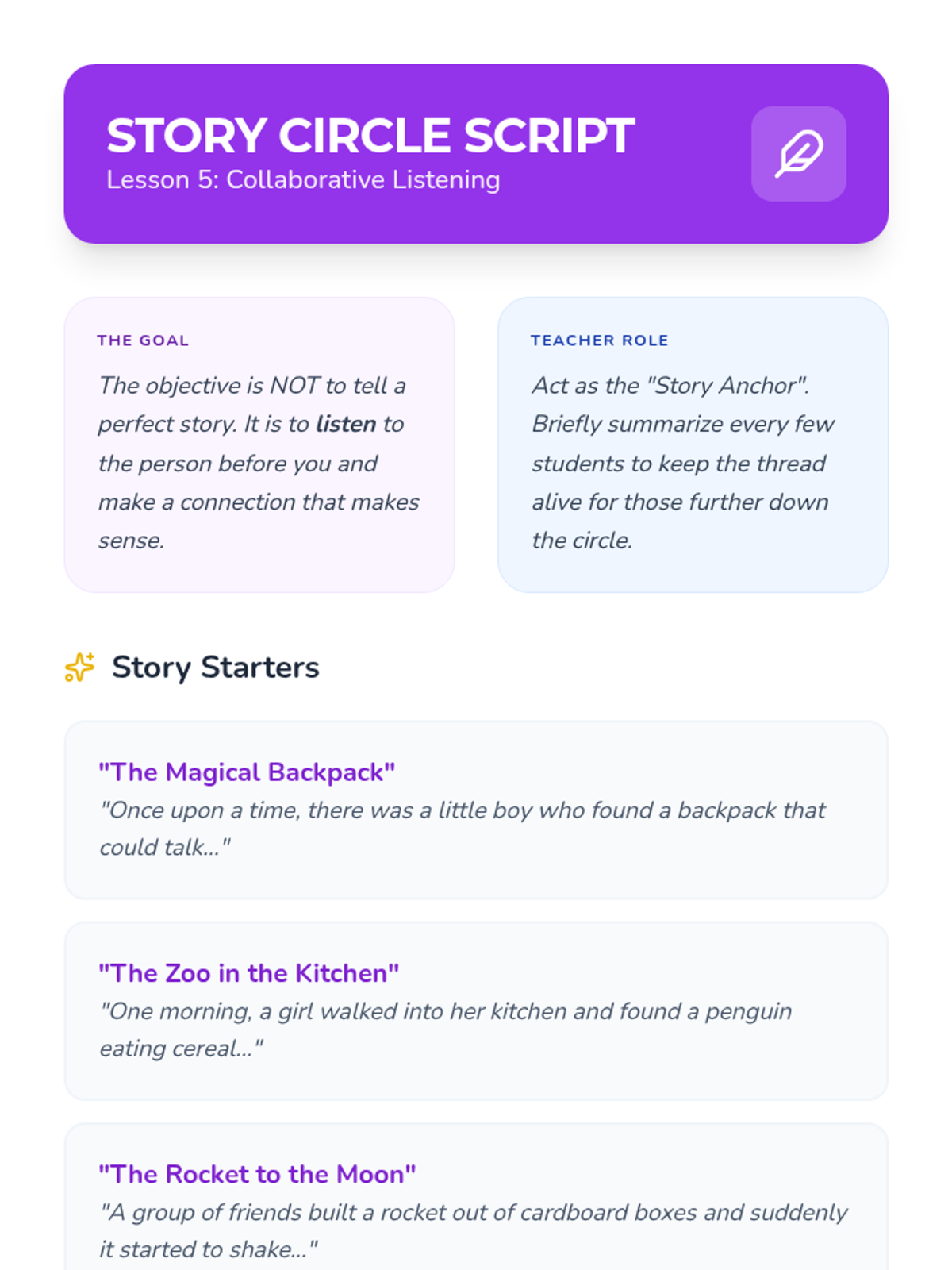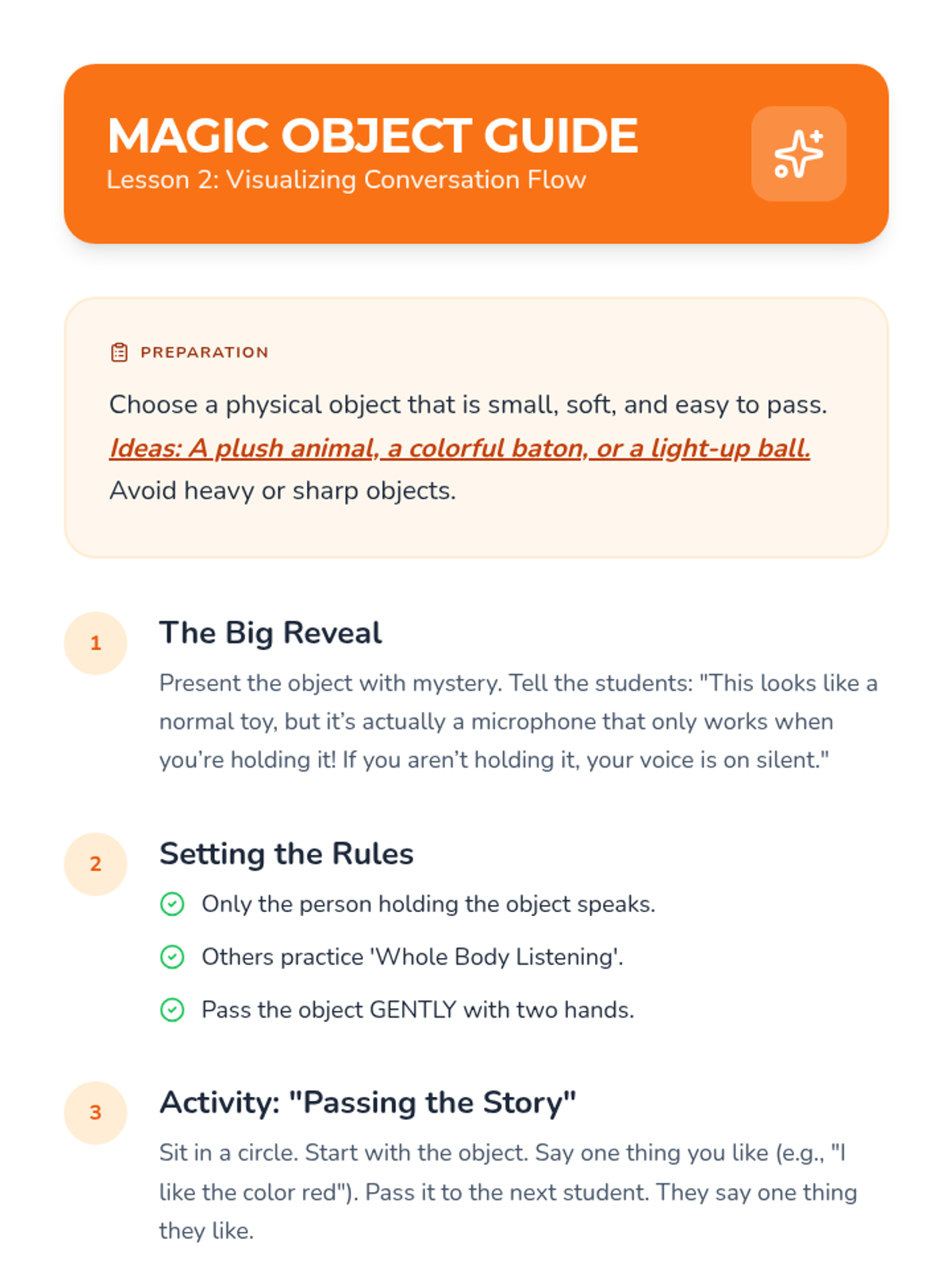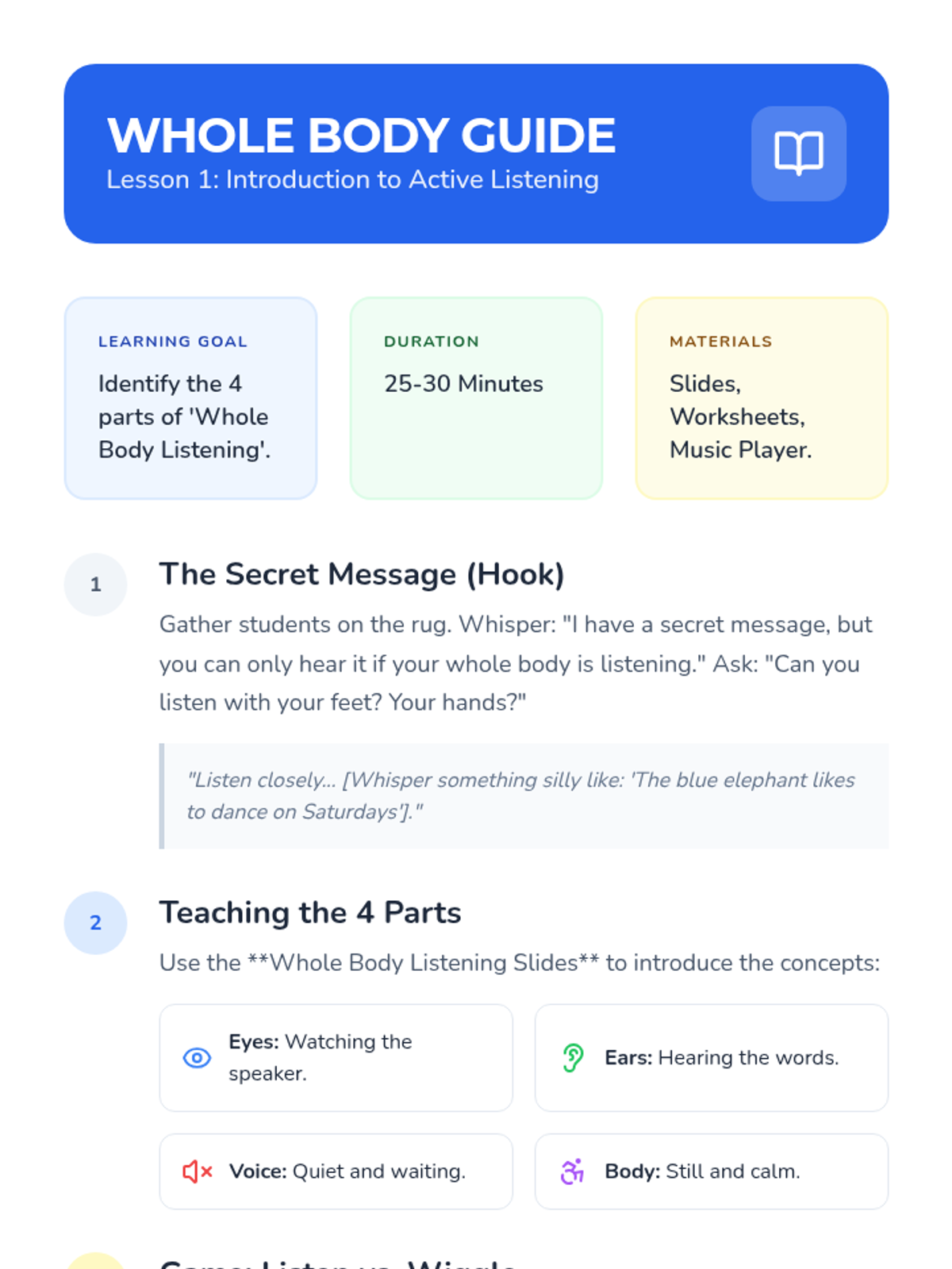This sequence introduces Kindergarten students to active listening and respectful turn-taking. Students learn 'Whole Body Listening', use concrete objects to manage conversation flow, practice echoing peers, follow multi-step directions, and participate in collaborative storytelling.
