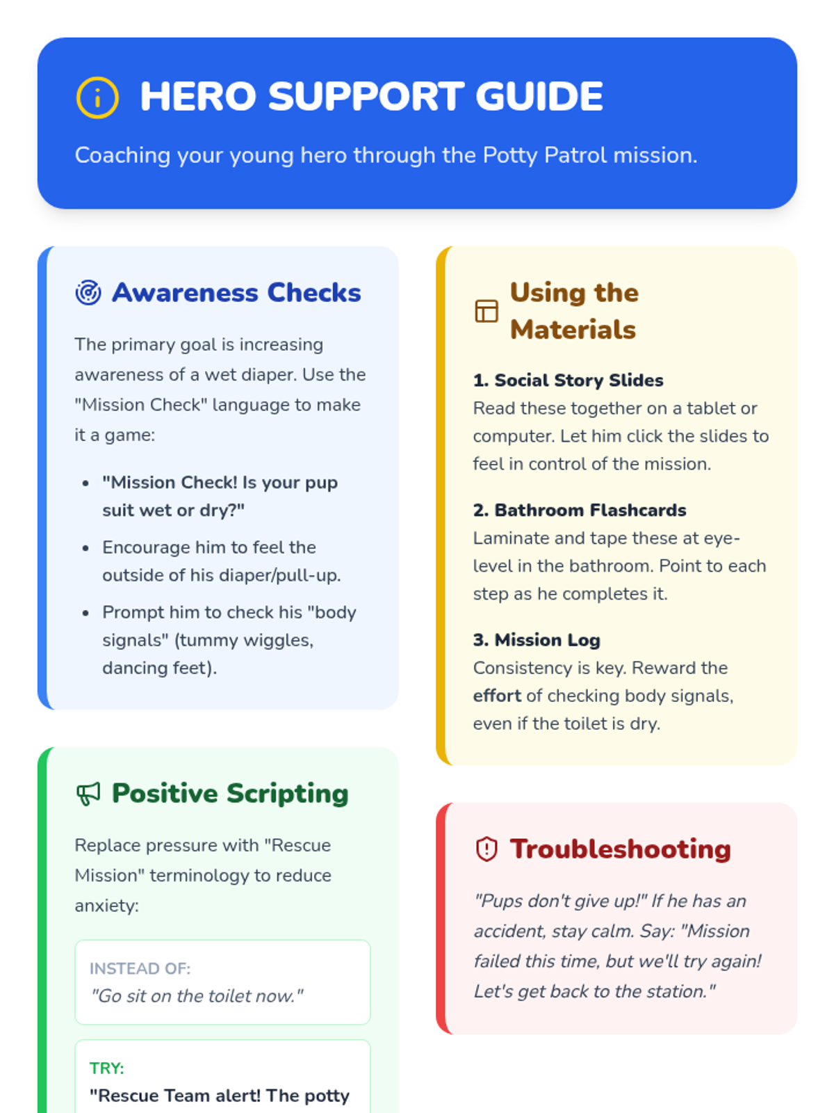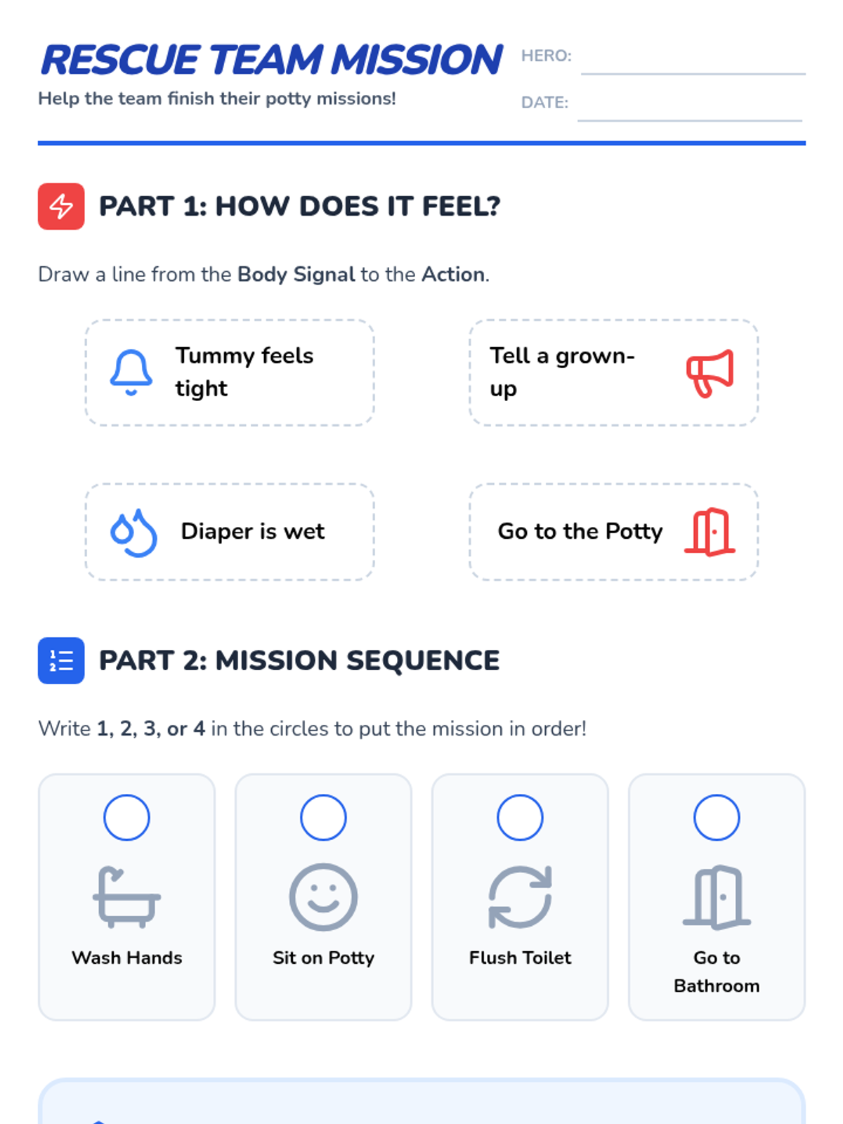 A series of interactive and printable resources designed to help a child master toileting skills through a 'Rescue Mission' theme. The sequence focuses on body awareness, the step-by-step process of using the toilet, and positive reinforcement.