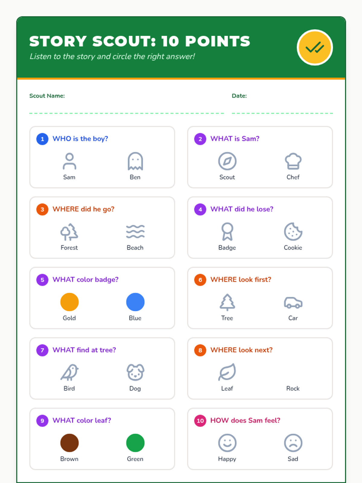 A series of scout-themed speech therapy lessons focusing on phonological awareness, comprehension, and cognitive communication for early elementary students.