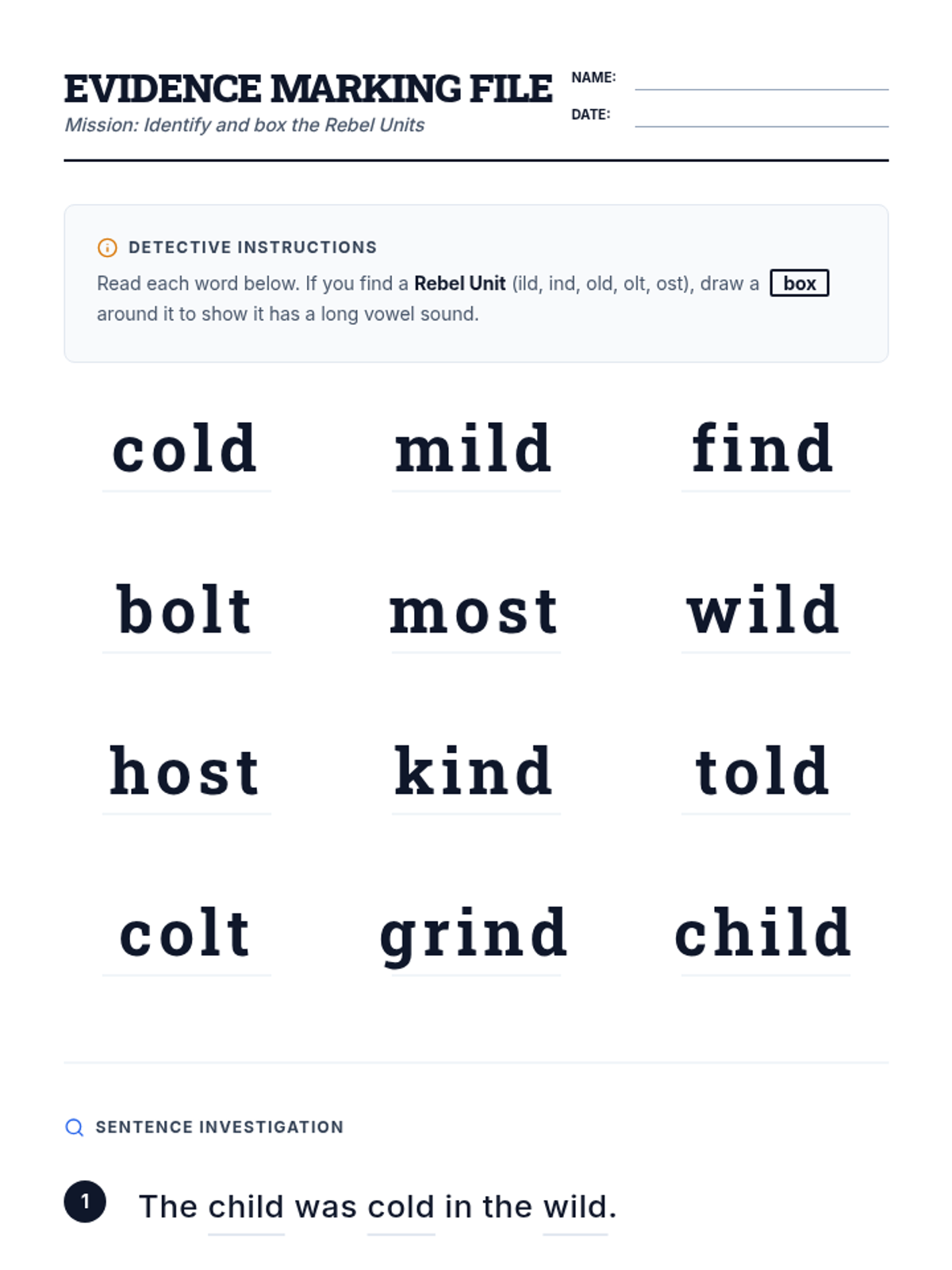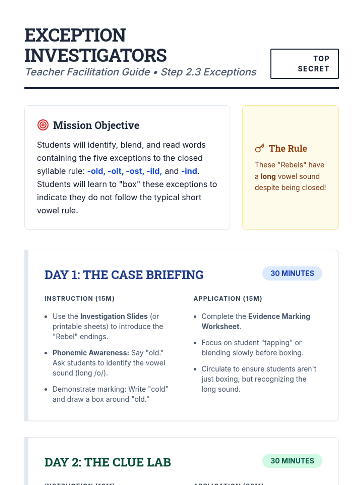A three-day instructional sequence for Wilson Reading System Step 2.3, focusing on closed syllable exceptions (old, olt, ost, ild, ind) through detective-themed instruction, word work, and reading comprehension.