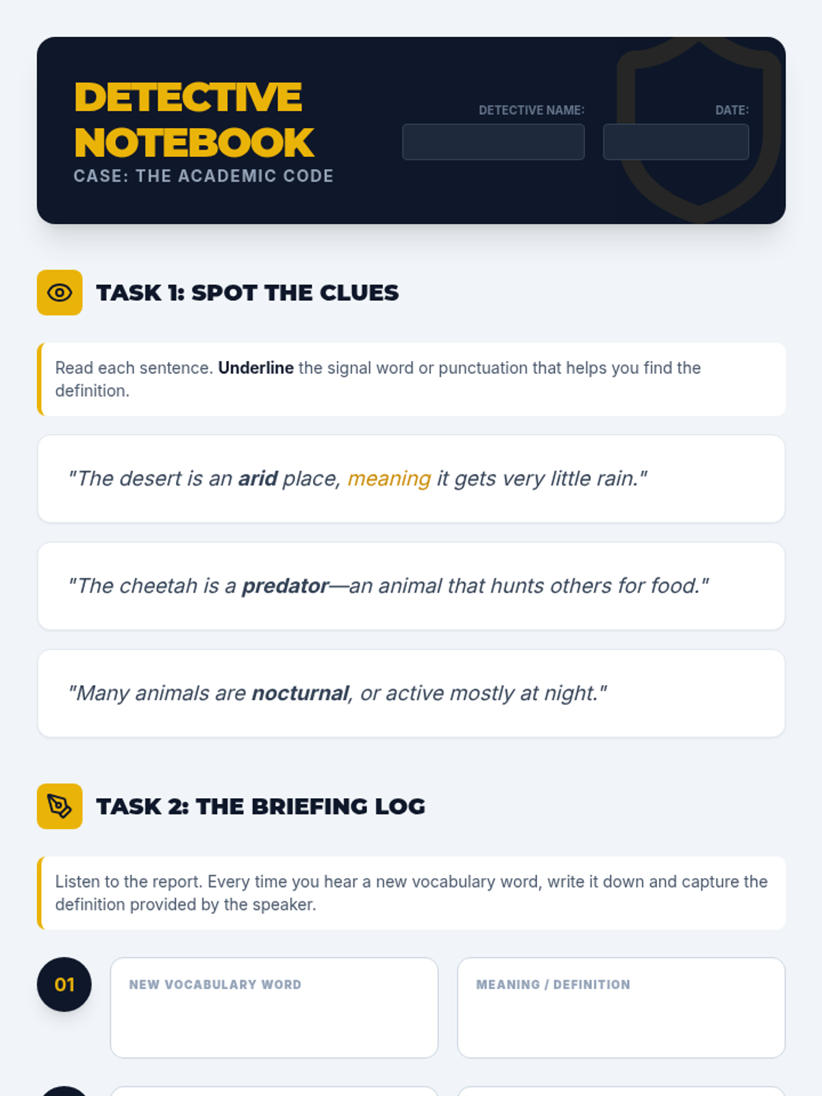A comprehensive unit for 4th Grade ESL learners to master academic listening. Students transition from social conversation to processing informational texts by identifying signal words, capturing vocabulary definitions in context, using graphic organizers, and distinguishing fact from opinion to synthesize complex information.