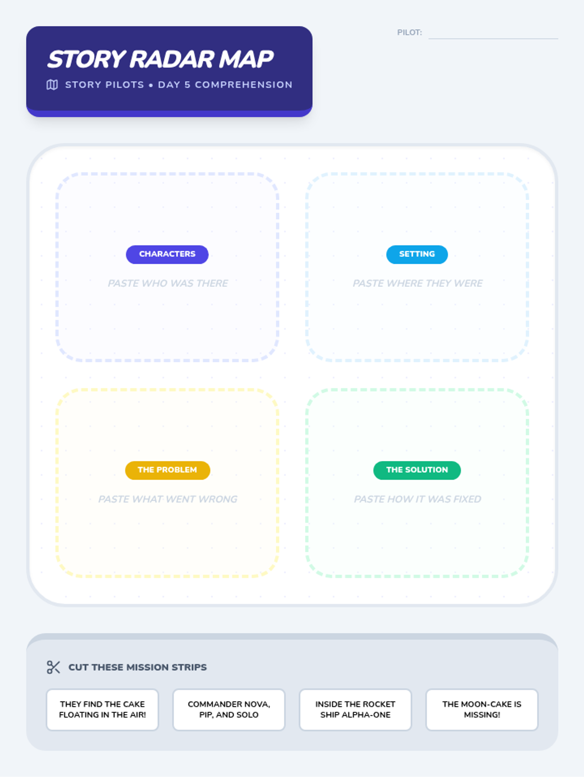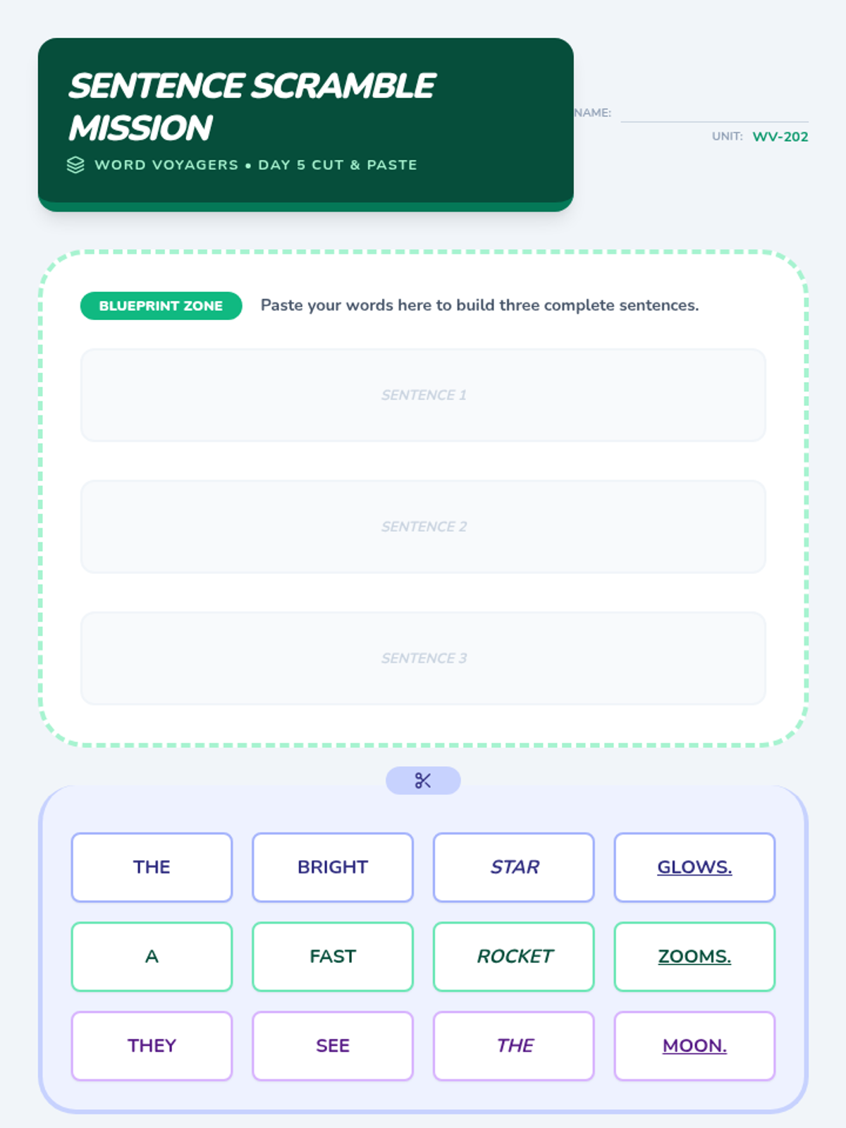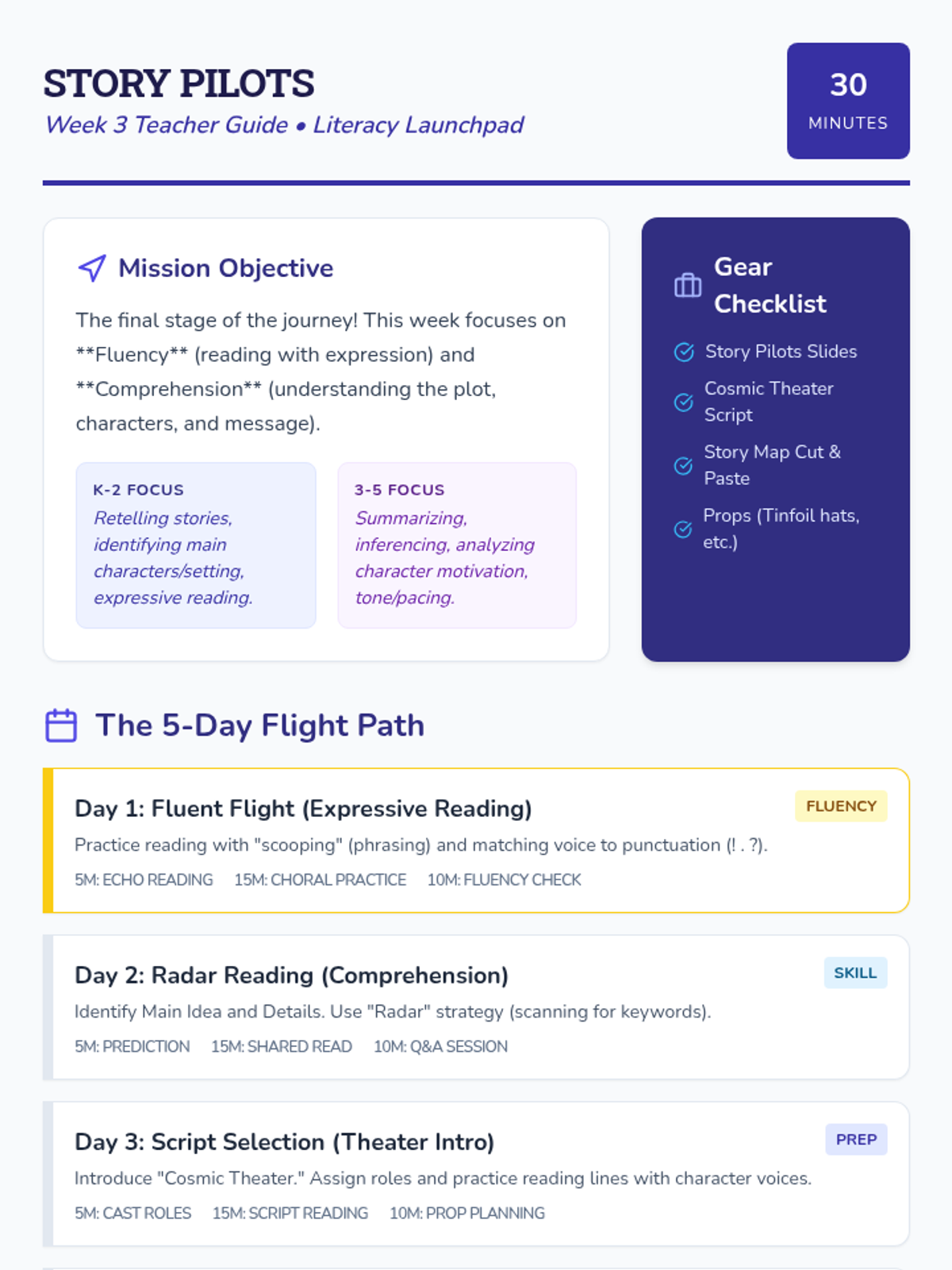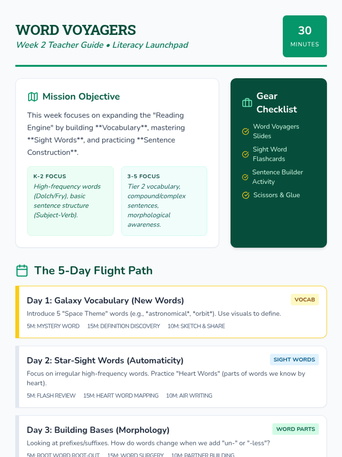 A 3-week literacy intervention program for grades K-5 focused on phonics, vocabulary, and comprehension with a space exploration theme. Each week features 30-minute daily sessions including interactive games and hands-on activities.
