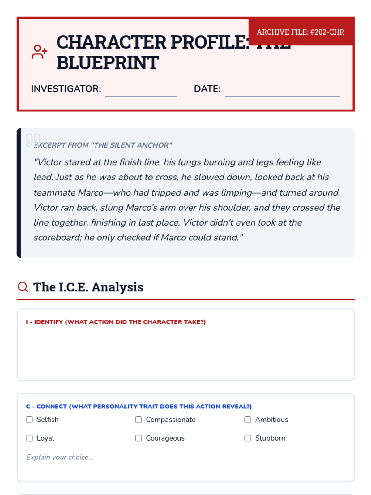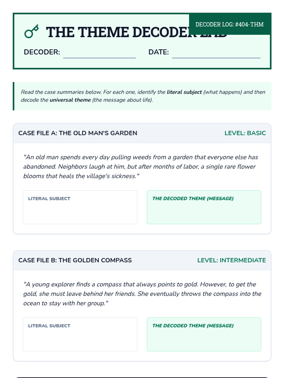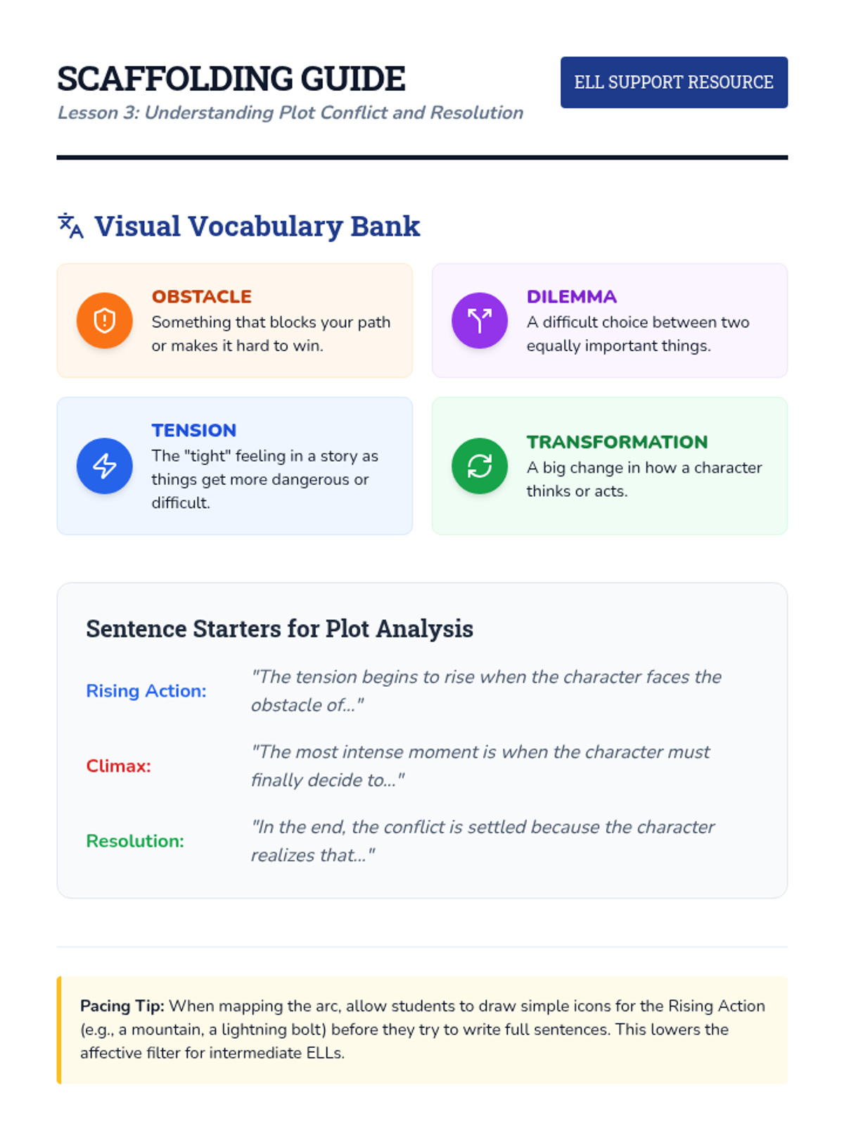 A 5-lesson sequence for 11th-grade ELL students focused on deep reading comprehension. Students will master inferencing, character motivation, plot structure, and theme identification through a 'Literary Detective' lens, culminating in student-led literature circles.