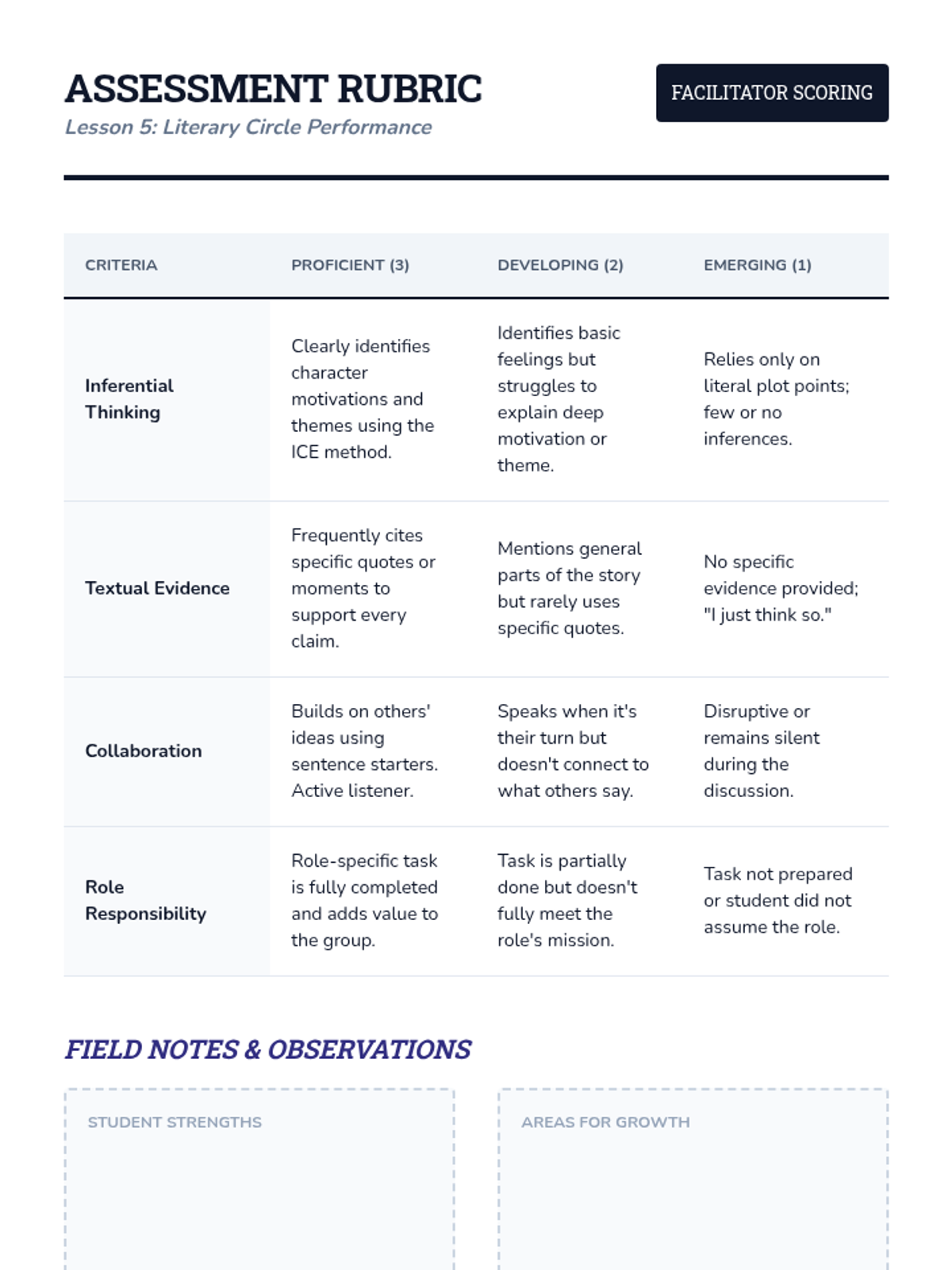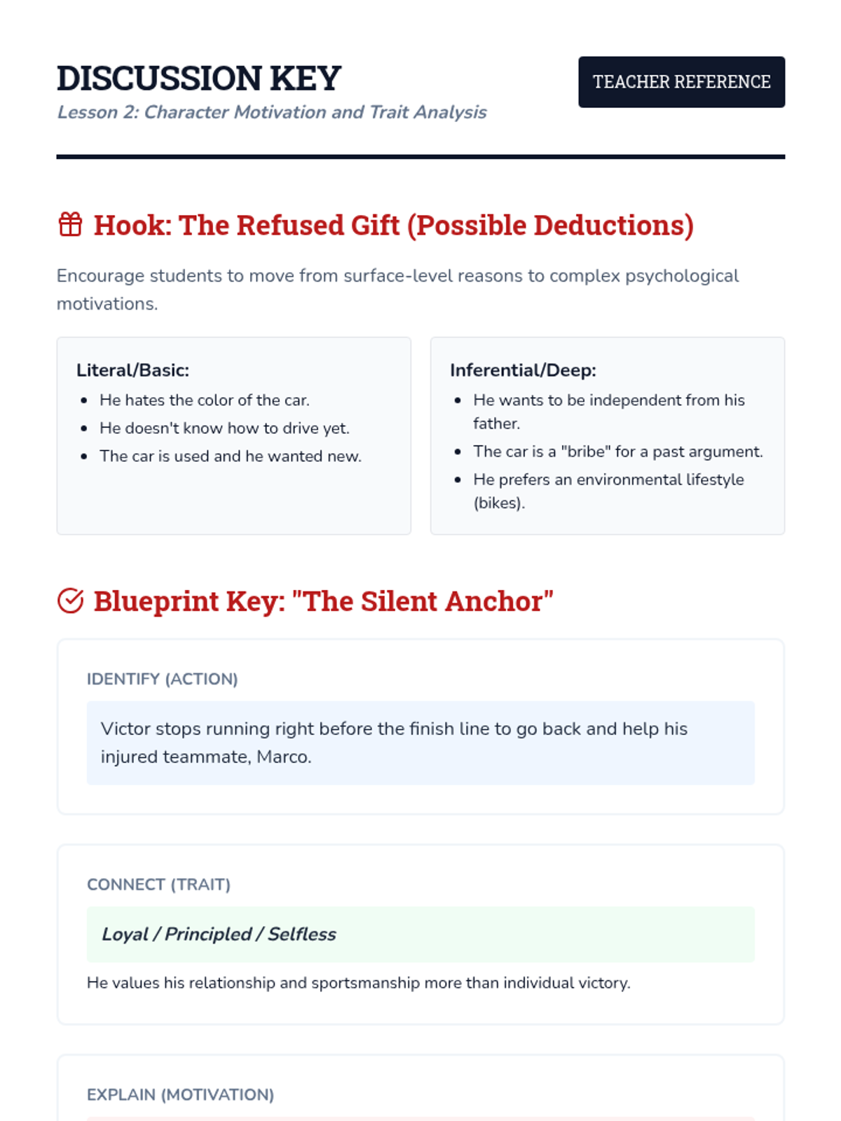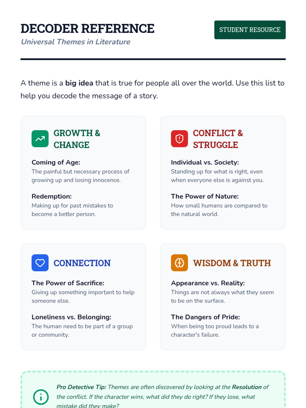 A 5-lesson sequence for 11th-grade ELL students focused on deep reading comprehension. Students will master inferencing, character motivation, plot structure, and theme identification through a 'Literary Detective' lens, culminating in student-led literature circles.