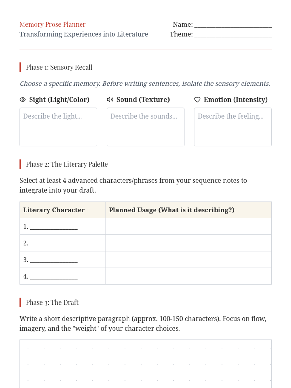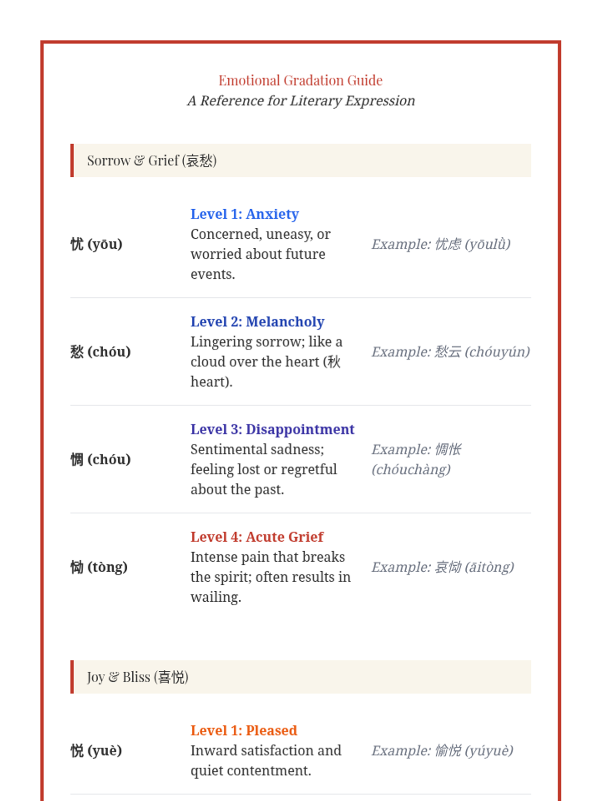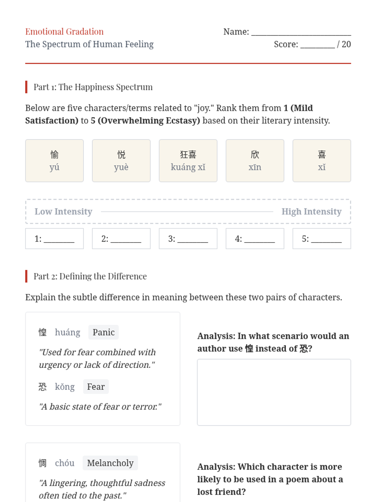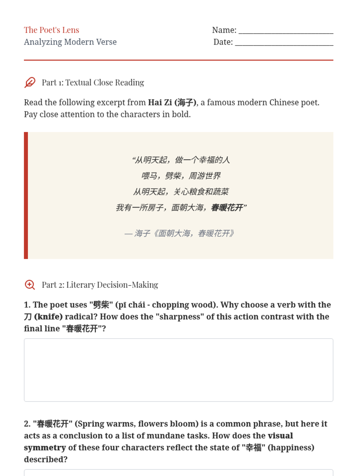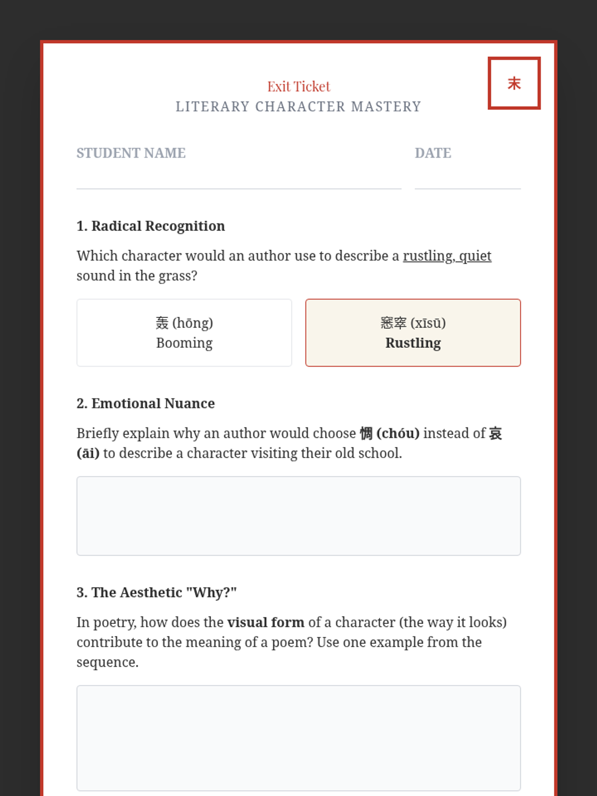 A high-school level sequence focusing on the literary and aesthetic use of advanced Mandarin Chinese characters. Students explore sensory prose, emotional nuance, landscape imagery, and modern poetry to enhance their descriptive writing and reading comprehension.