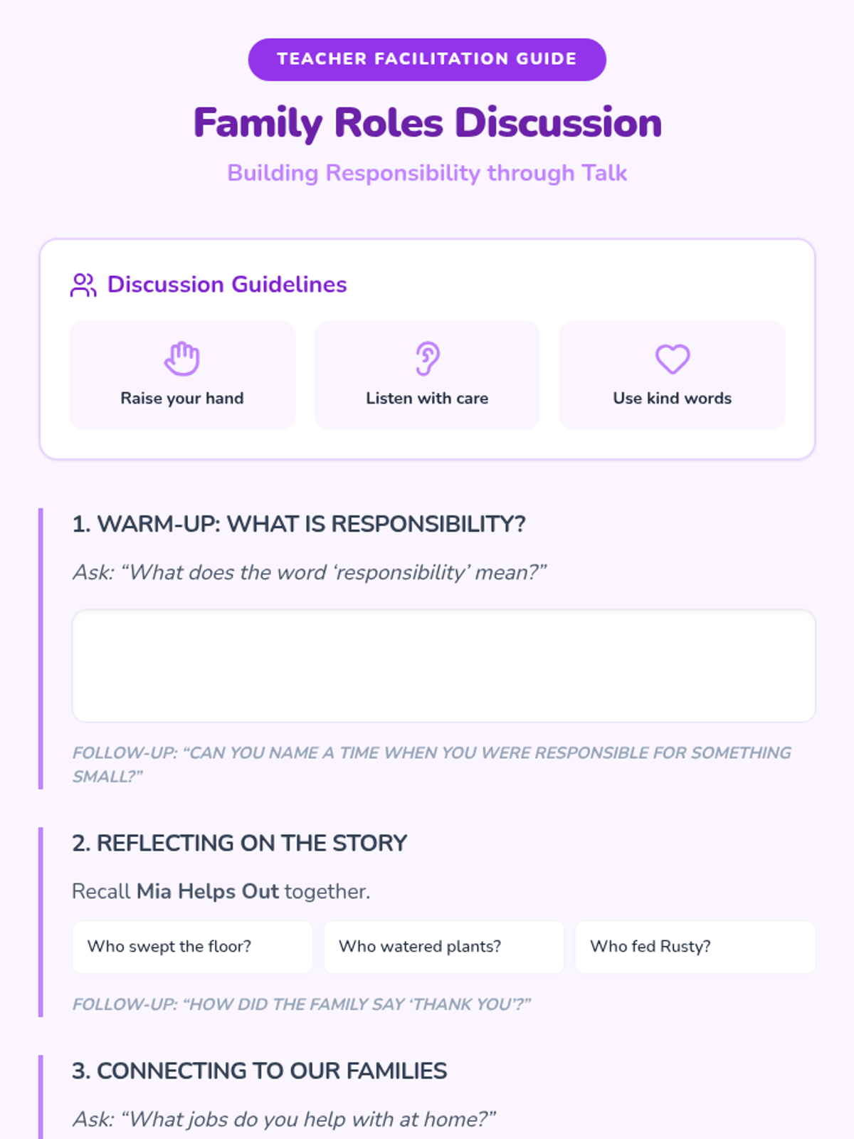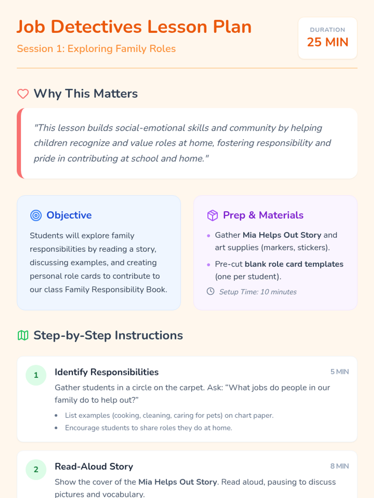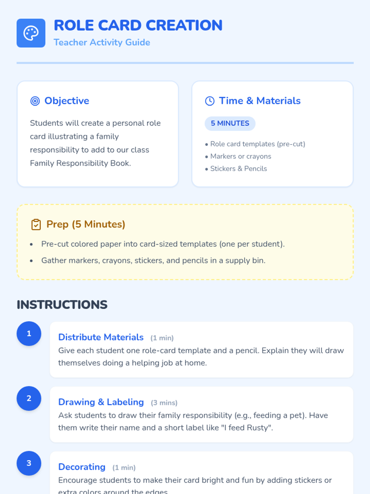 A two-session sequence for kindergarteners focused on understanding and practicing family responsibilities. Students create personal role cards and play matching games to build social-emotional skills and a sense of community.