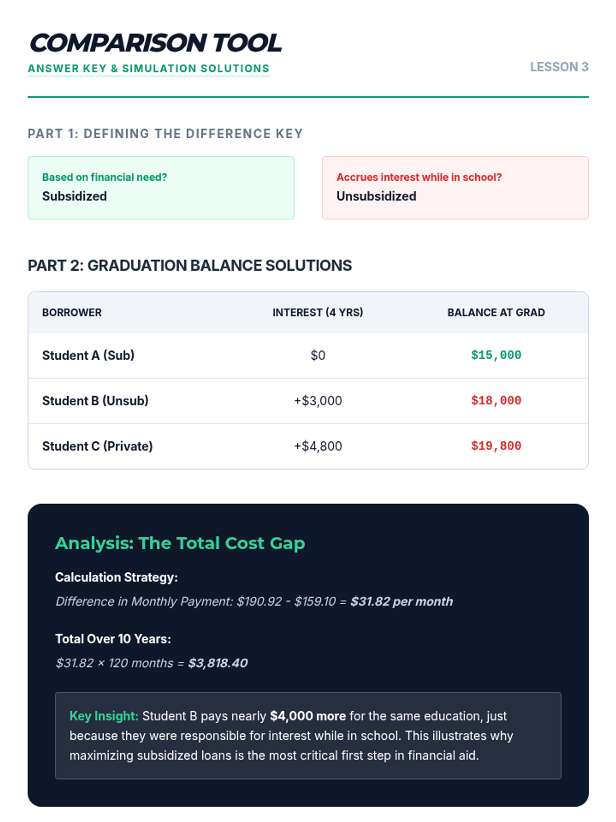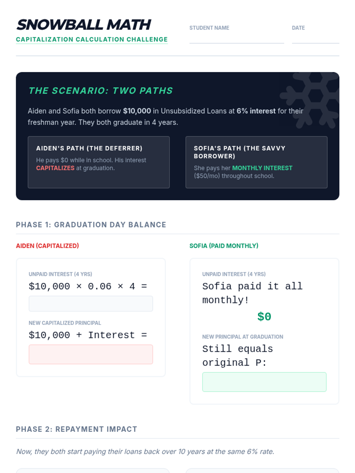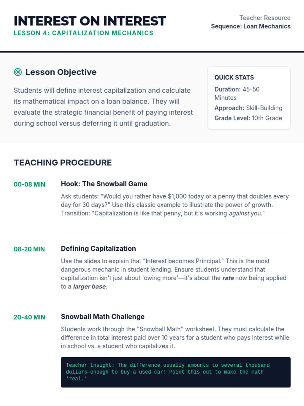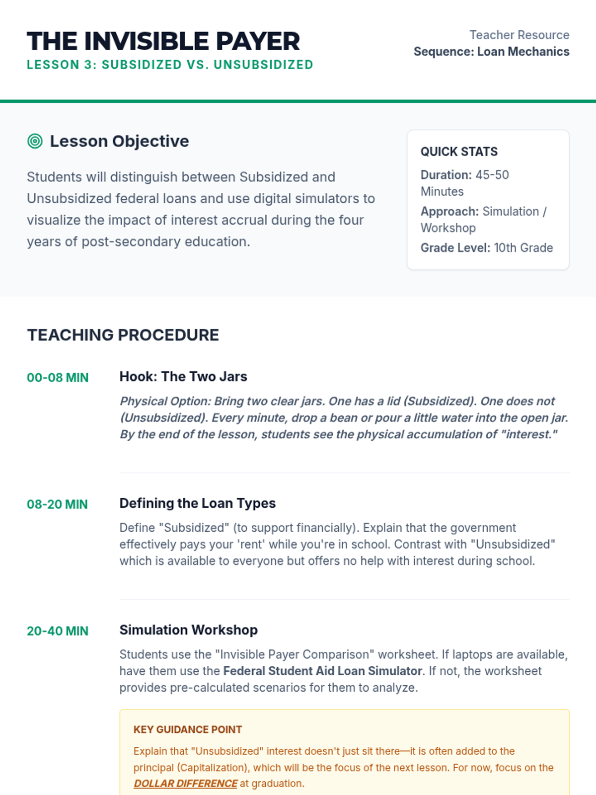 This sequence immerses students in the mechanics of borrowing money, focusing specifically on the distinctions between federal and private lending. Students begin by understanding the fundamental concepts of principal, interest, and capitalization before diving into the specific terms of Subsidized and Unsubsidized Direct Loans.