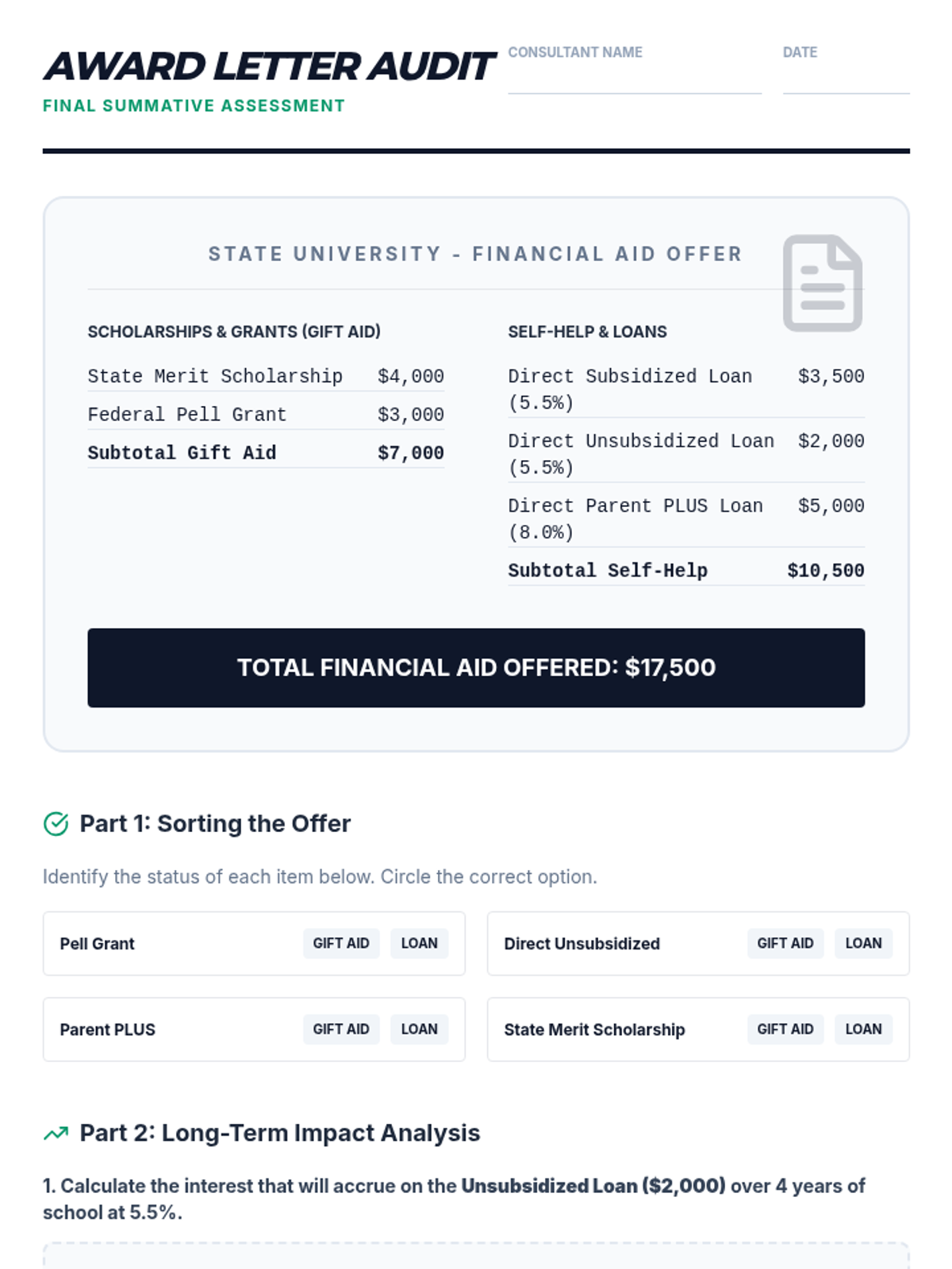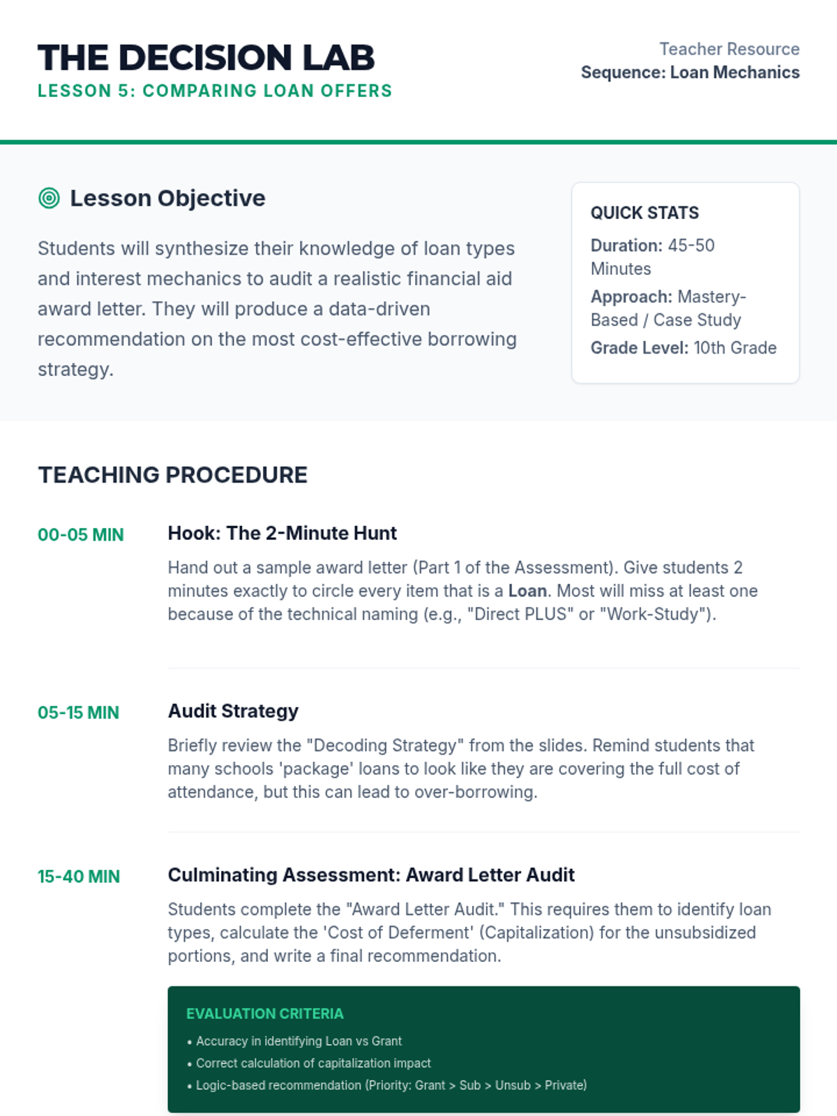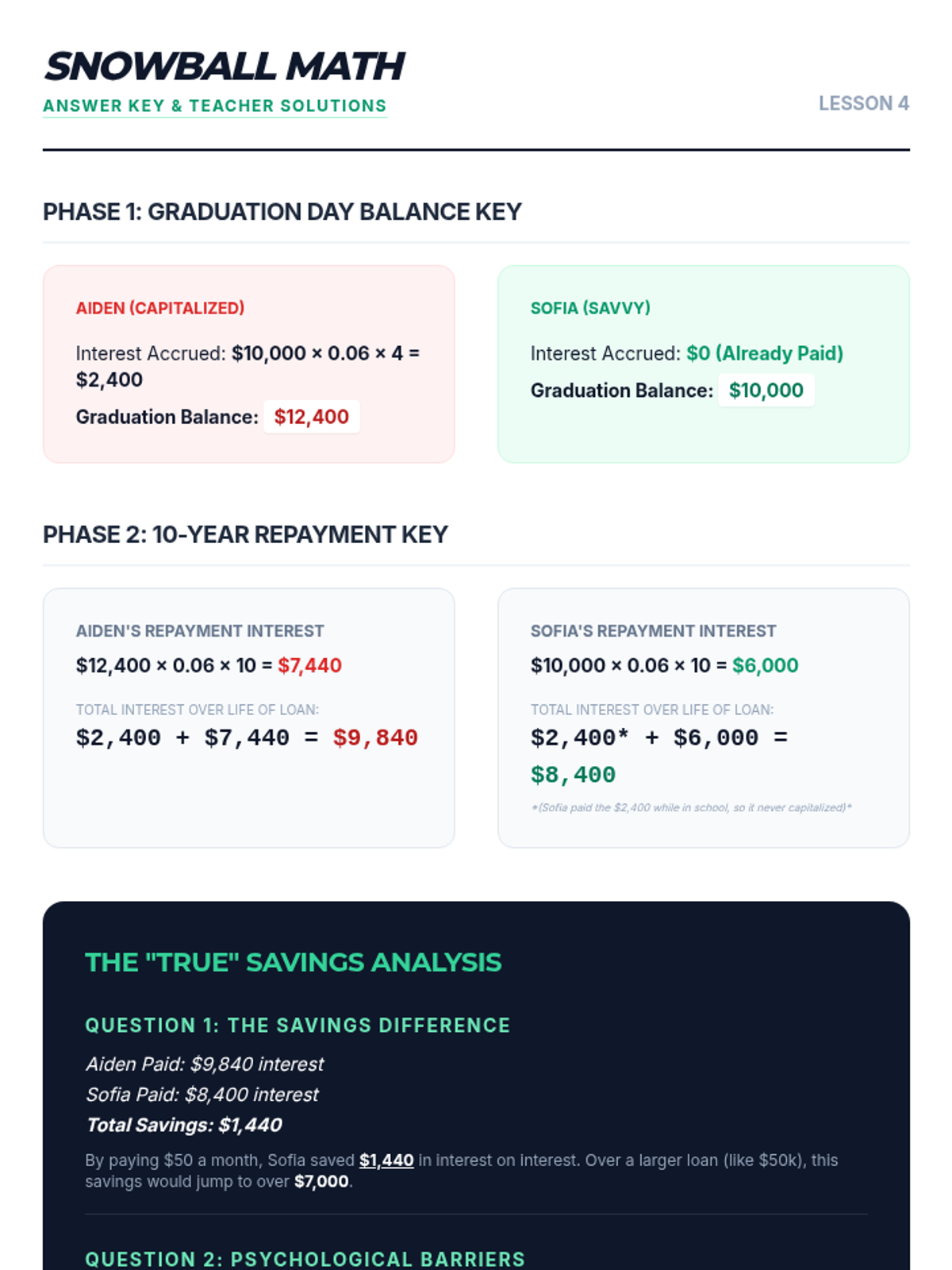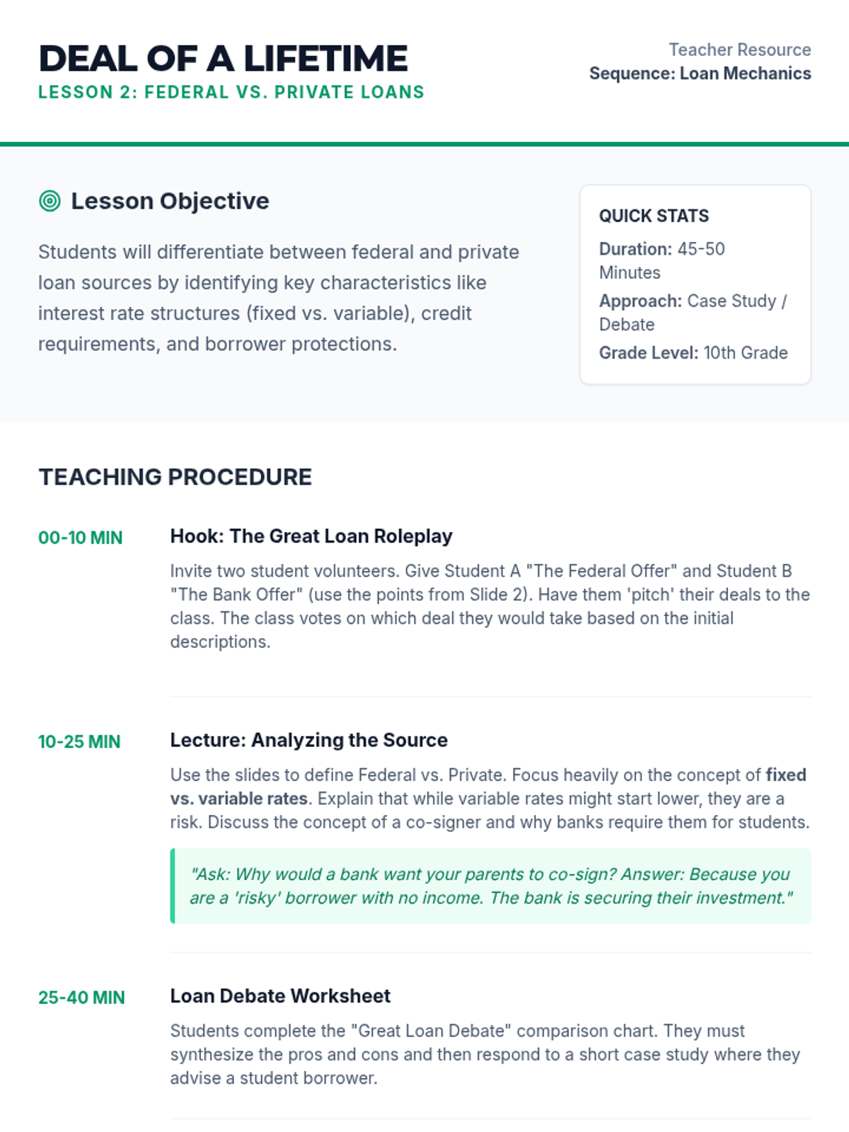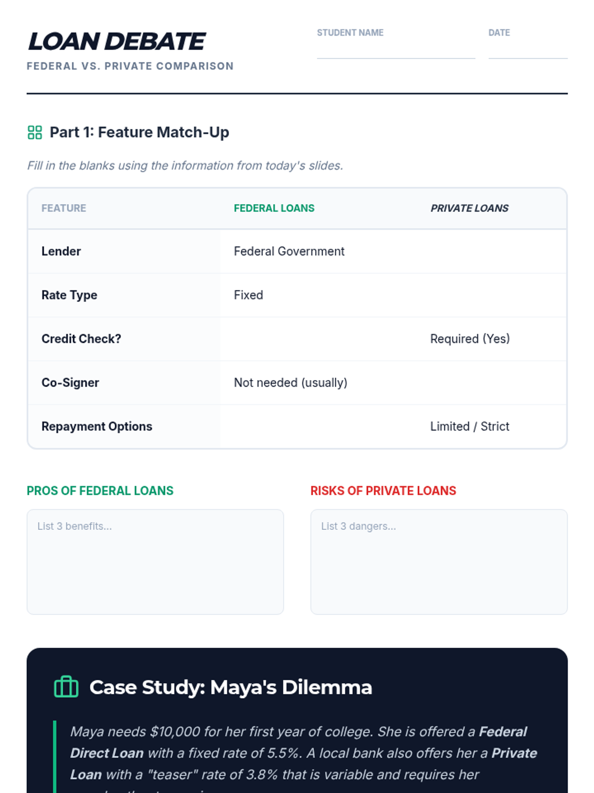 This sequence immerses students in the mechanics of borrowing money, focusing specifically on the distinctions between federal and private lending. Students begin by understanding the fundamental concepts of principal, interest, and capitalization before diving into the specific terms of Subsidized and Unsubsidized Direct Loans.